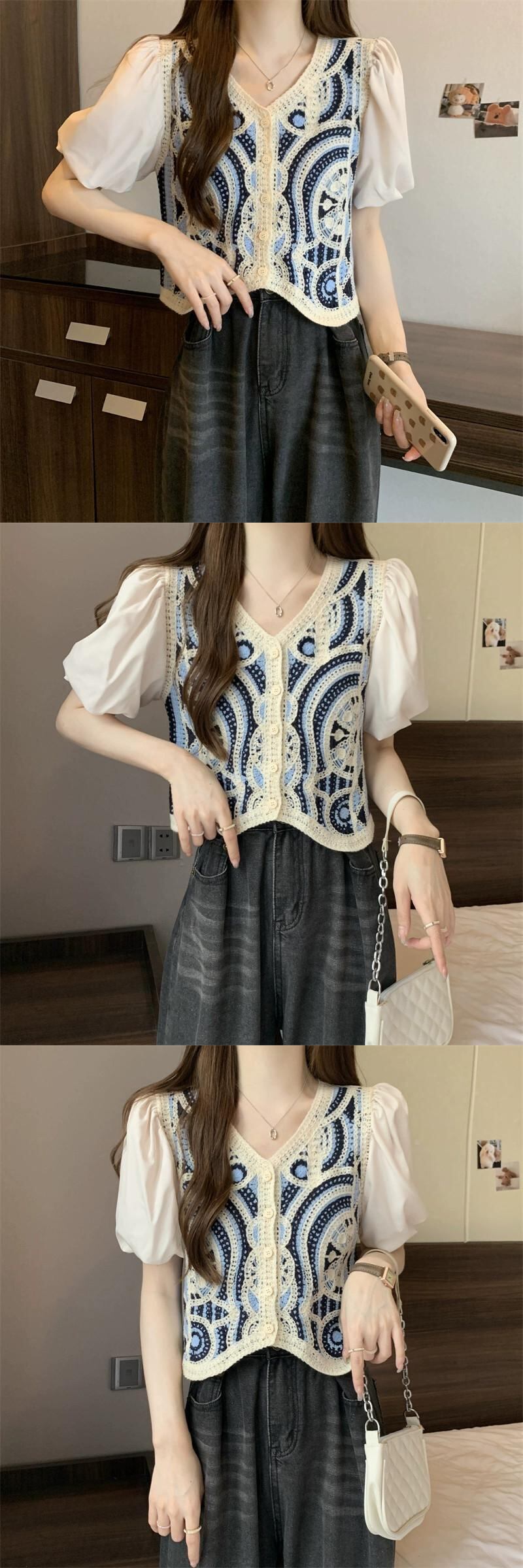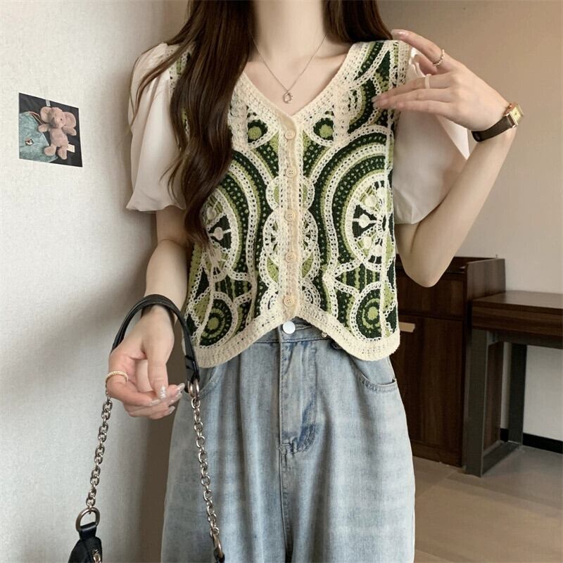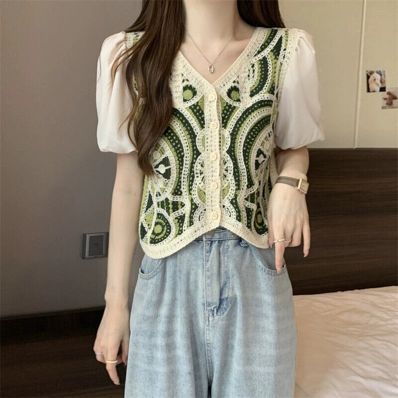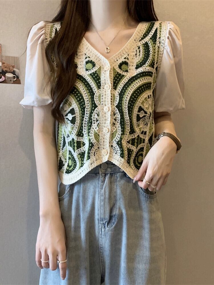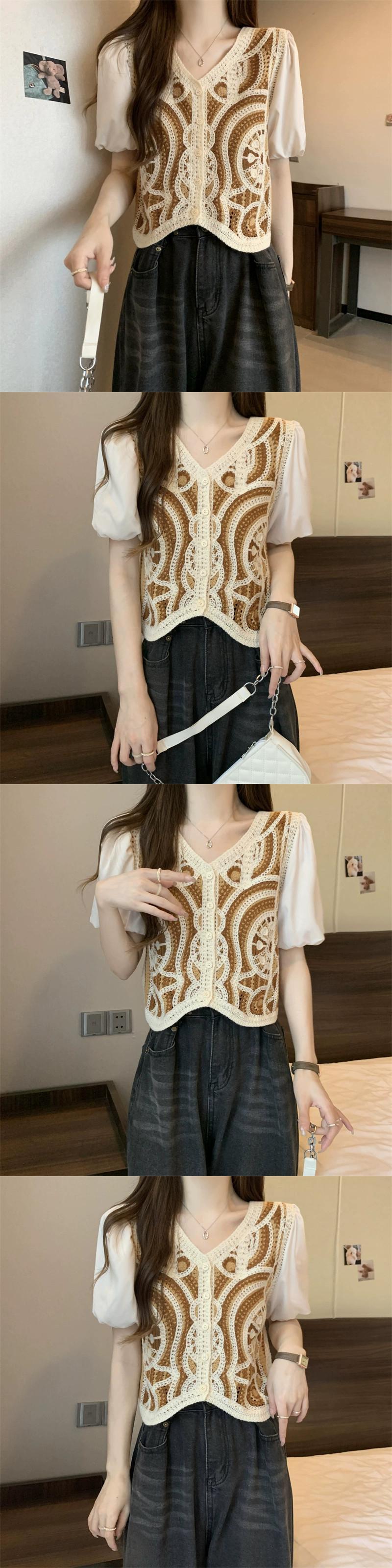 不規則な半袖シャツの女性の夏フレンチデザイン中空フックフラワーシャツショートパフスリーブ V ネックトップ サマー 夏物 Vネック フラワーデザイン 7460038950523886 | framboise21