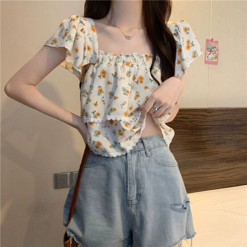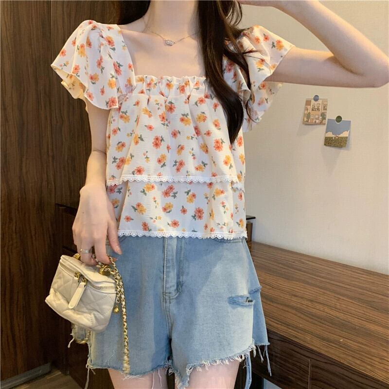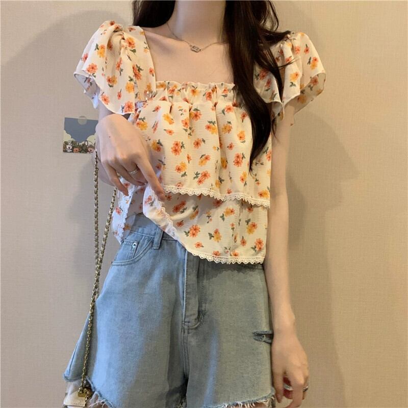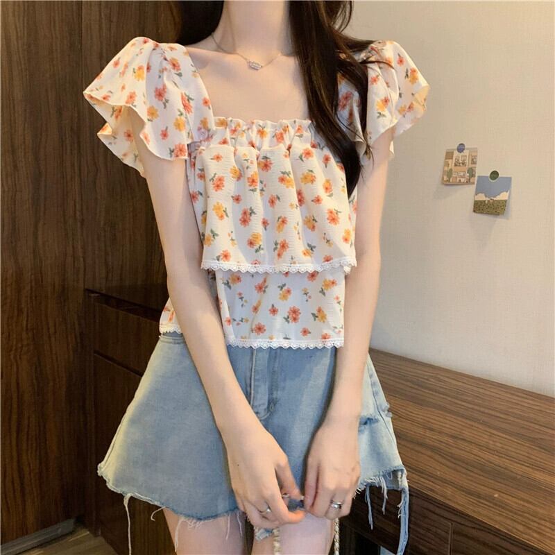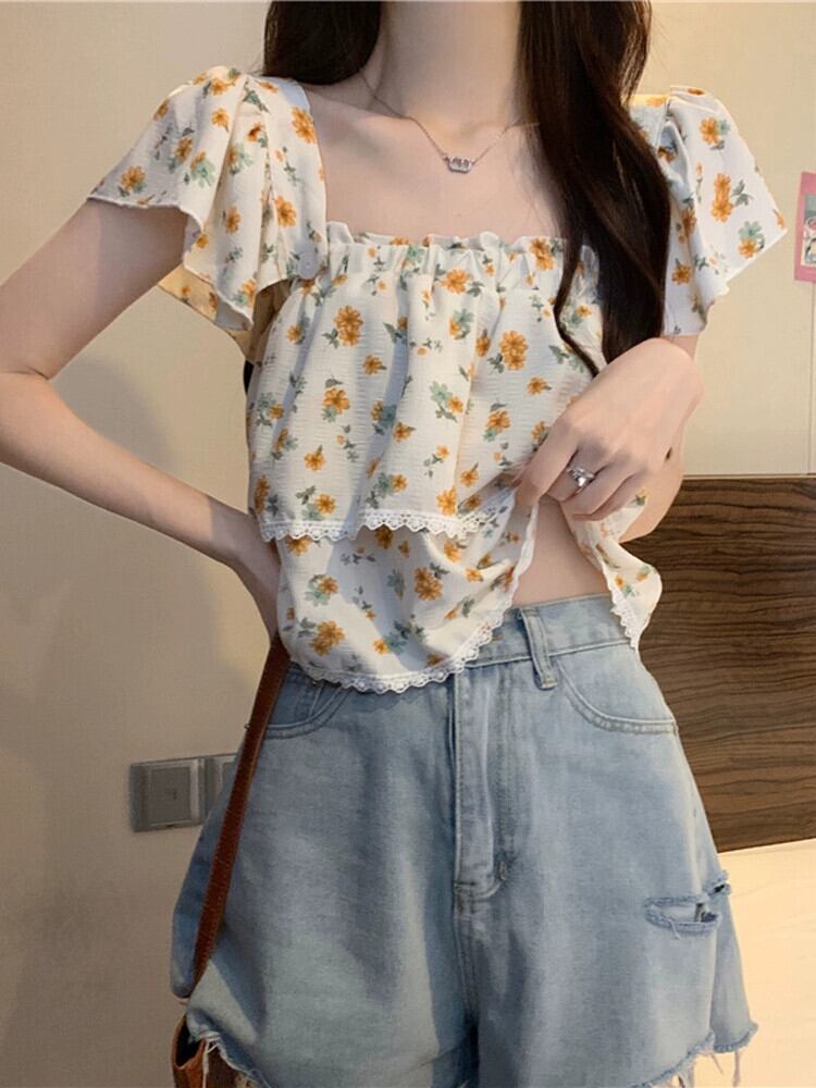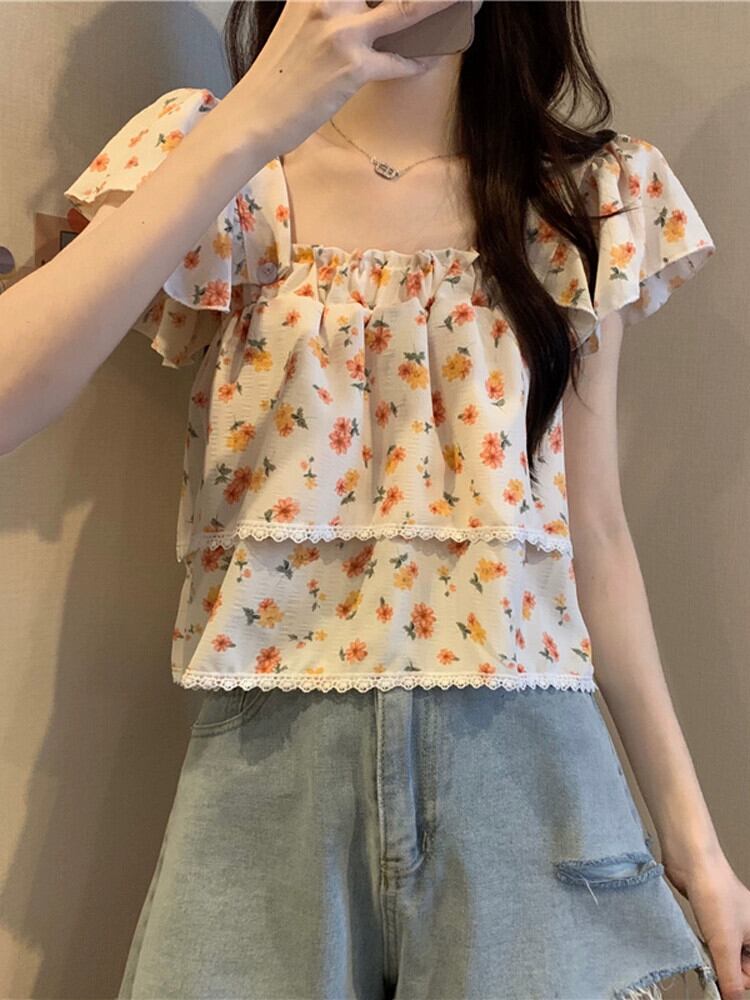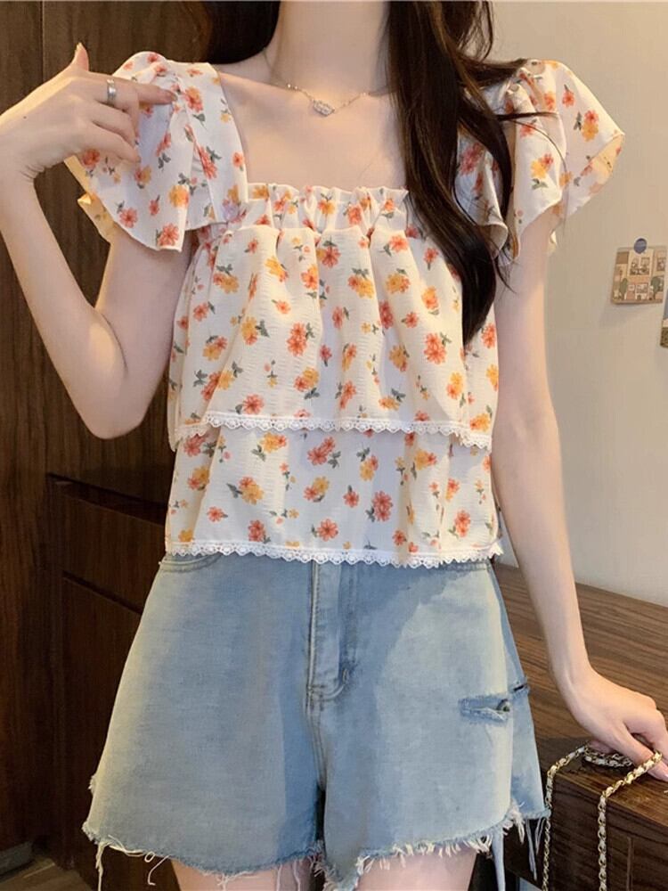フレンチフローラル半袖シャツレディース夏レトロデザイン感覚ルーズオールマッチハイウエストショート小フライングスリーブスクエアカラートップ ハイウェスト サマー 夏物 花柄 スクウェア 7460060254005698 | framboise21