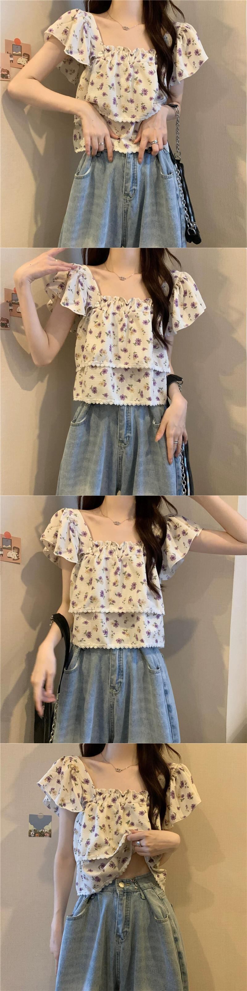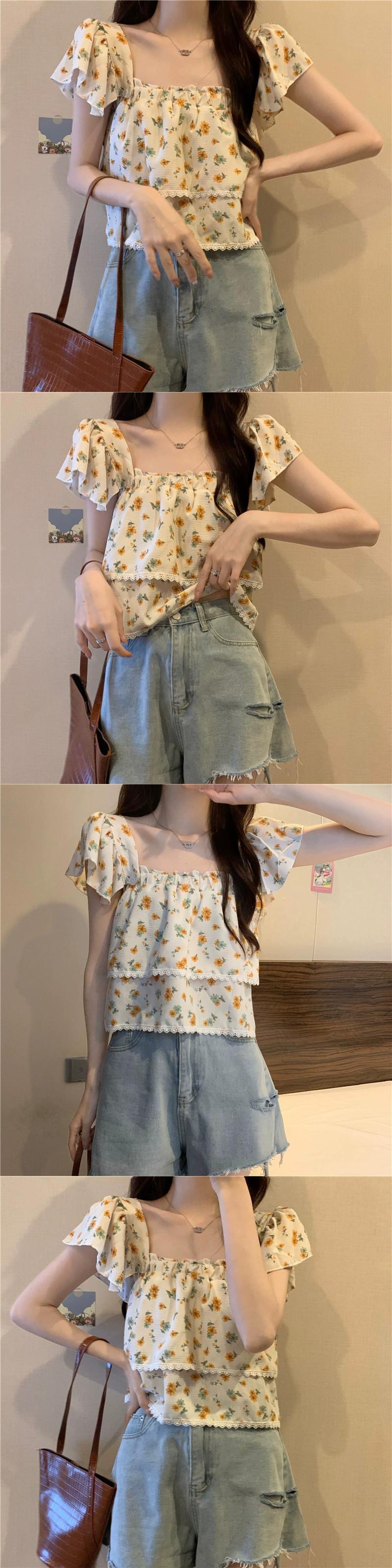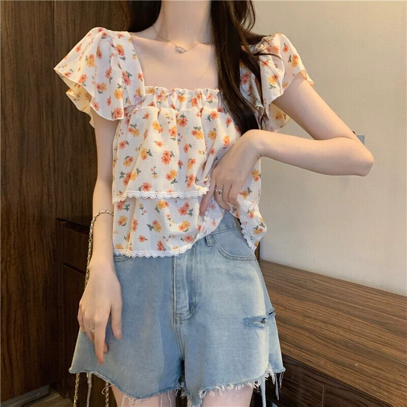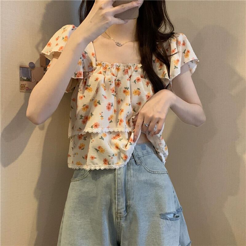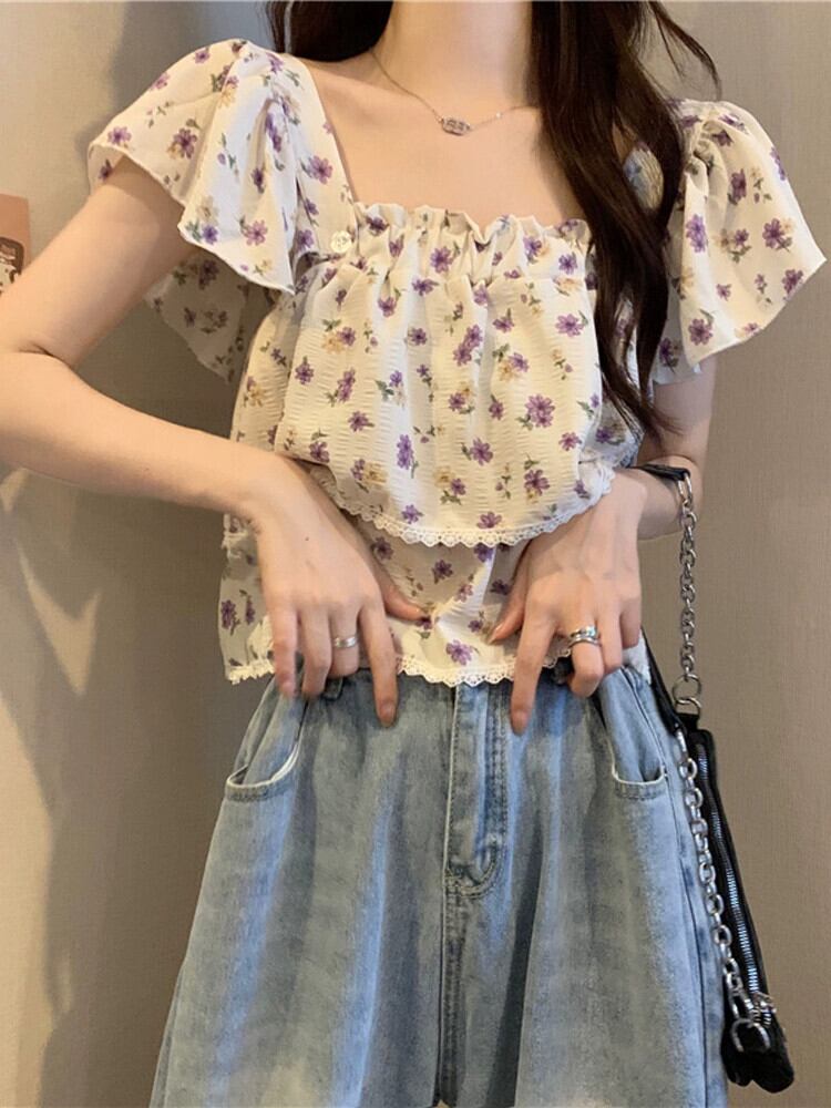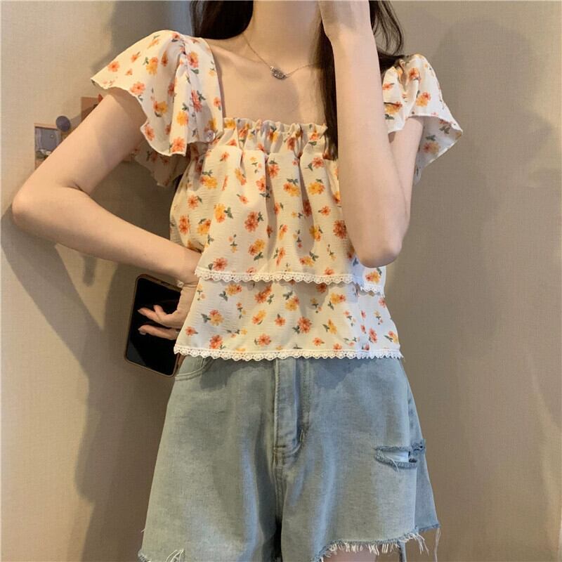 フレンチフローラル半袖シャツレディース夏レトロデザイン感覚ルーズオールマッチハイウエストショート小フライングスリーブスクエアカラートップ ハイウェスト サマー 夏物 花柄 スクウェア 7460060254005698 | framboise21