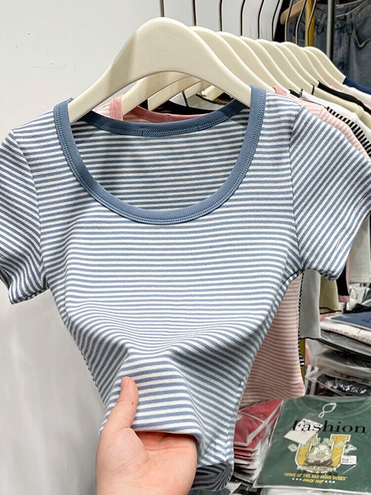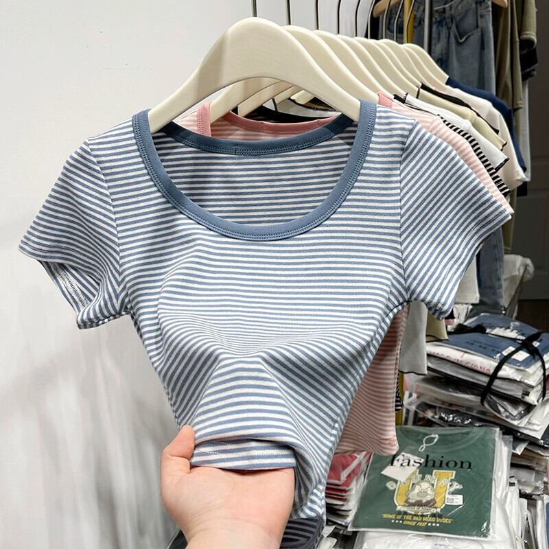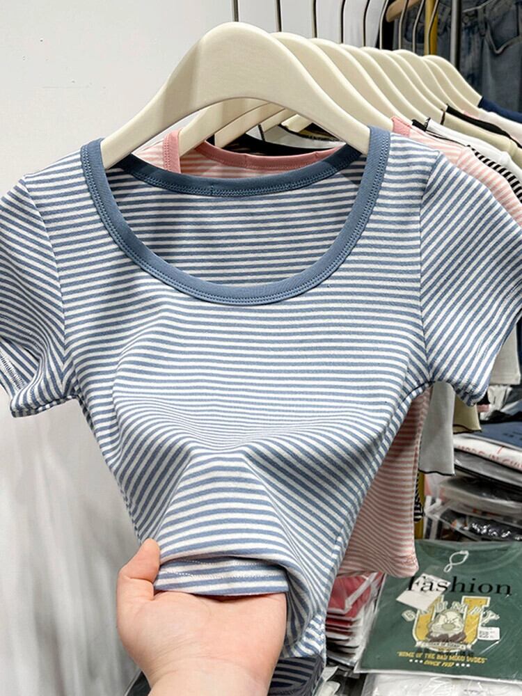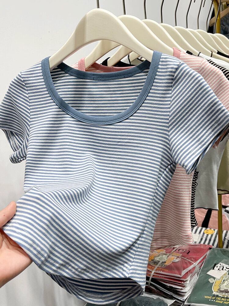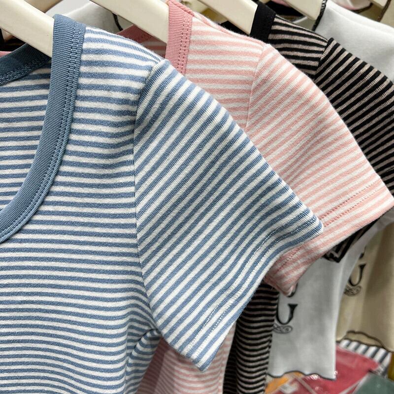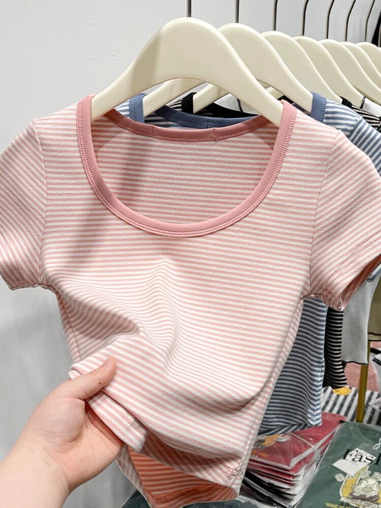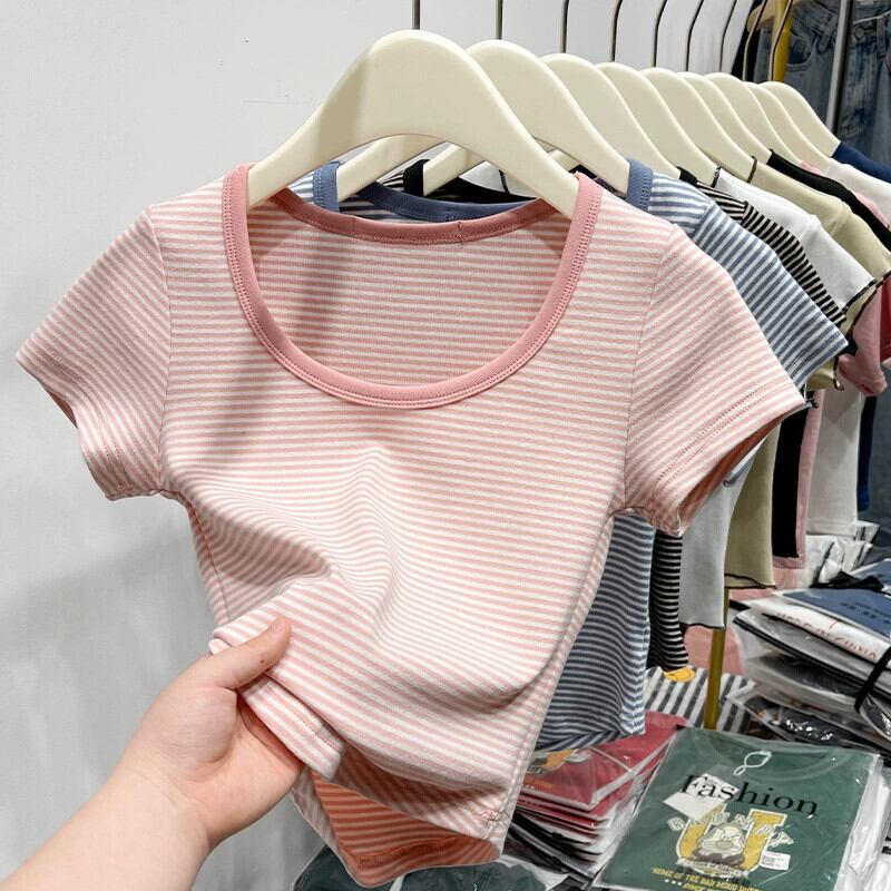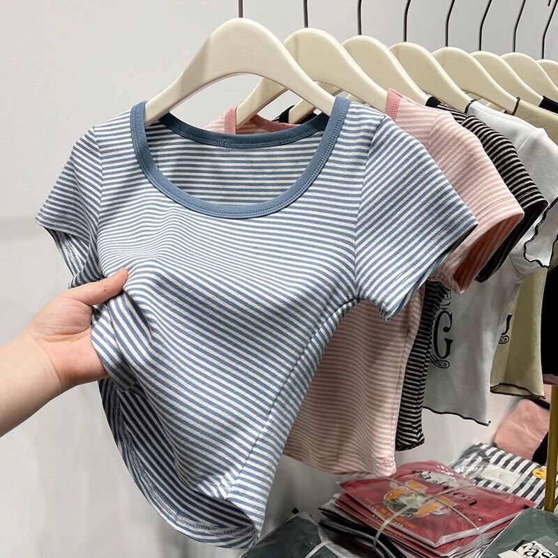 ピンクフロントショルダーストライプ半袖Tシャツレディース夏デザインセンスファッションスリム小男オールマッチ純綿ラウンドネックトップ コットン サマー 夏物 Oネック ピュア 746002031031478 | framboise21