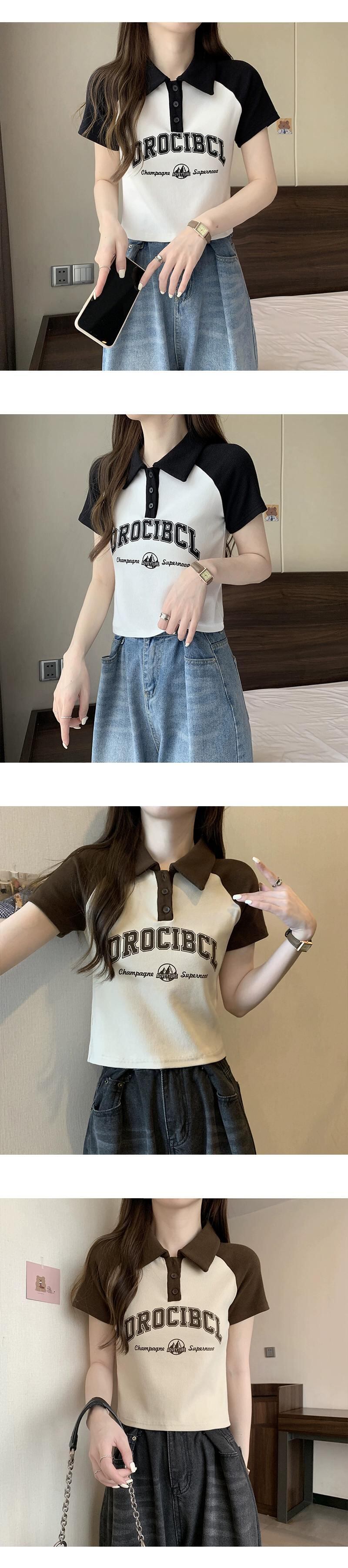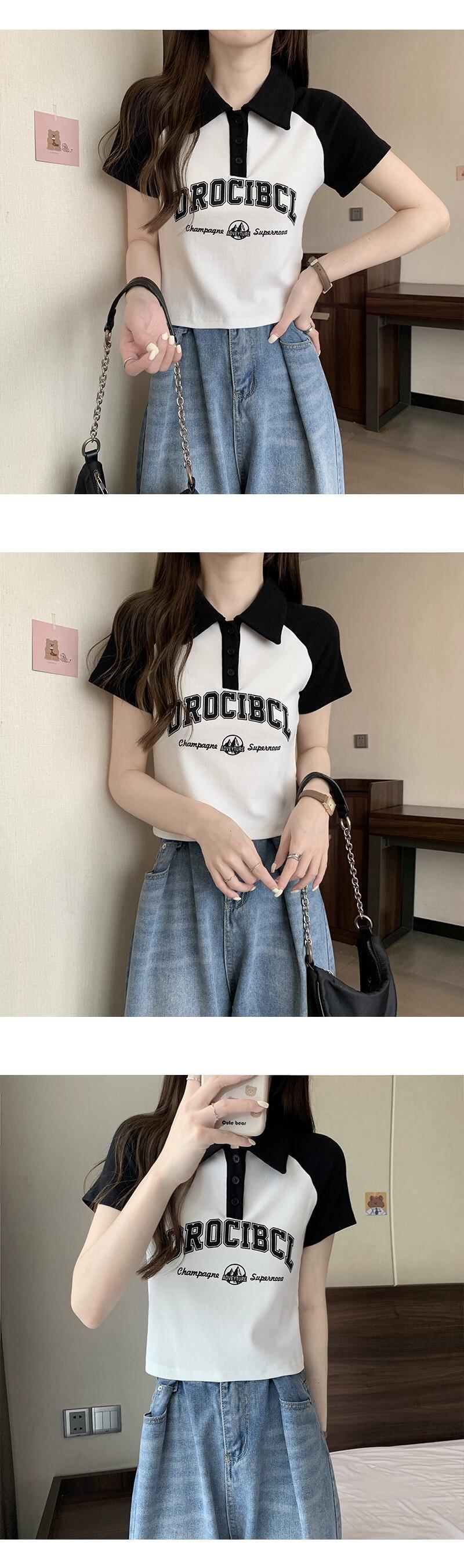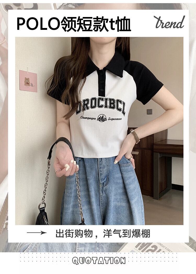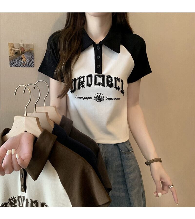 アメリカ綿フロントショルダーラグランスリーブTシャツレディース夏レトロデザインセンスコントラストカラー半袖ポロシャツショートトップ コットン サマー 夏物 7460055960246366 | framboise21