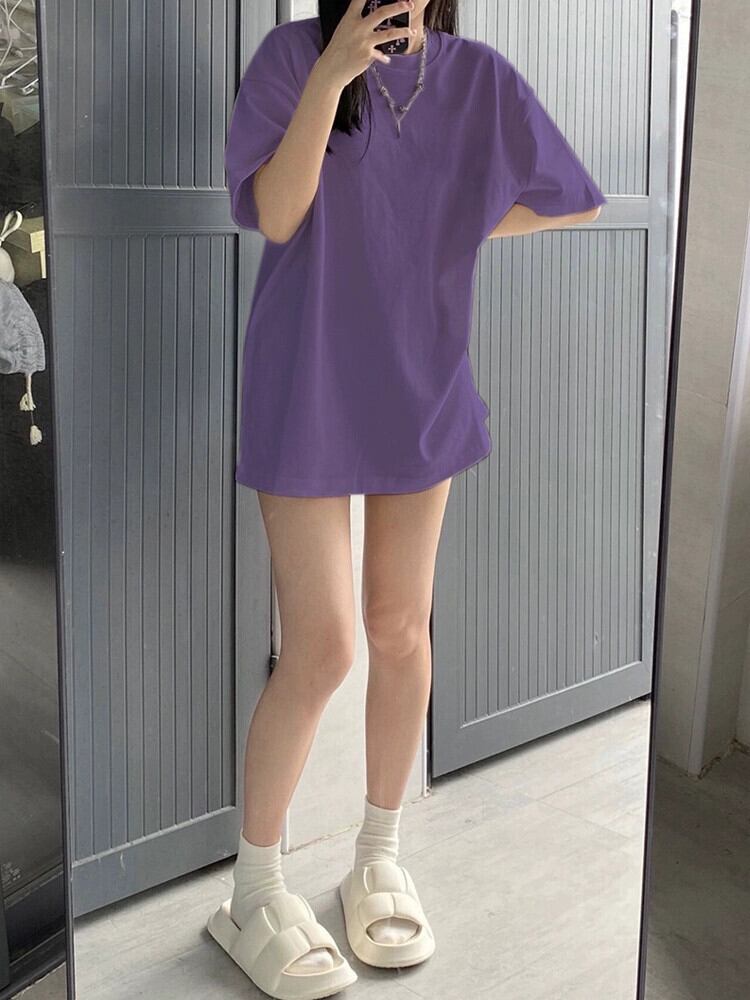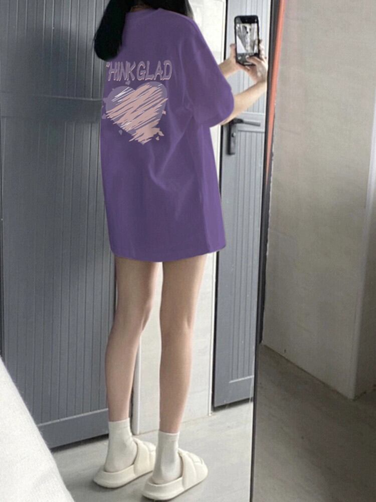 パープルドロップショルダーピュアコットン半袖Tシャツレディース夏のファッショントレンドオーバーサイズオールマッチミッドレングスプリントトップ サマー 夏物 7460049218429692 | framboise21