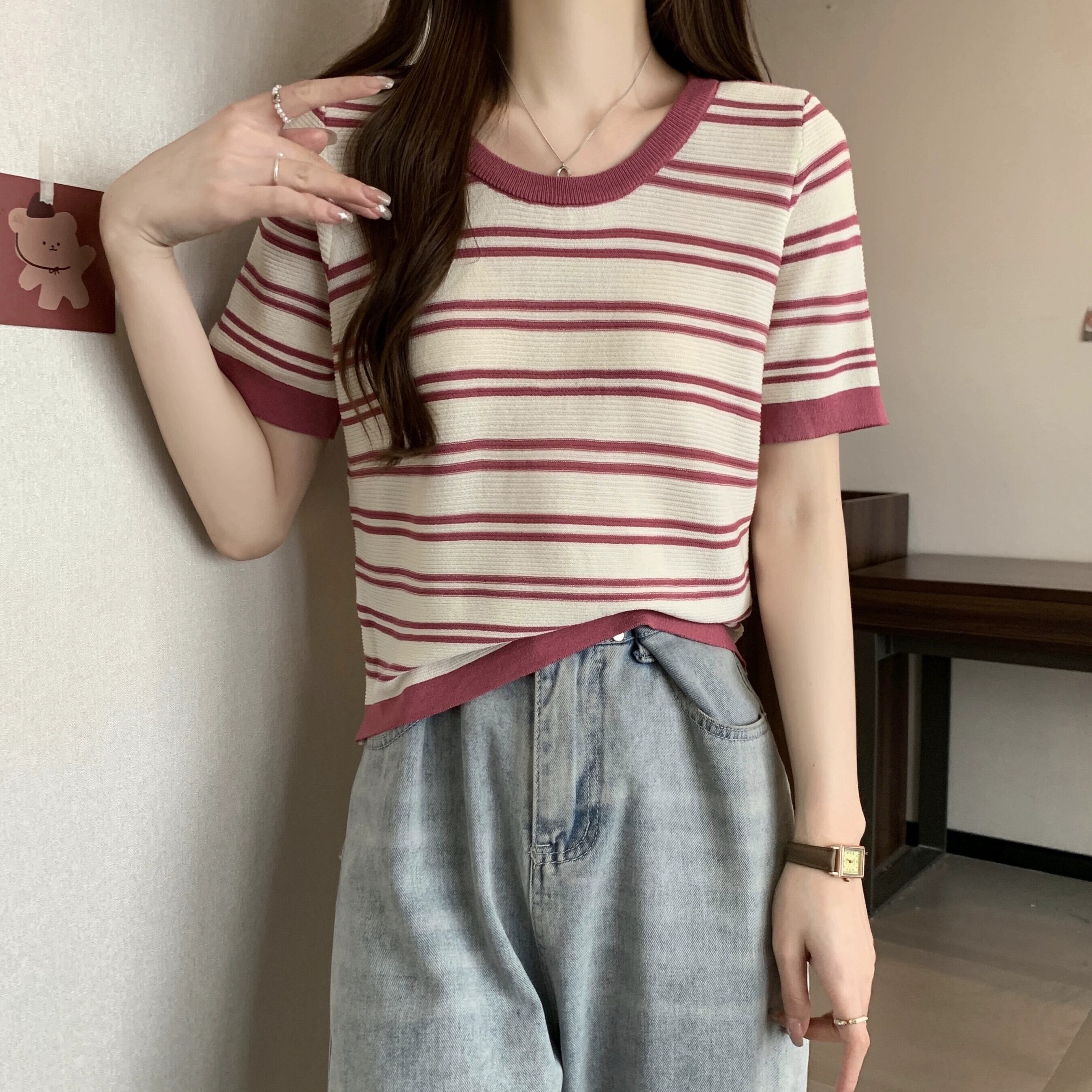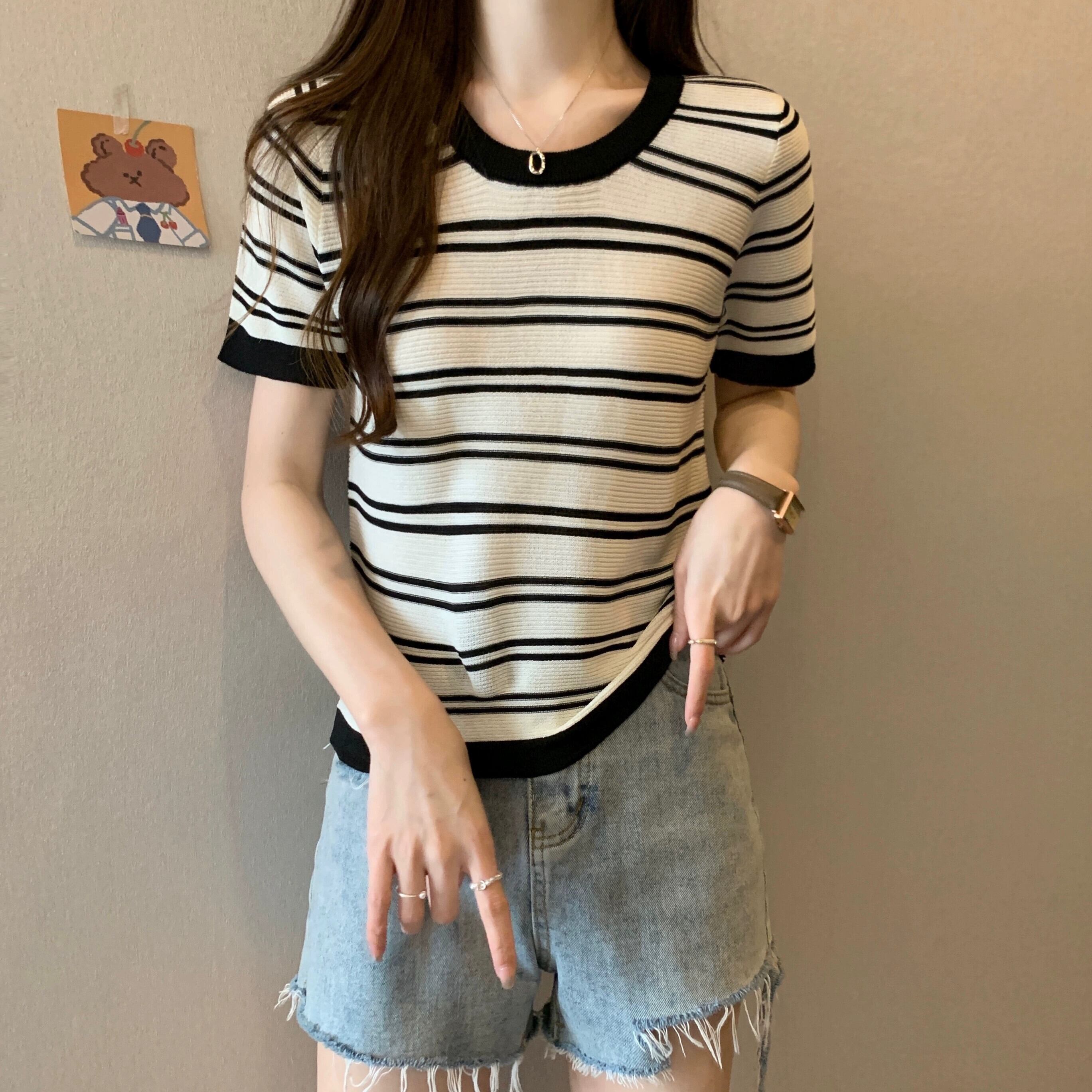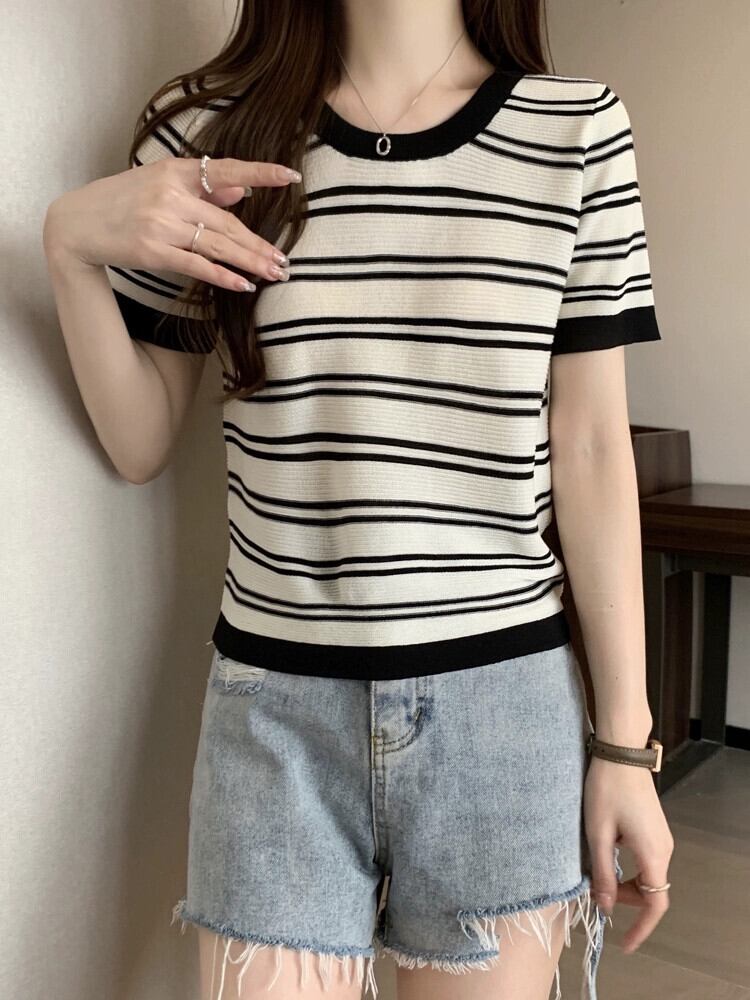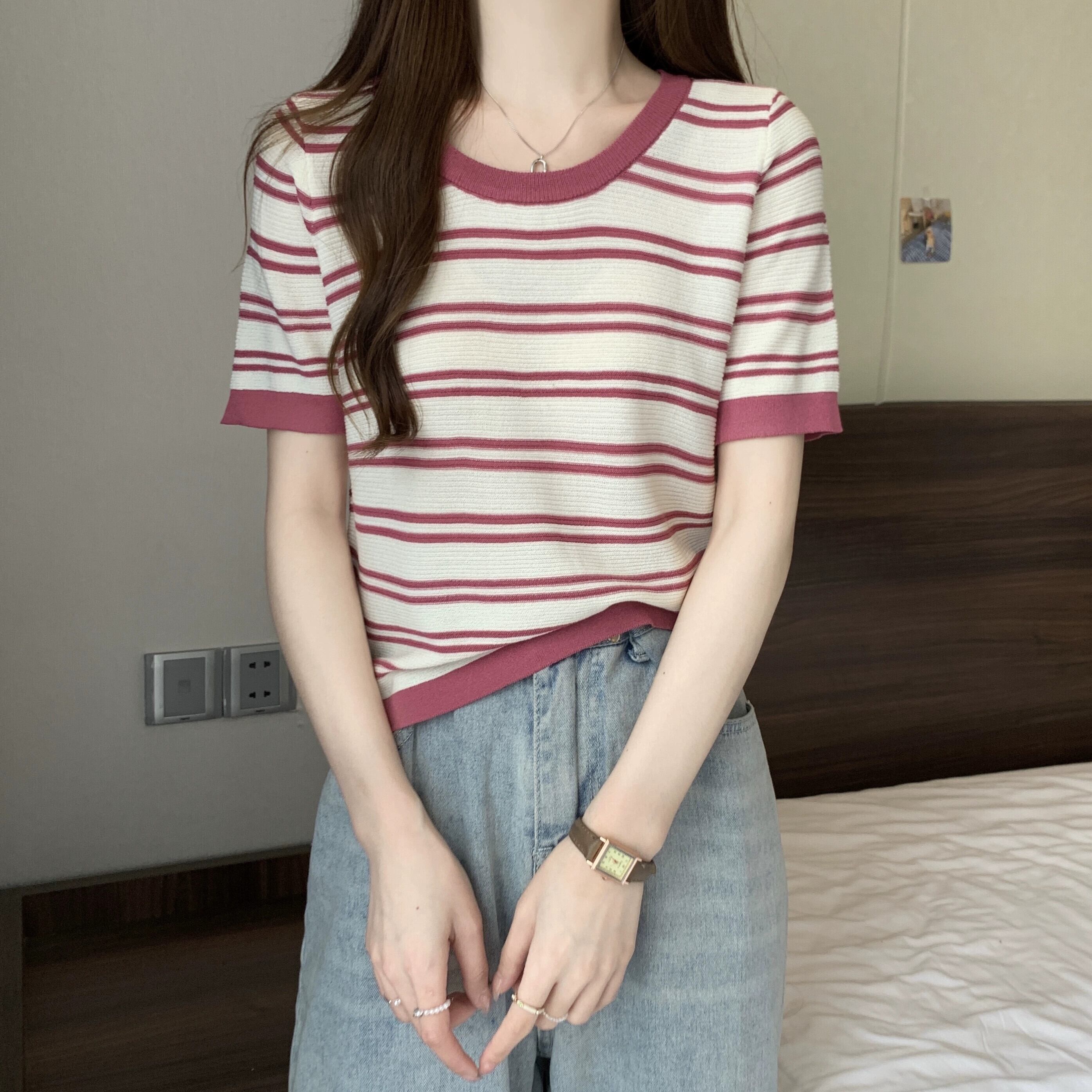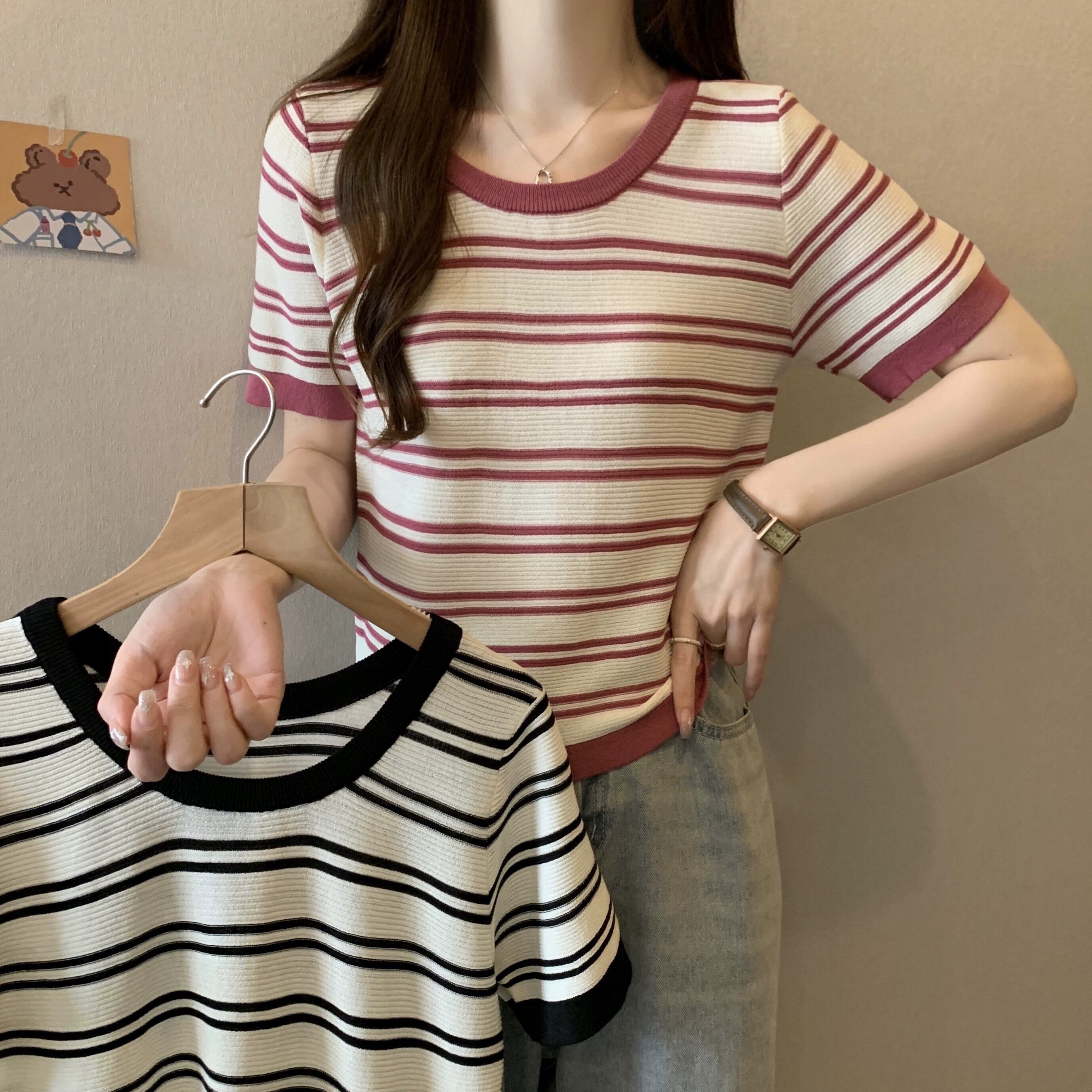 薄いストライプニット半袖Tシャツレディース夏ニッチデザインセンスルーズオールマッチアイスシルクショートカラーコントラストトップ サマー 夏物 7460038097741713 | framboise21