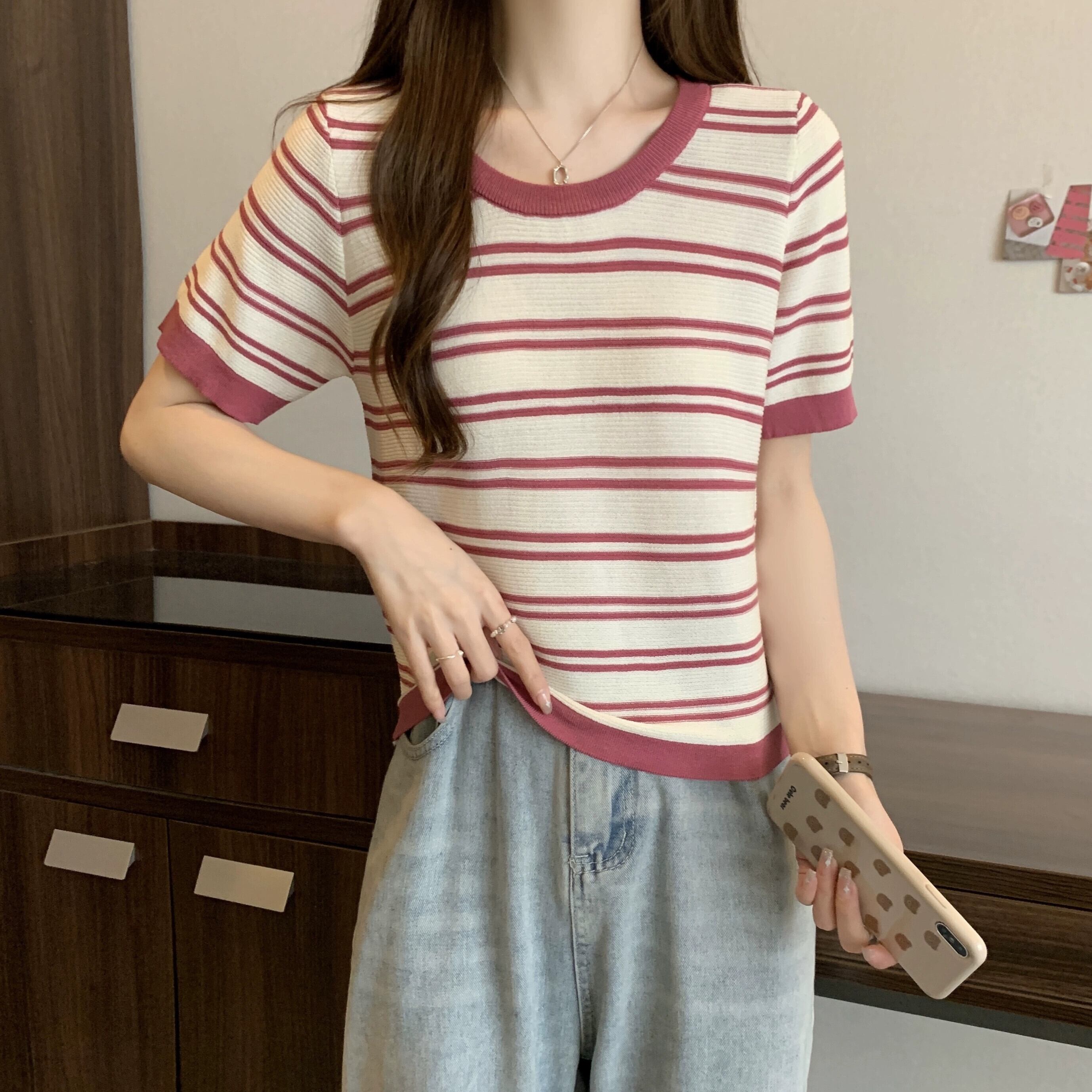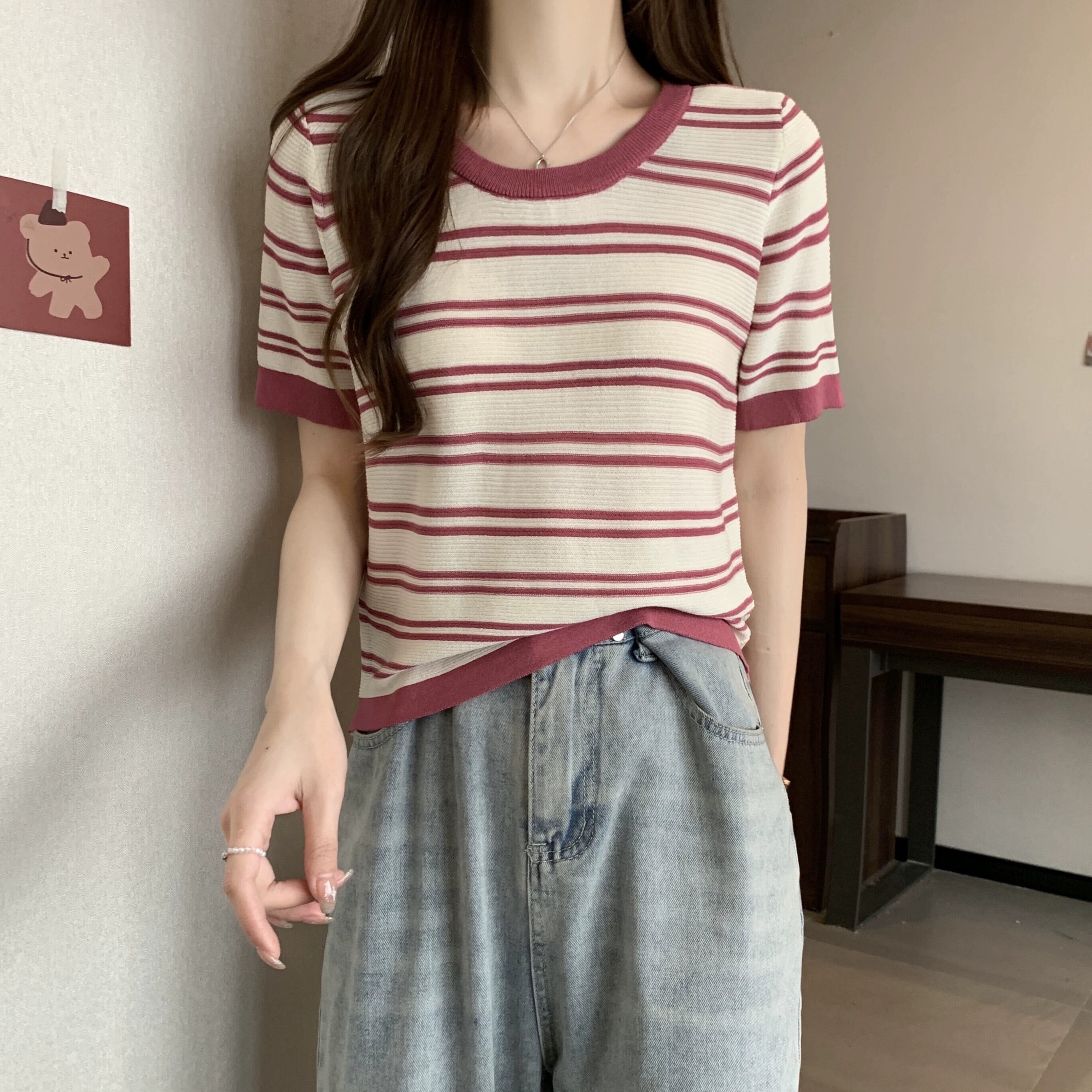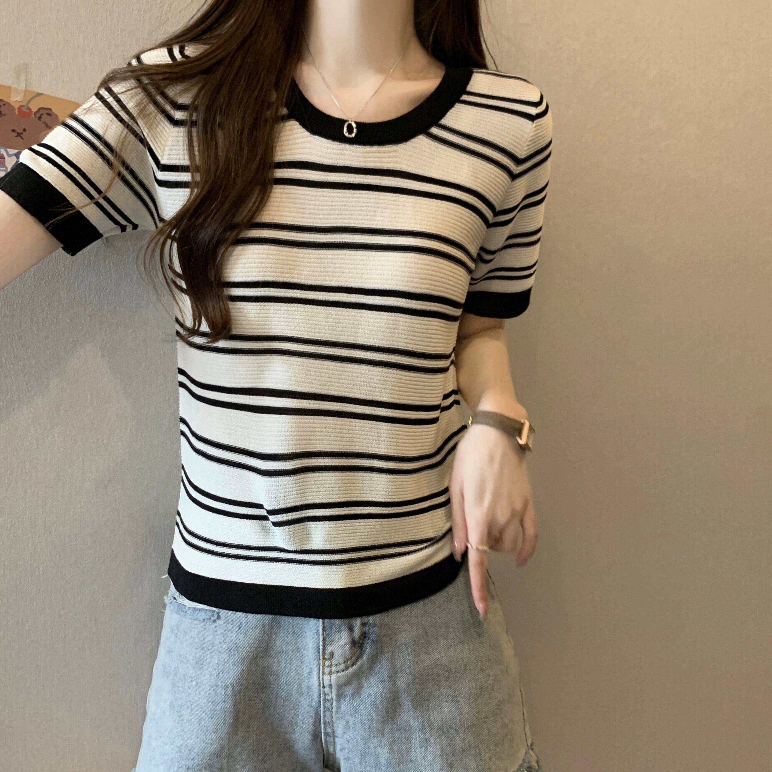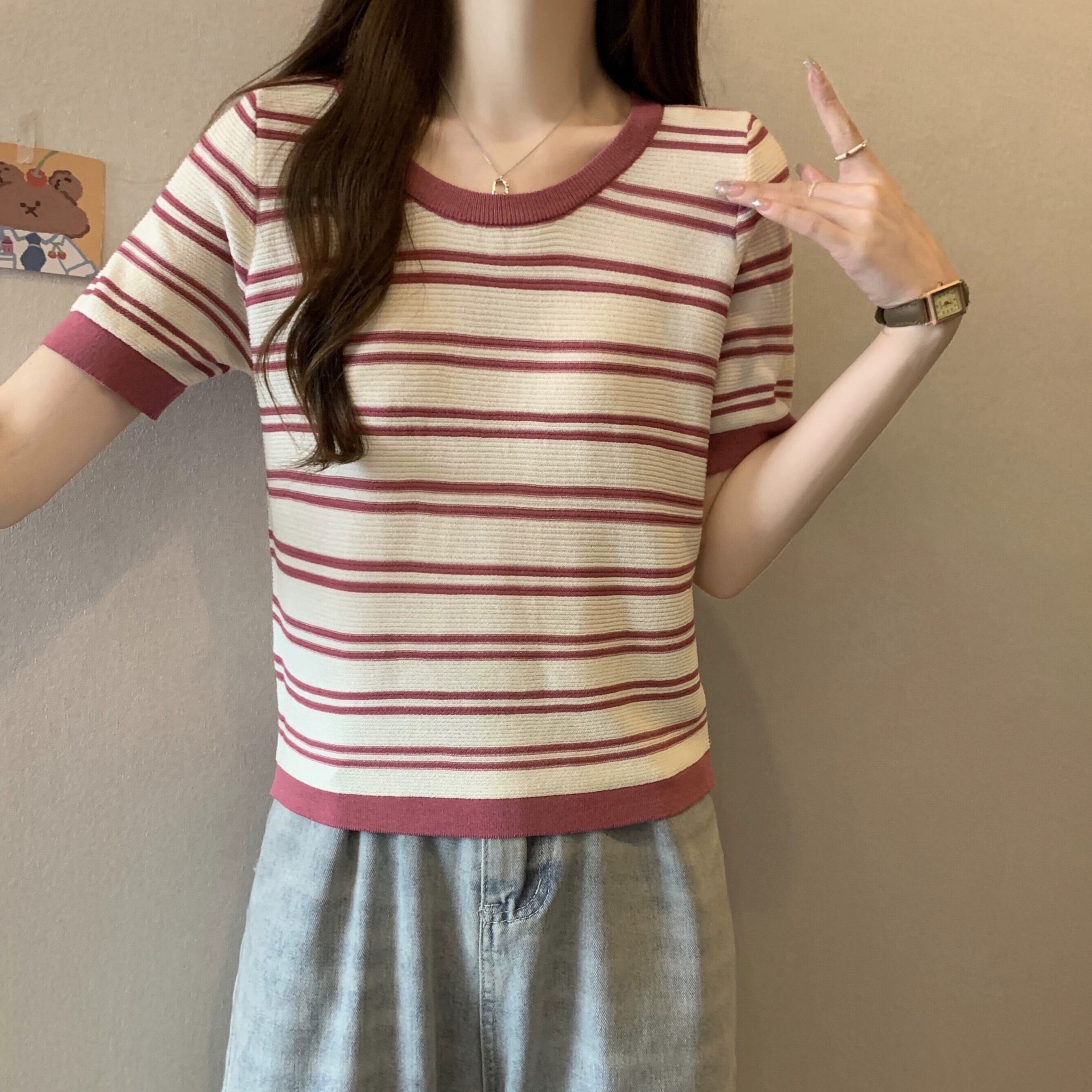 薄いストライプニット半袖Tシャツレディース夏ニッチデザインセンスルーズオールマッチアイスシルクショートカラーコントラストトップ サマー 夏物 7460038097741713 | framboise21