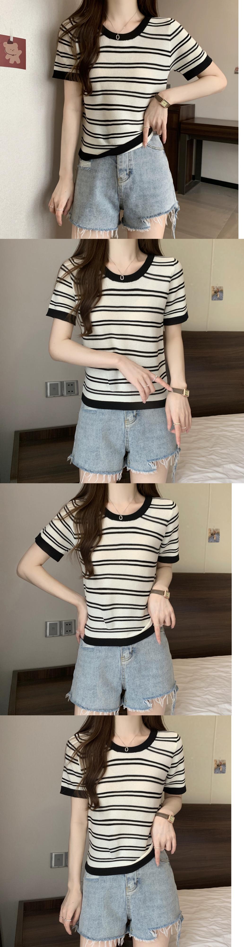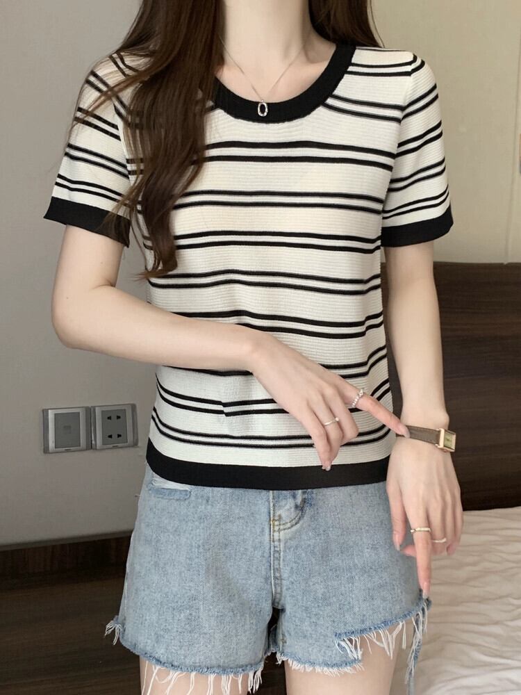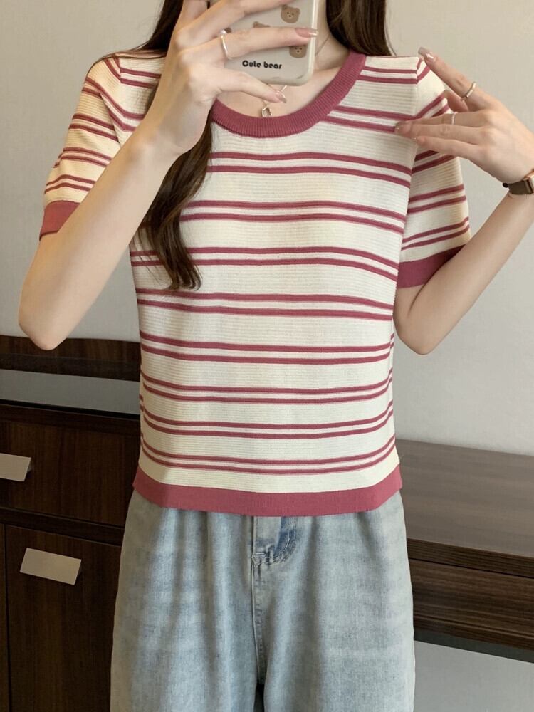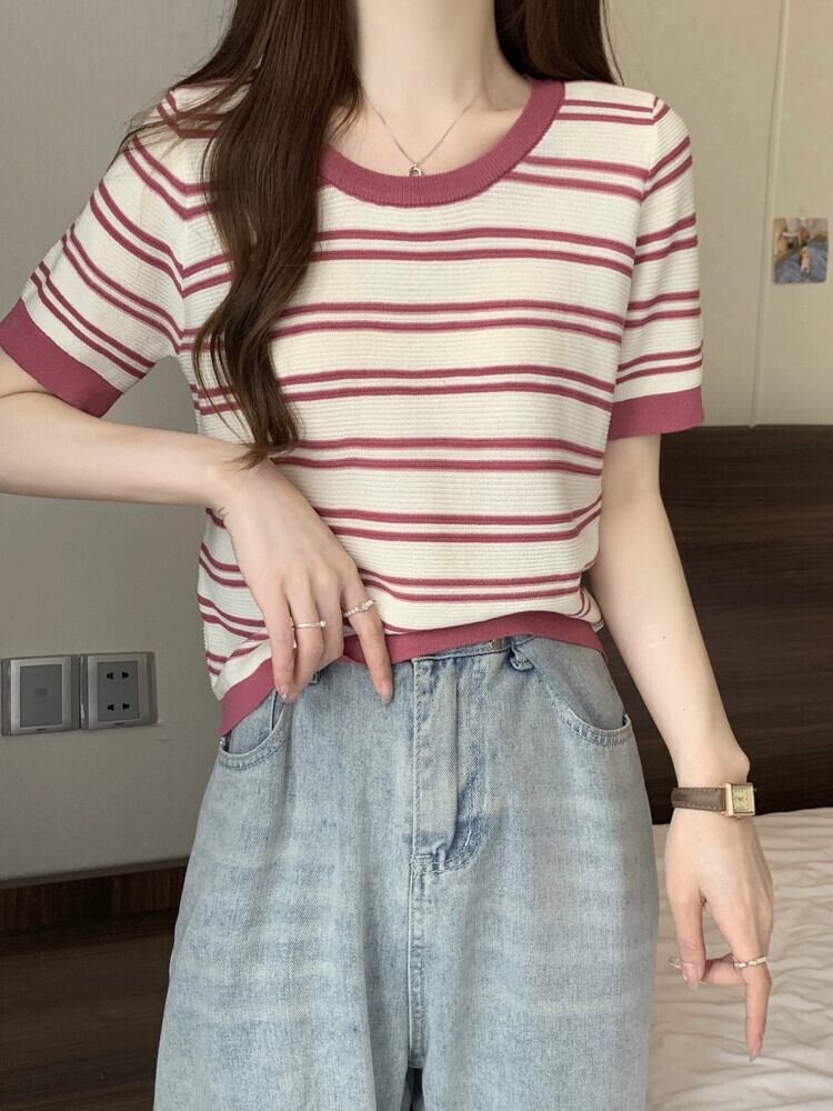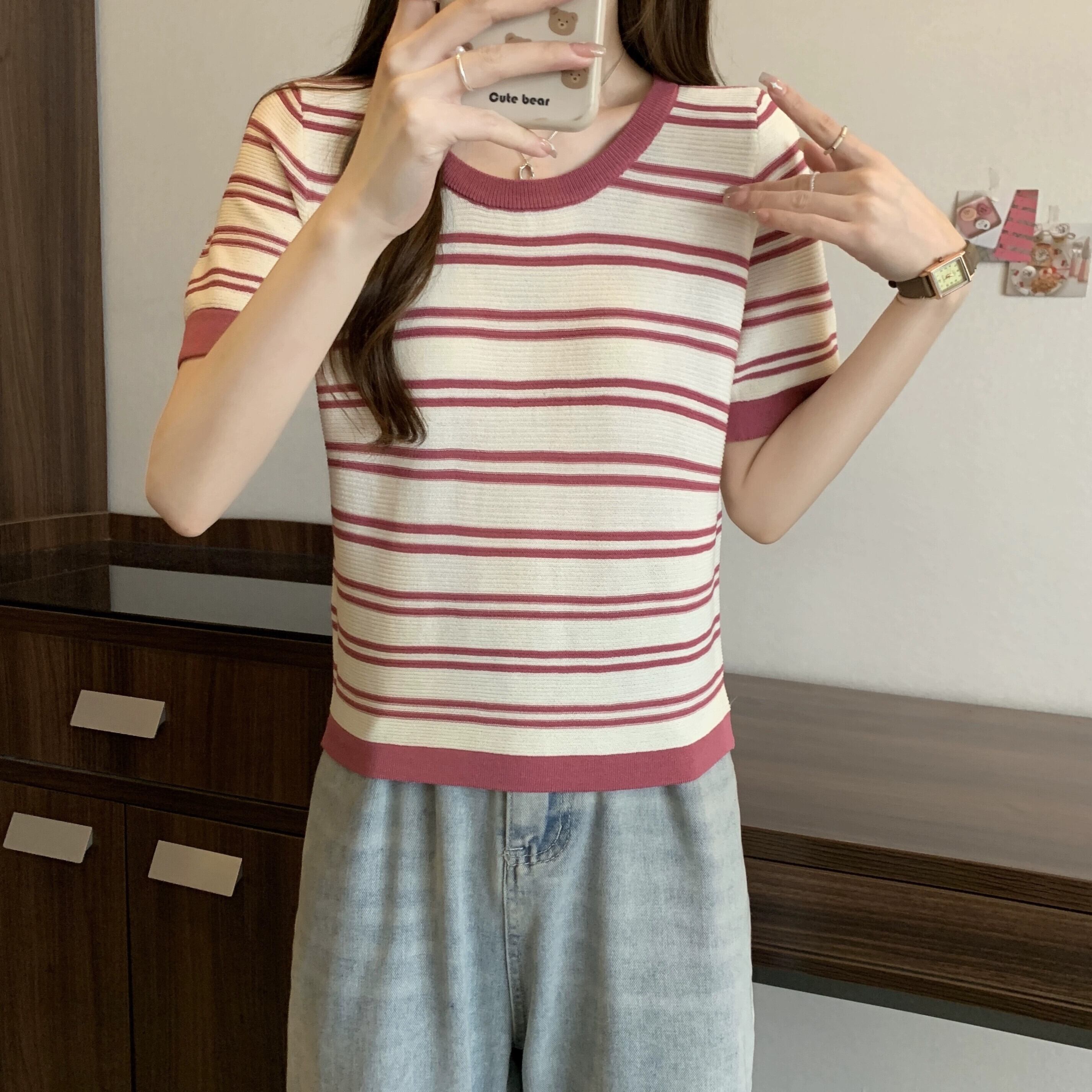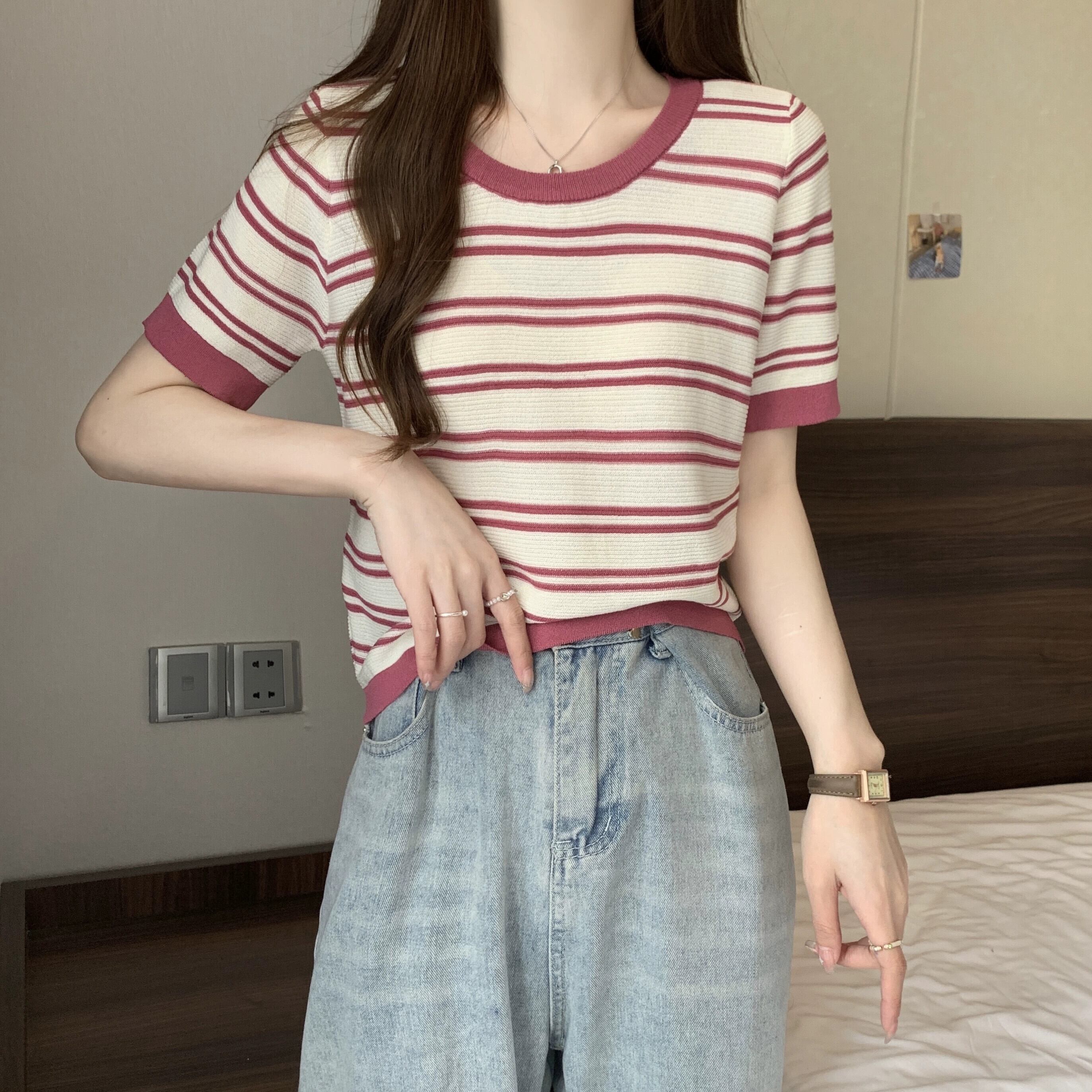 薄いストライプニット半袖Tシャツレディース夏ニッチデザインセンスルーズオールマッチアイスシルクショートカラーコントラストトップ サマー 夏物 7460038097741713 | framboise21