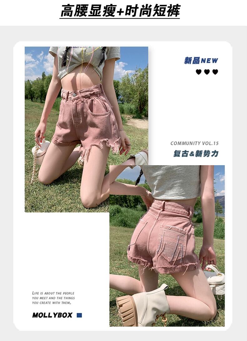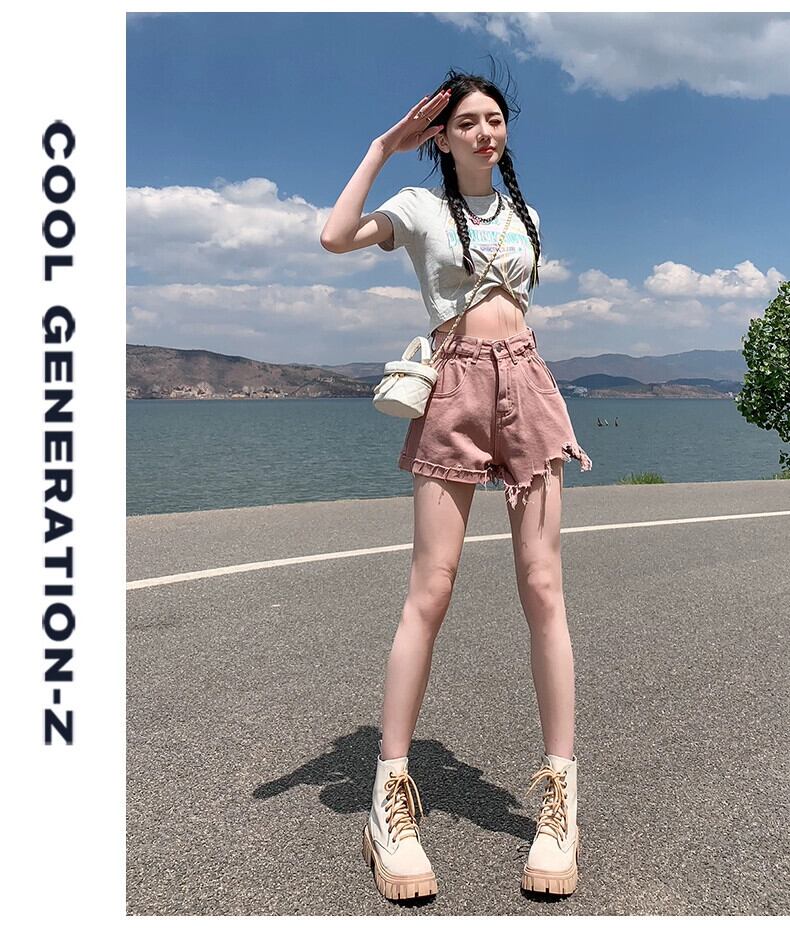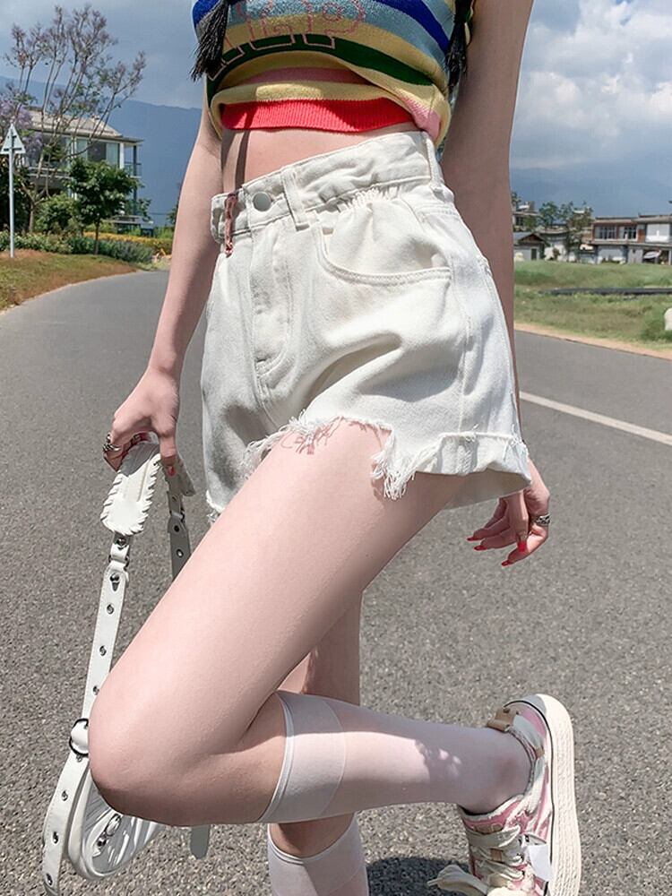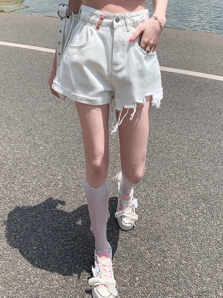 ウエストローエッジデニムショートパンツレディース夏ゆるくて薄いAラインパンツトレンディな破れたパンツを着ています サマー 夏物 ショーツ ブルマー 7460018514077087 | framboise21