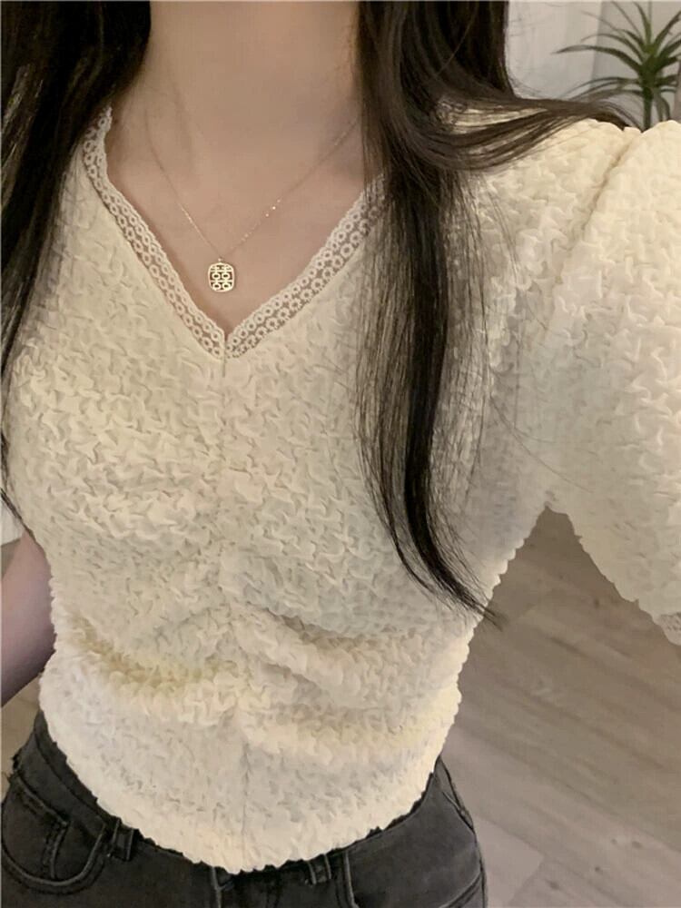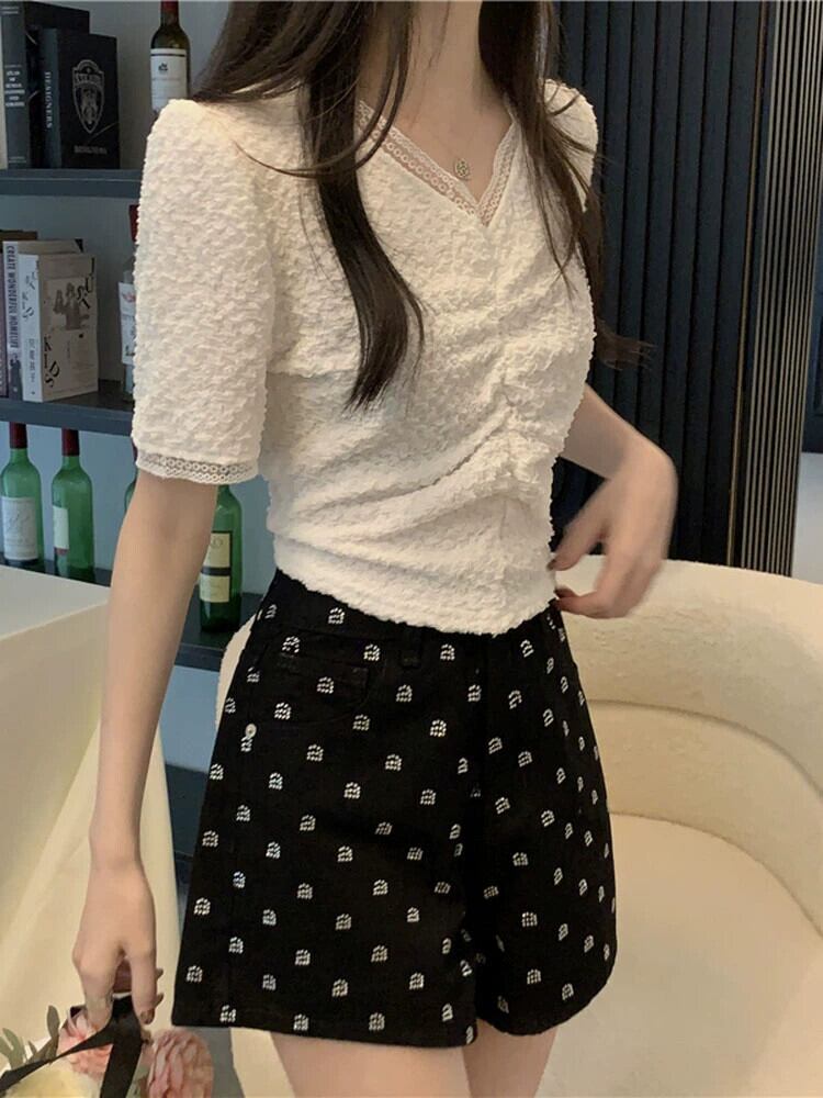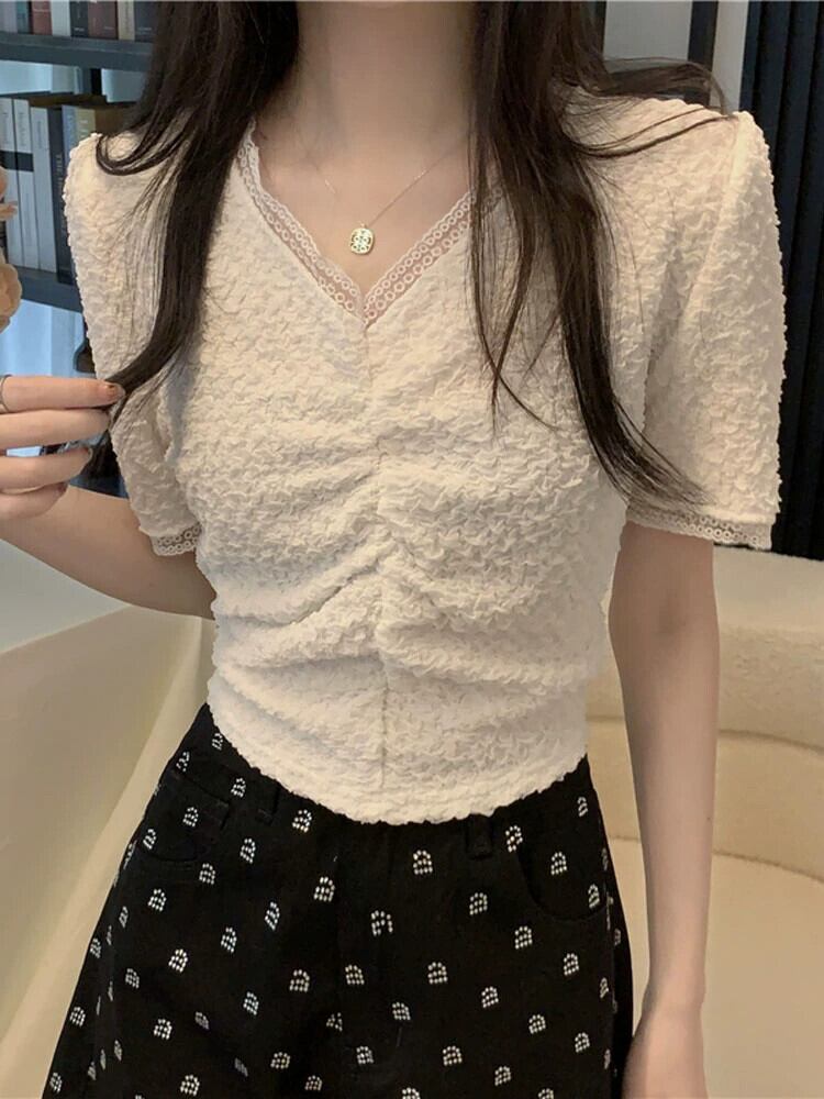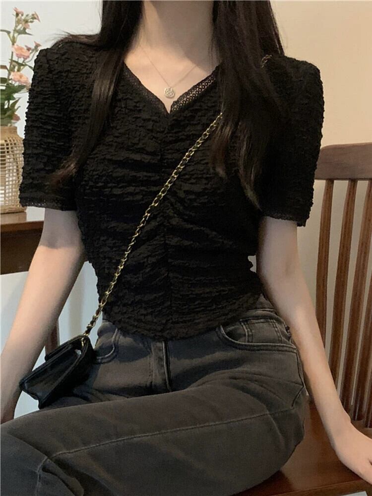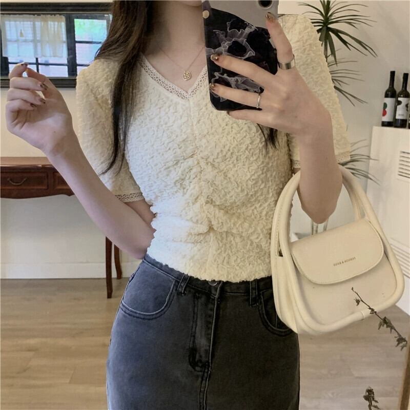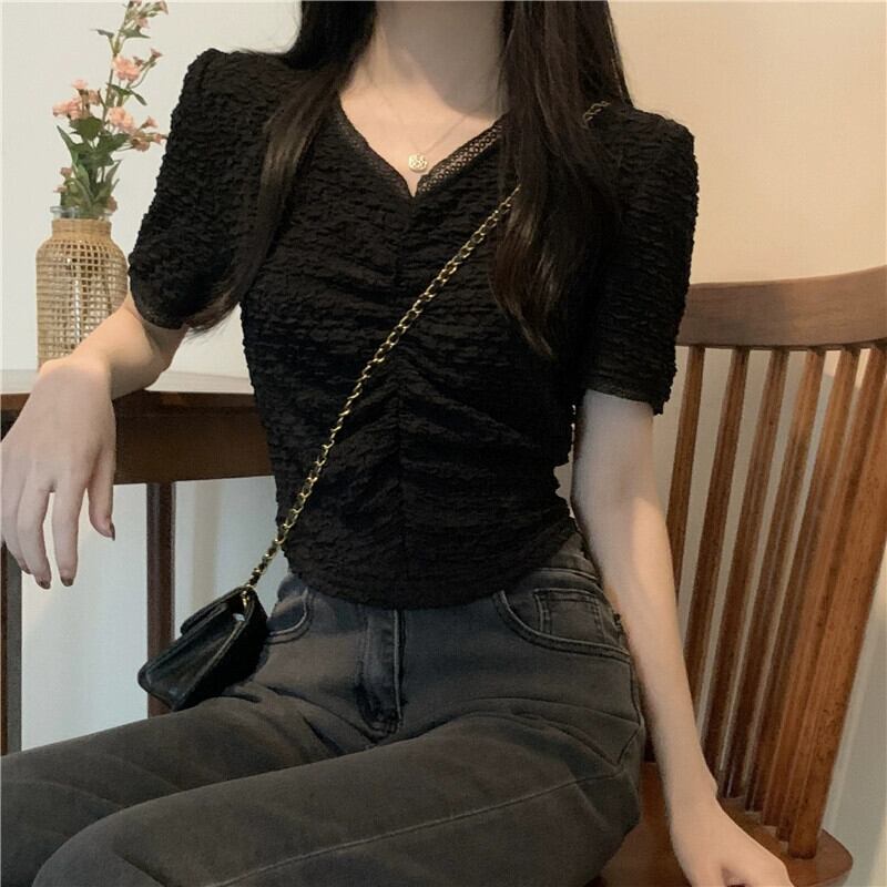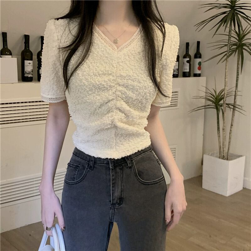 プリーツ V ネック半袖 T シャツ レディース 夏 フレンチ ニッチ スリム シック シック ファッション オールマッチ ショルダー ショート レース トップ サマー 夏物 Vネック Tシャツ 7460075468729940 | framboise21