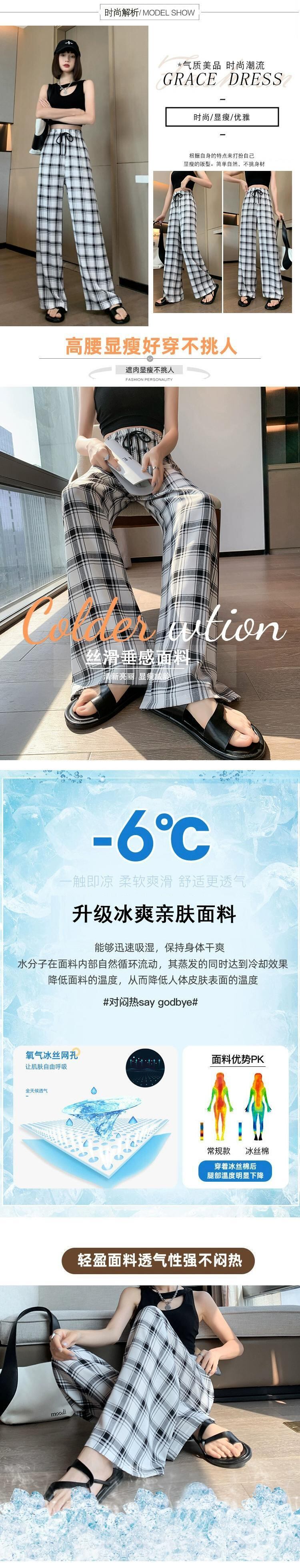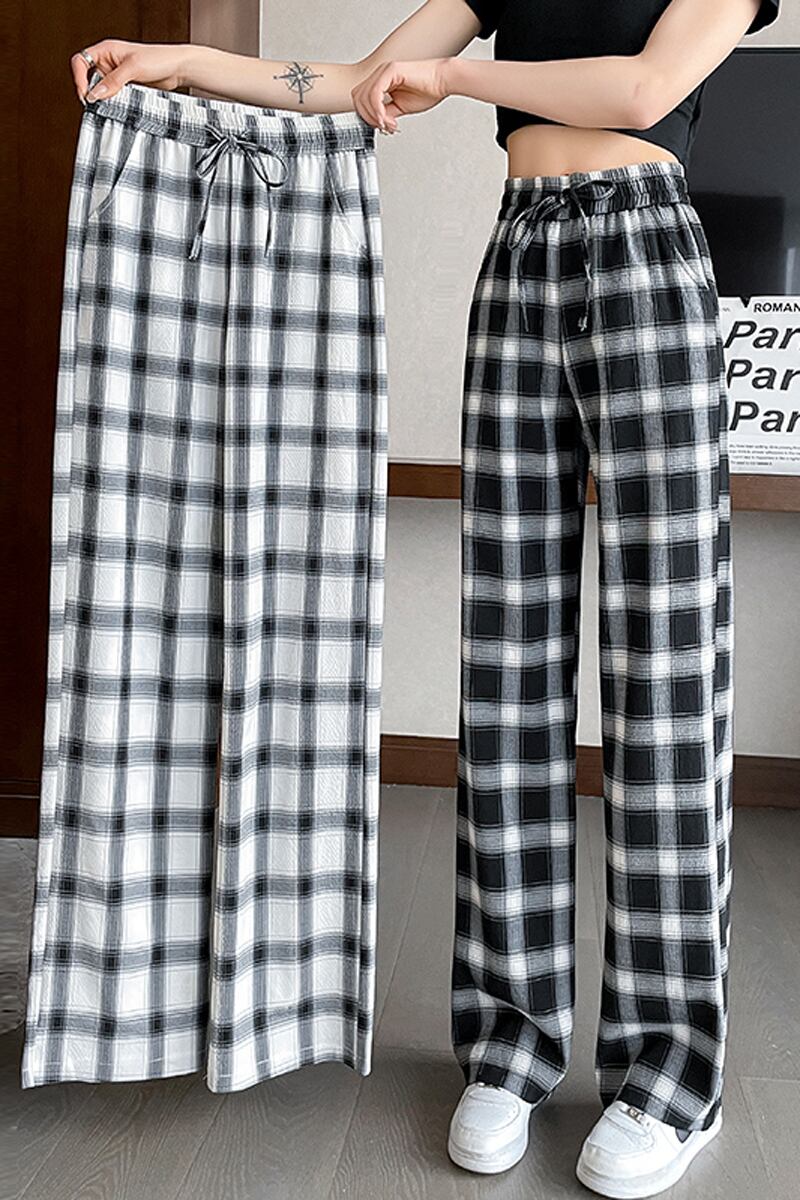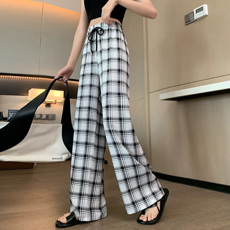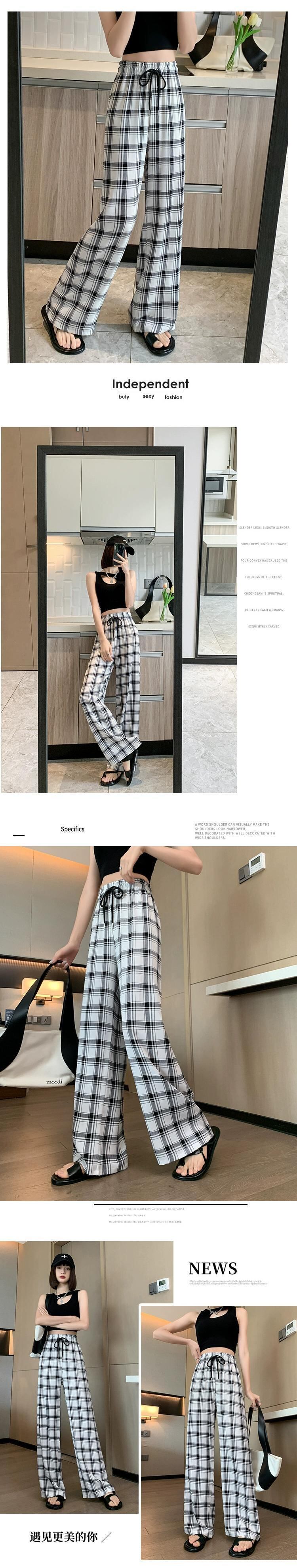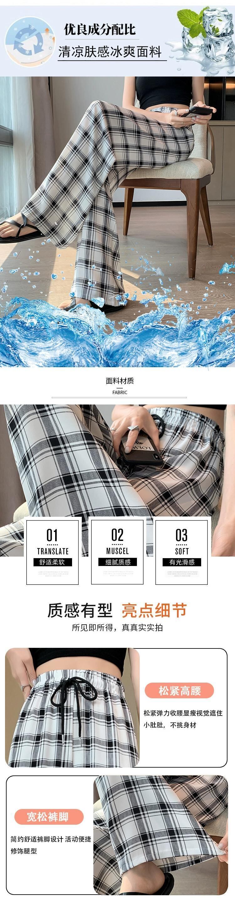 黒と白のチェック柄ハイウエストパンツレディース夏薄いアイスシルクワイドレッグパンツルーズオールマッチドレープフロアモップストレートレッグカジュアルパンツ ホワイト ブラック サマー 夏物 7460012140494827 | framboise21