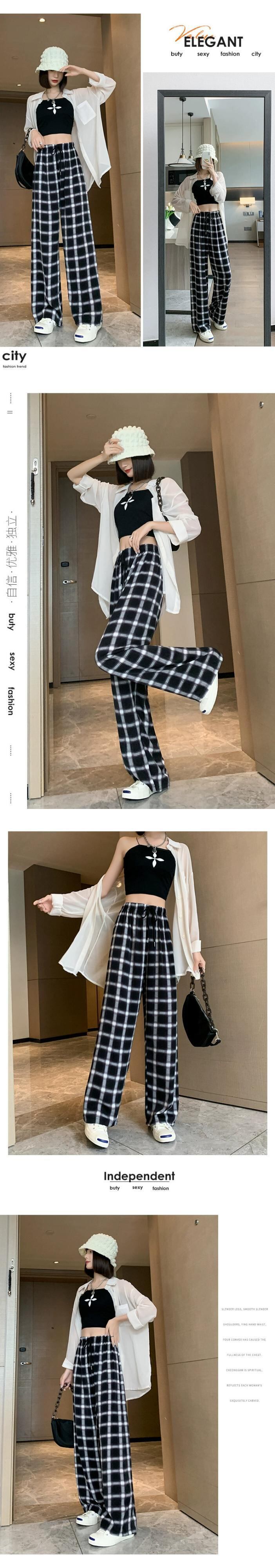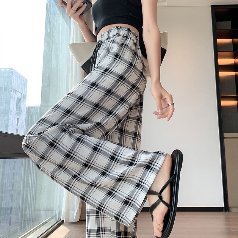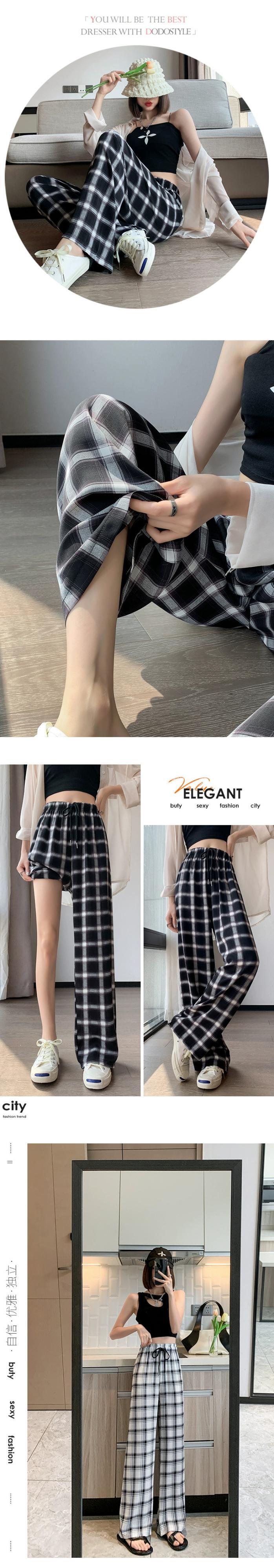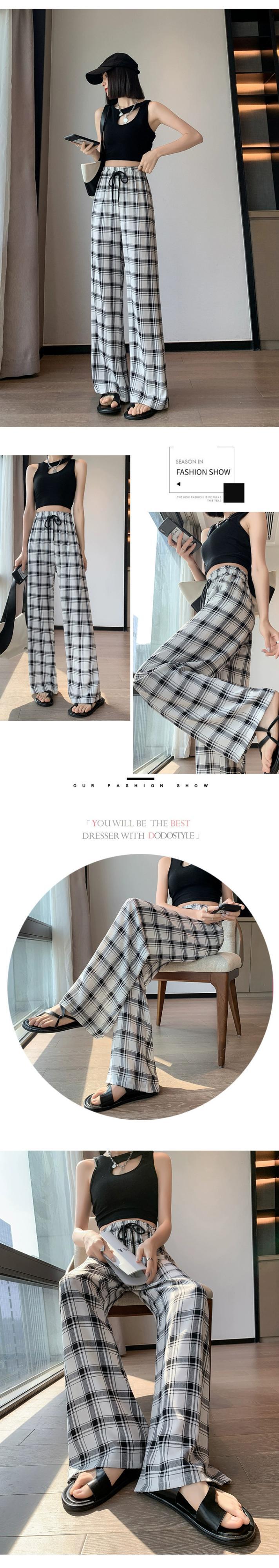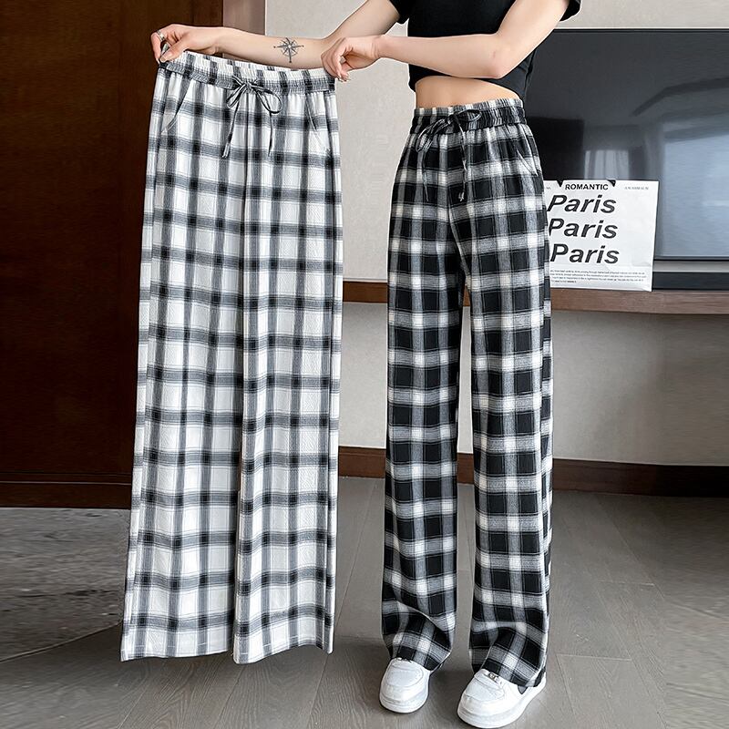 黒と白のチェック柄ハイウエストパンツレディース夏薄いアイスシルクワイドレッグパンツルーズオールマッチドレープフロアモップストレートレッグカジュアルパンツ ホワイト ブラック サマー 夏物 7460012140494827 | framboise21