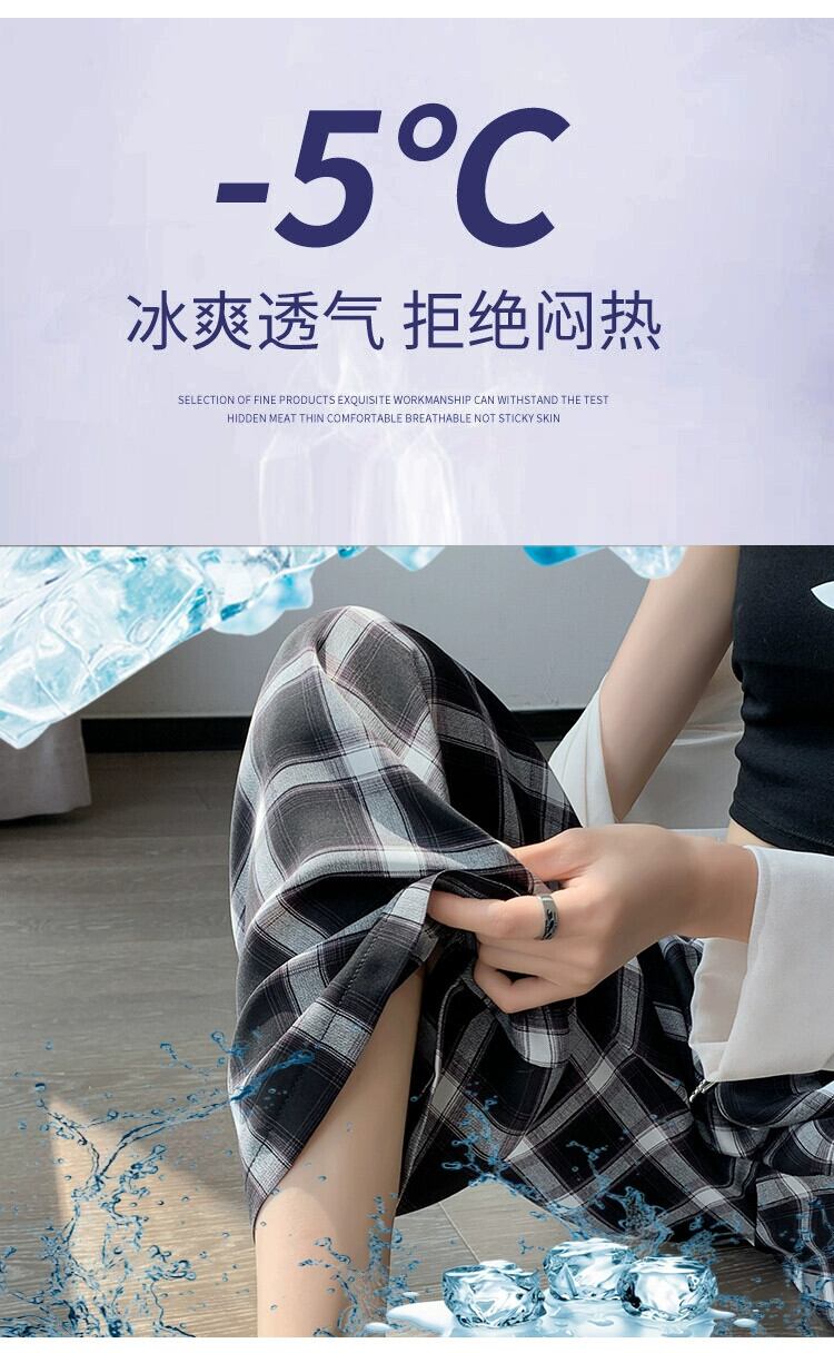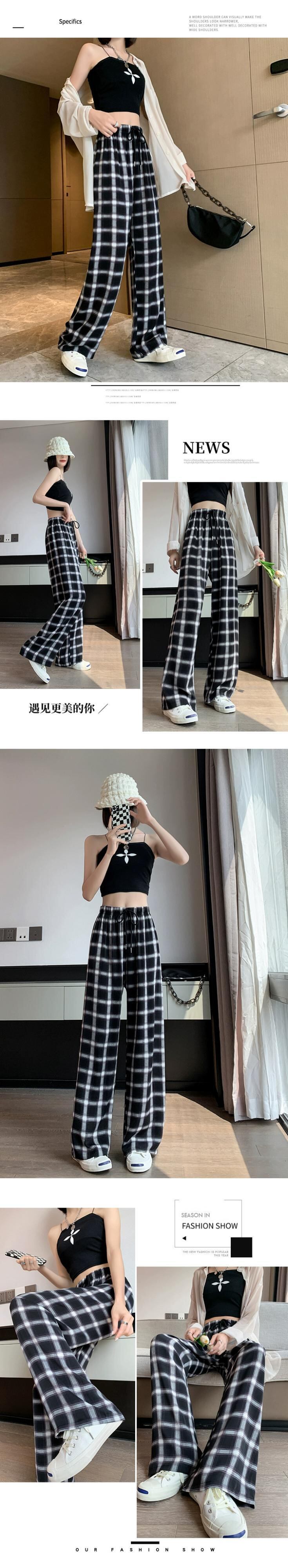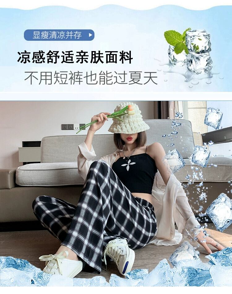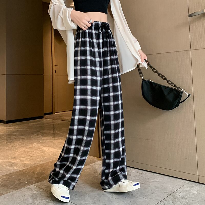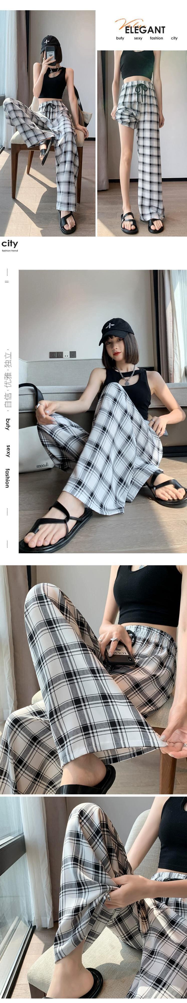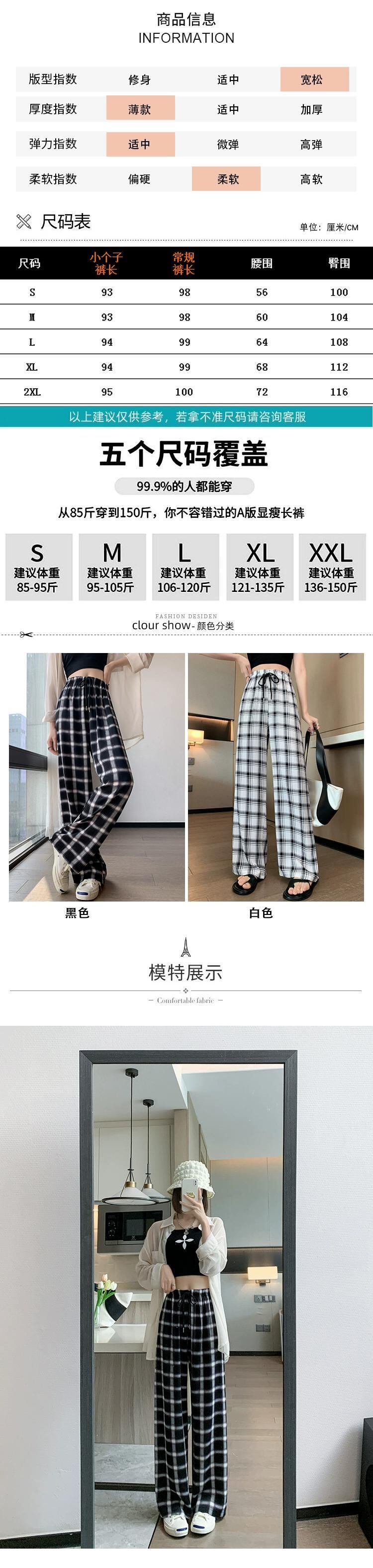 黒と白のチェック柄ハイウエストパンツレディース夏薄いアイスシルクワイドレッグパンツルーズオールマッチドレープフロアモップストレートレッグカジュアルパンツ ホワイト ブラック サマー 夏物 7460012140494827 | framboise21
