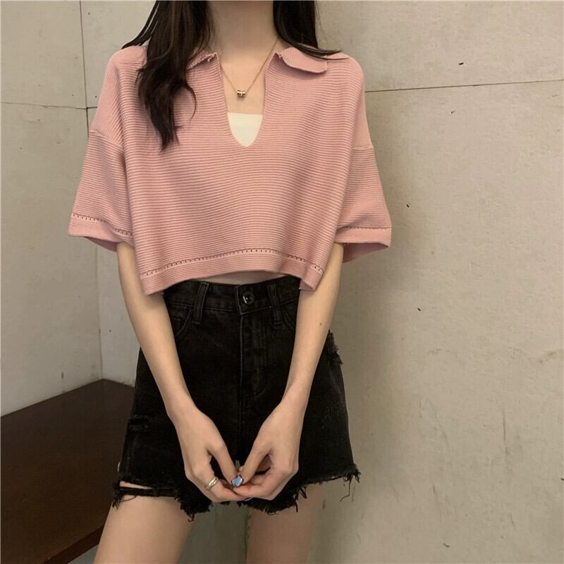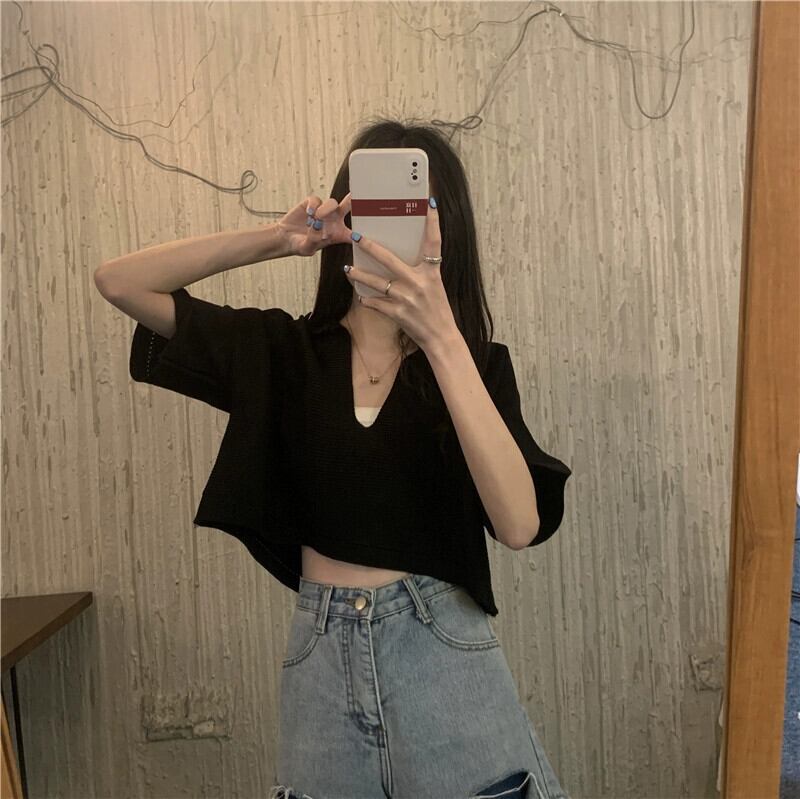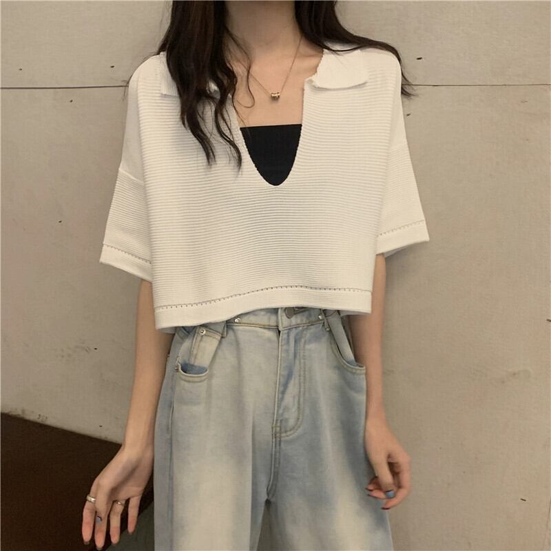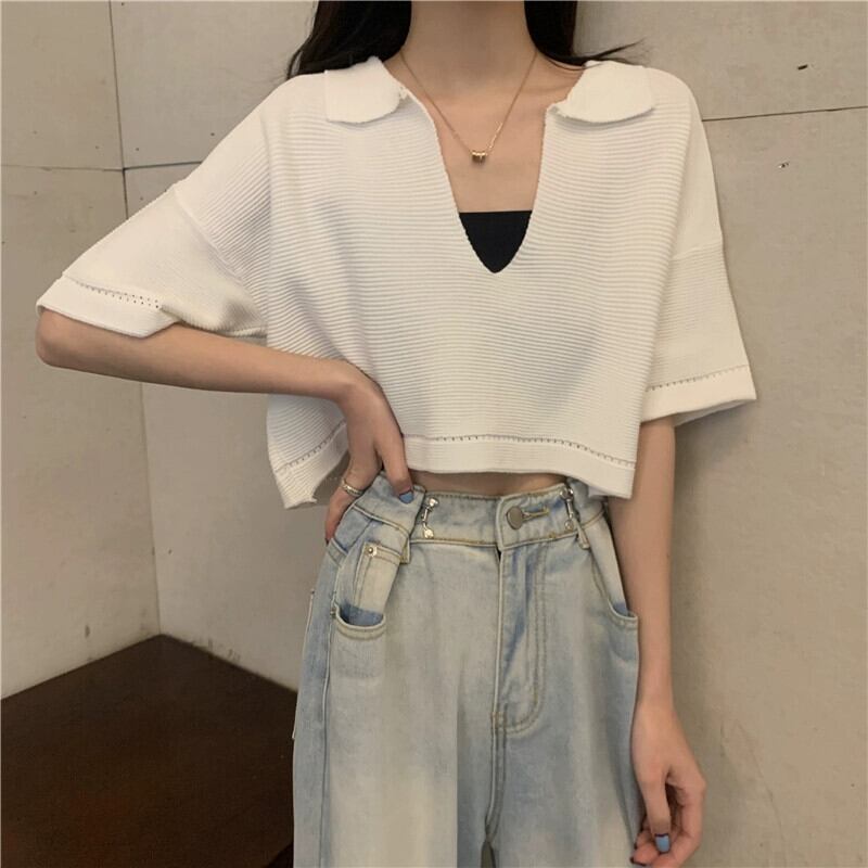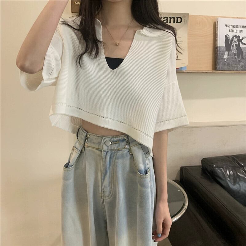 ホワイトフロントショルダーニット半袖Tシャツレディース2023年夏新デザインハイウエストショートローVネックトップ ハイウェスト サマー 夏物 7460039188104528 | framboise21