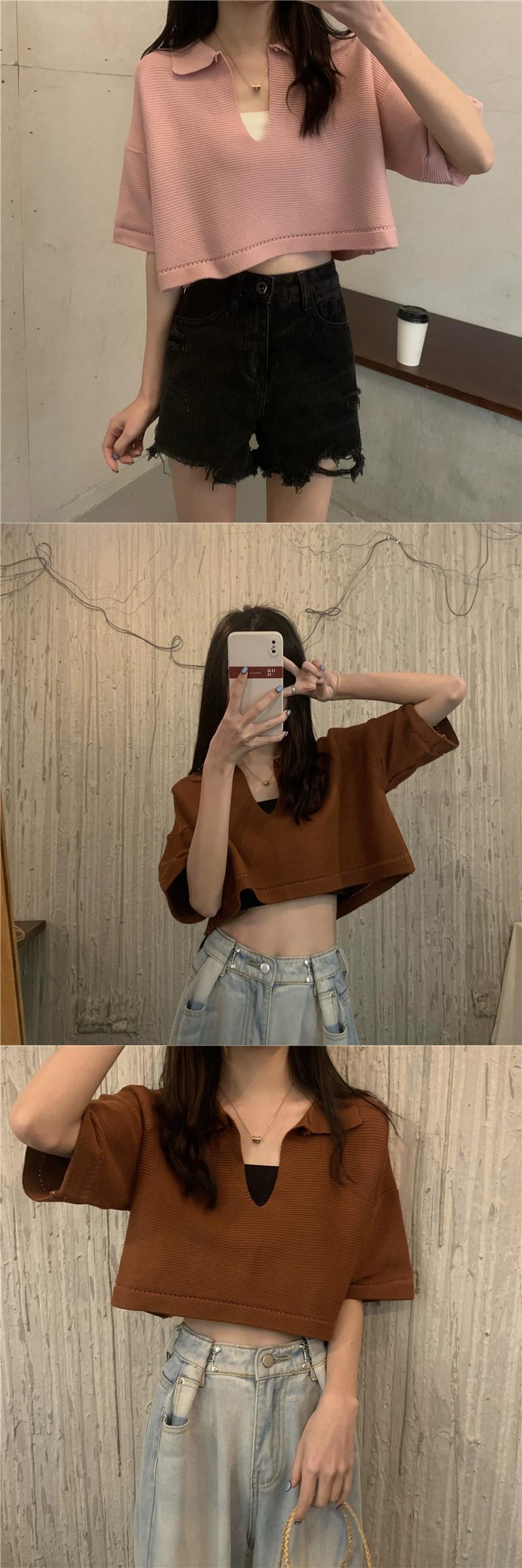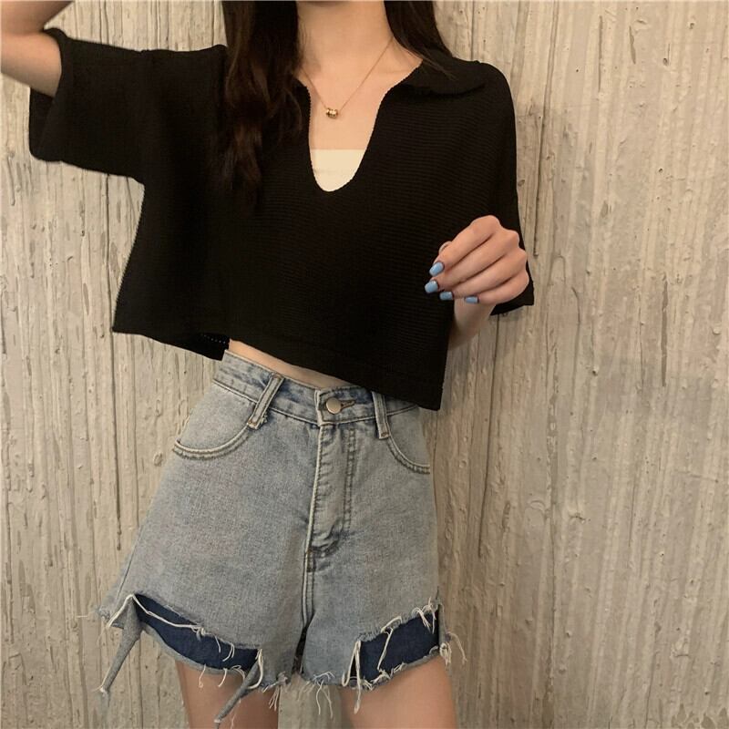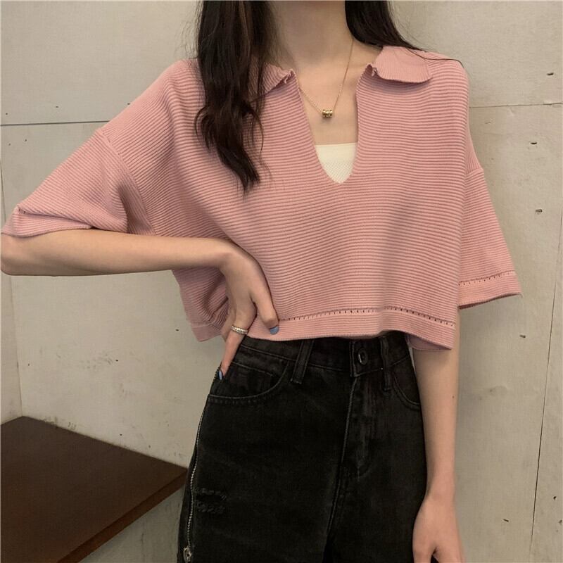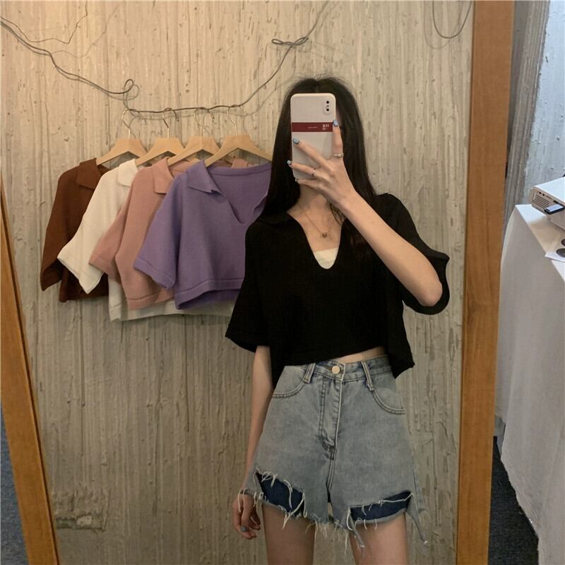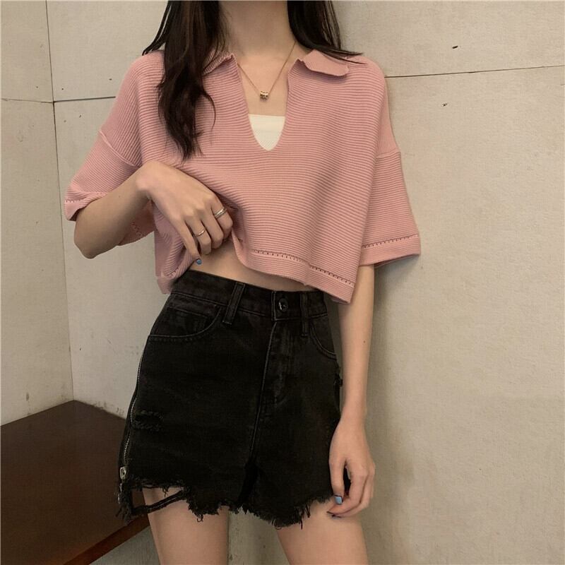 ホワイトフロントショルダーニット半袖Tシャツレディース2023年夏新デザインハイウエストショートローVネックトップ ハイウェスト サマー 夏物 7460039188104528 | framboise21