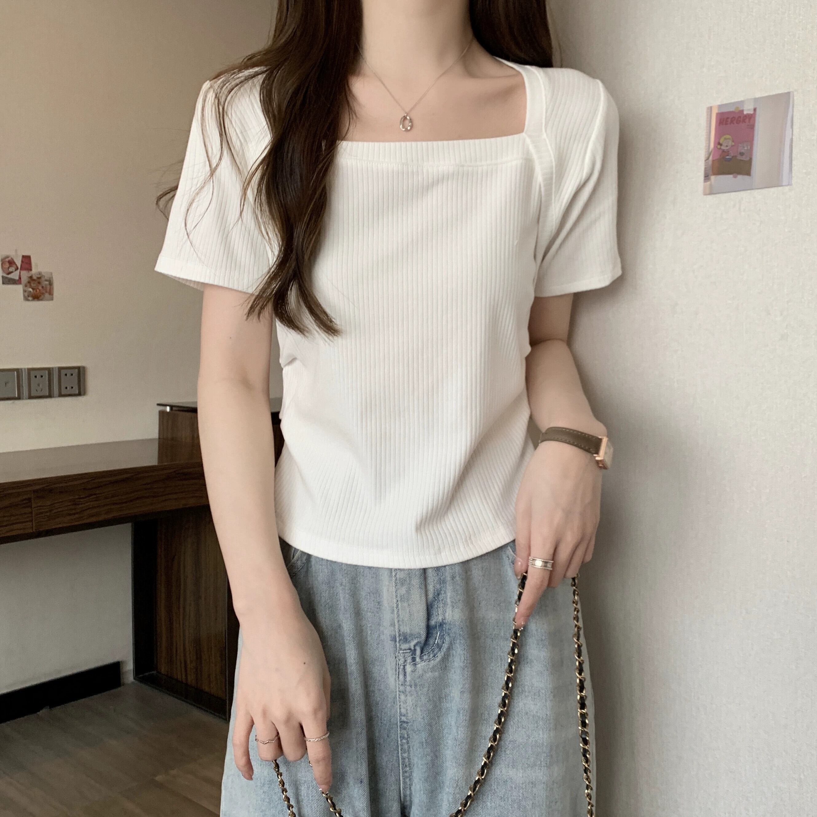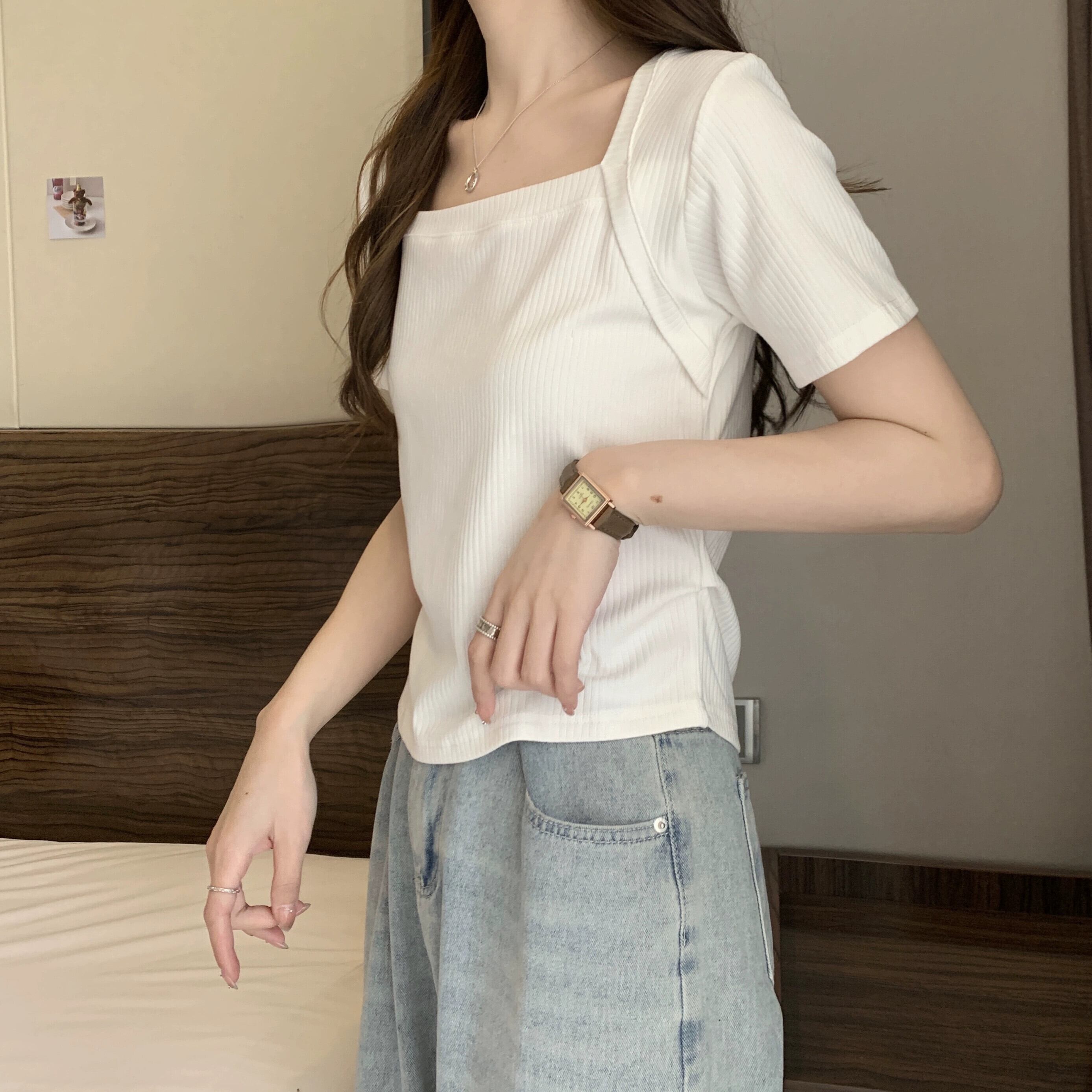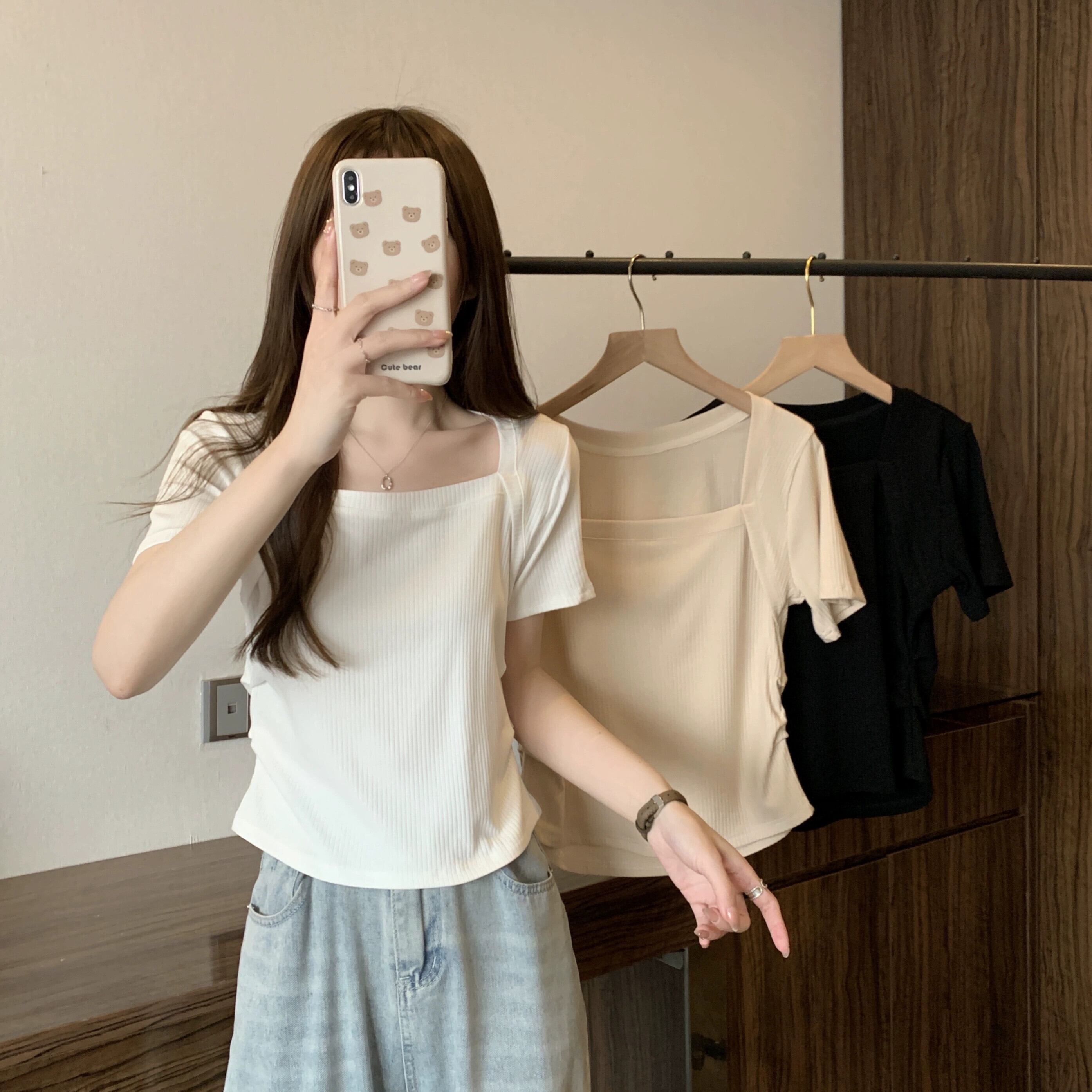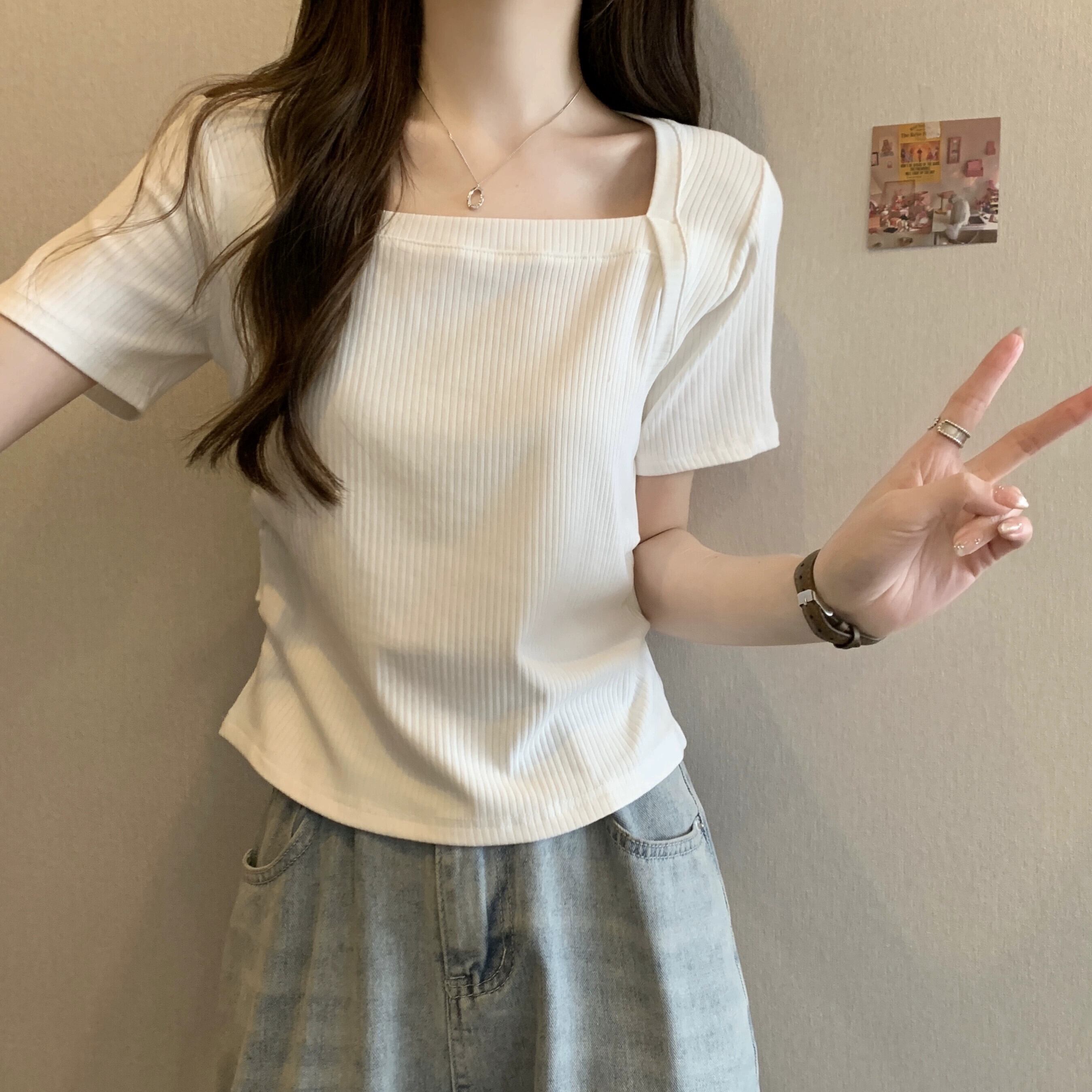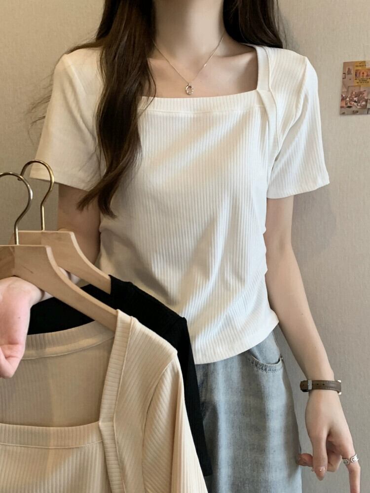 ホワイトフロントショルダーアイスシルク半袖Tシャツ女性の夏の自己修養痩身ニッチ不規則なひだショートスクエアネックトップ サマー 夏物 スクウェア 7460062962344991 | framboise21
