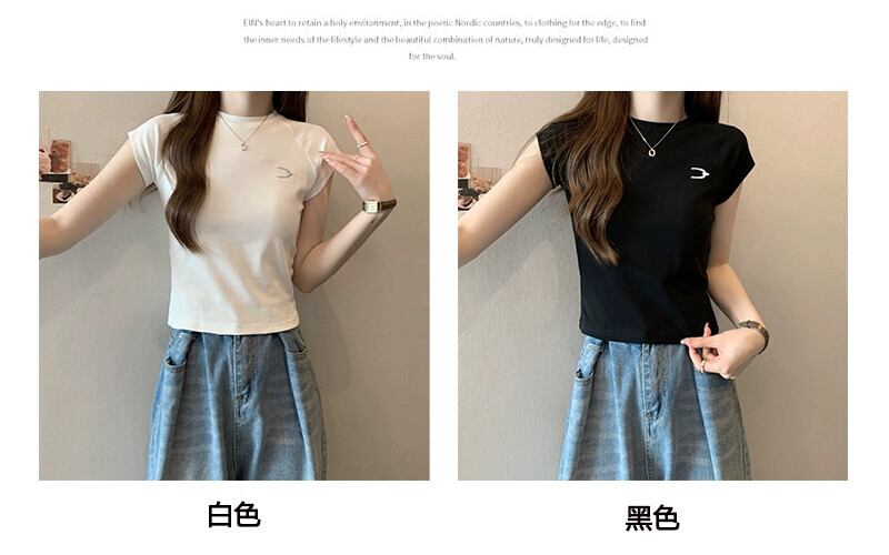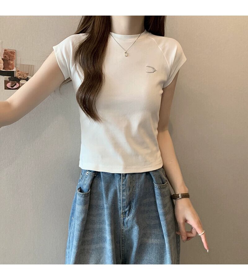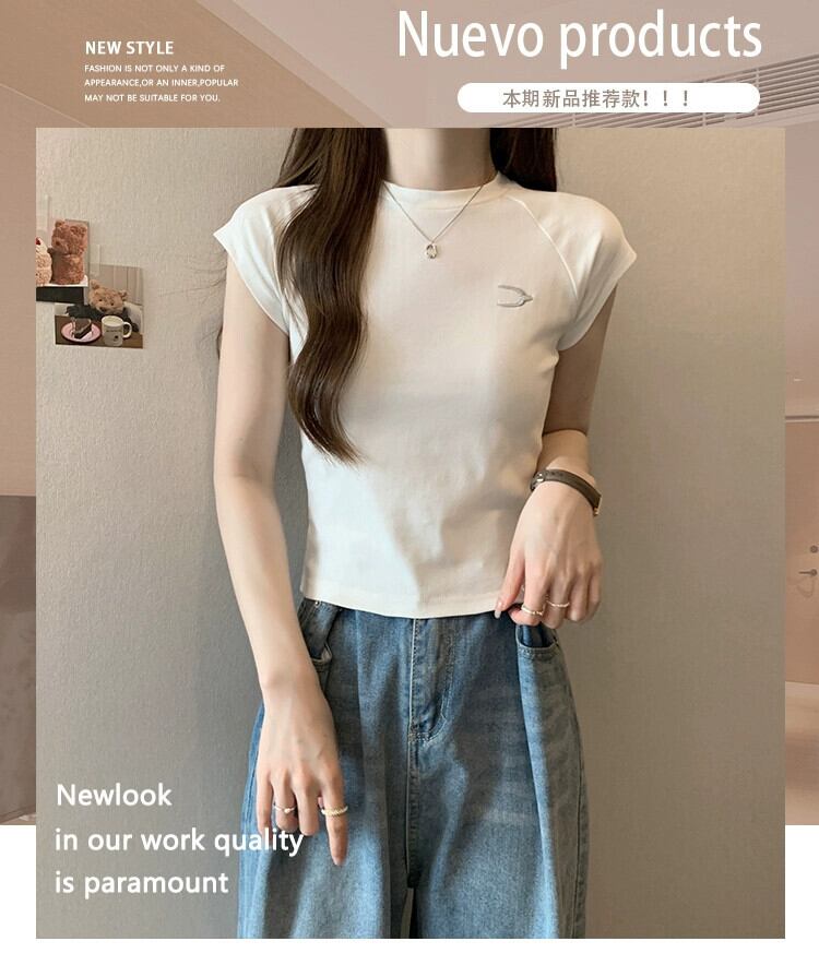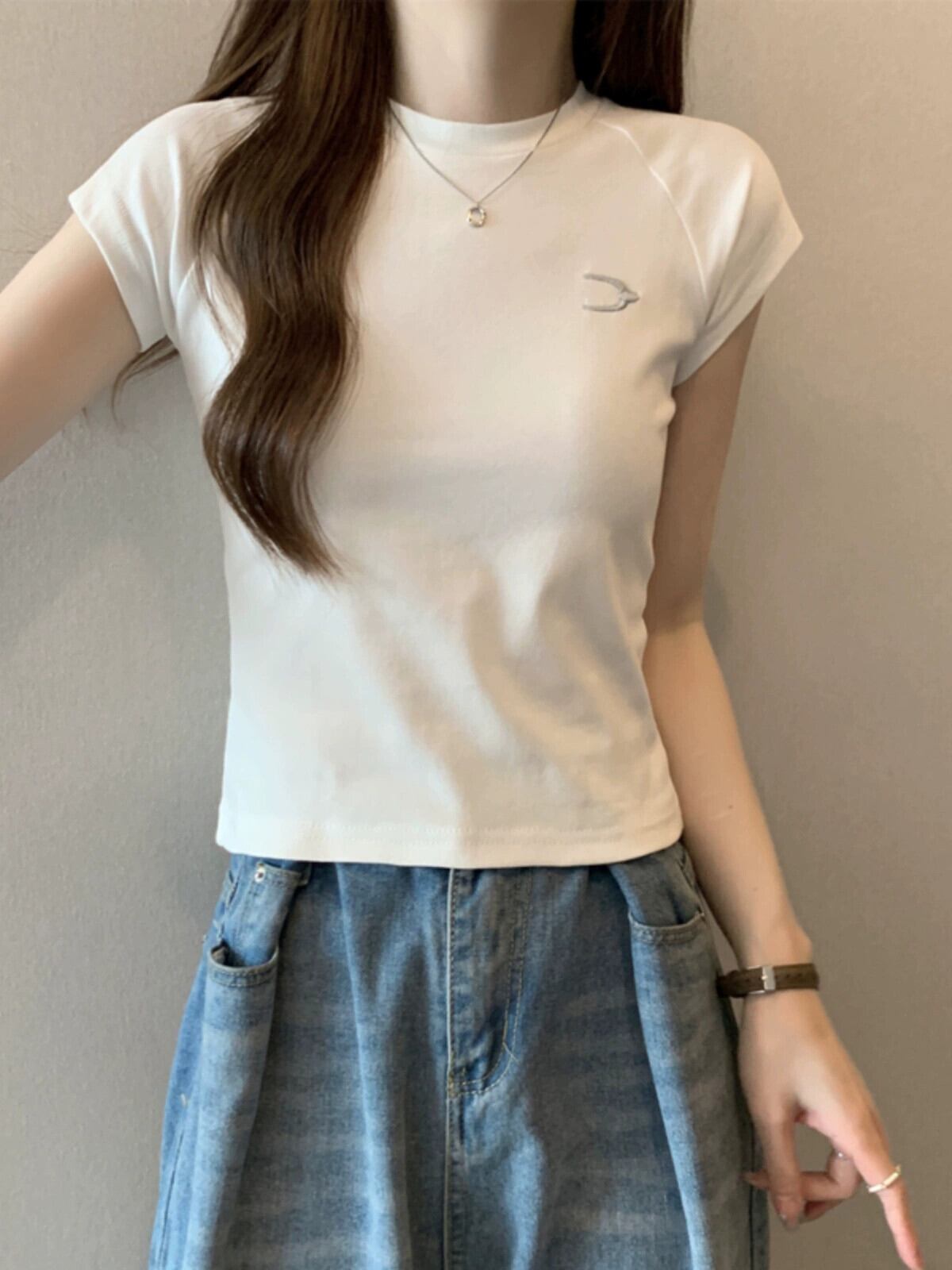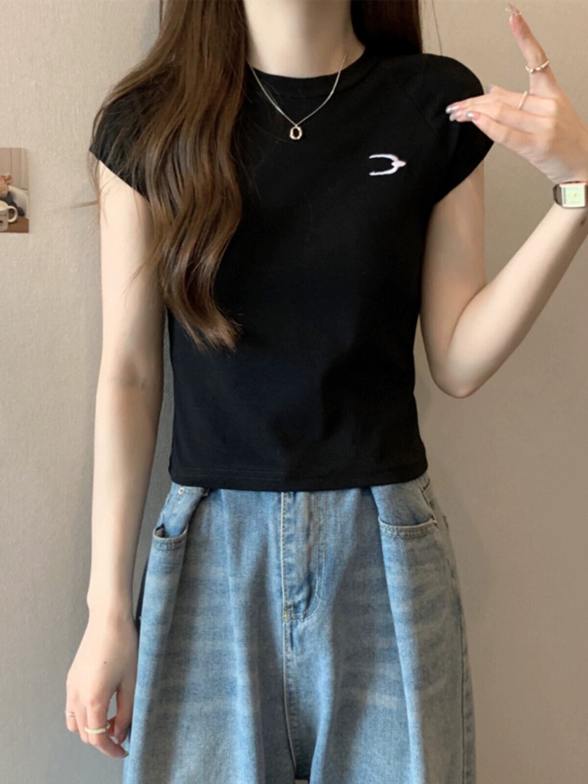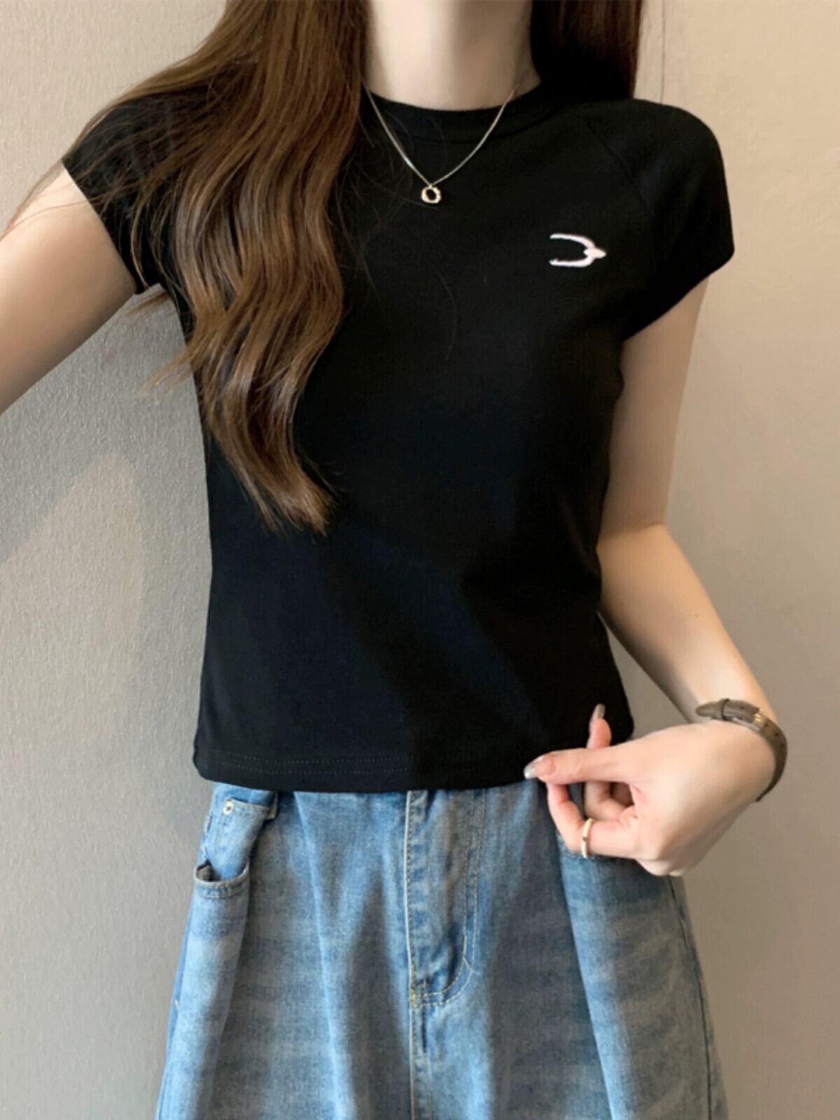 純綿ラグランショルダー半袖Tシャツレディース2023年夏新デザインセンススリムフィットと薄手ショート刺繍ラウンドネックトップ コットン サマー 夏物 Oネック 7460072479424148 | framboise21