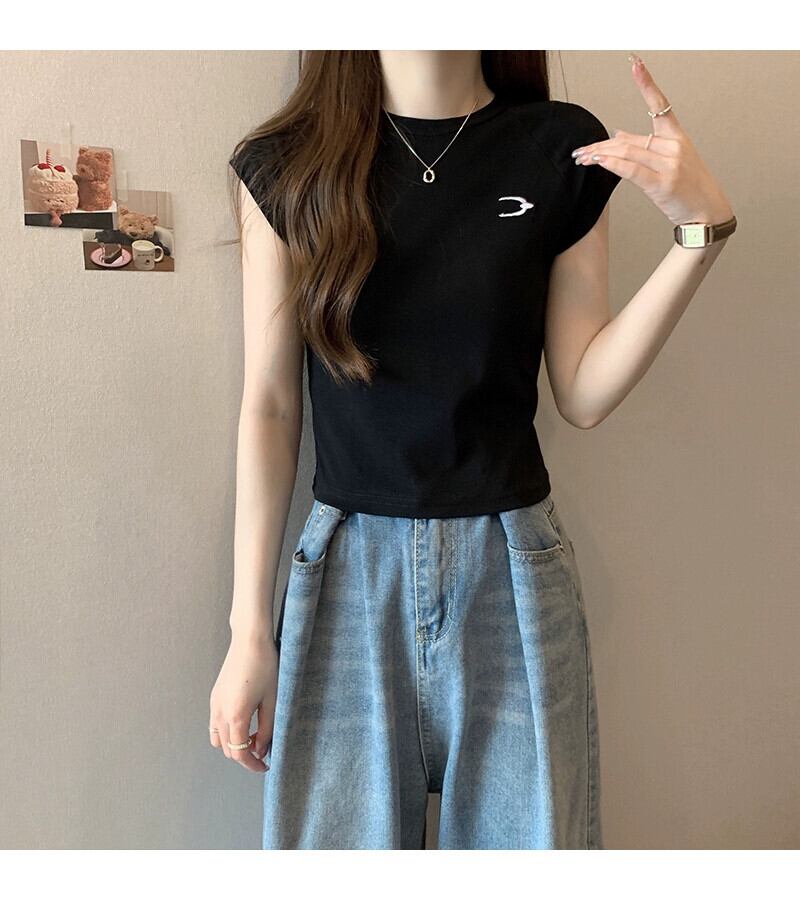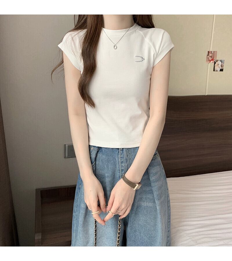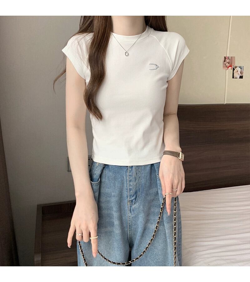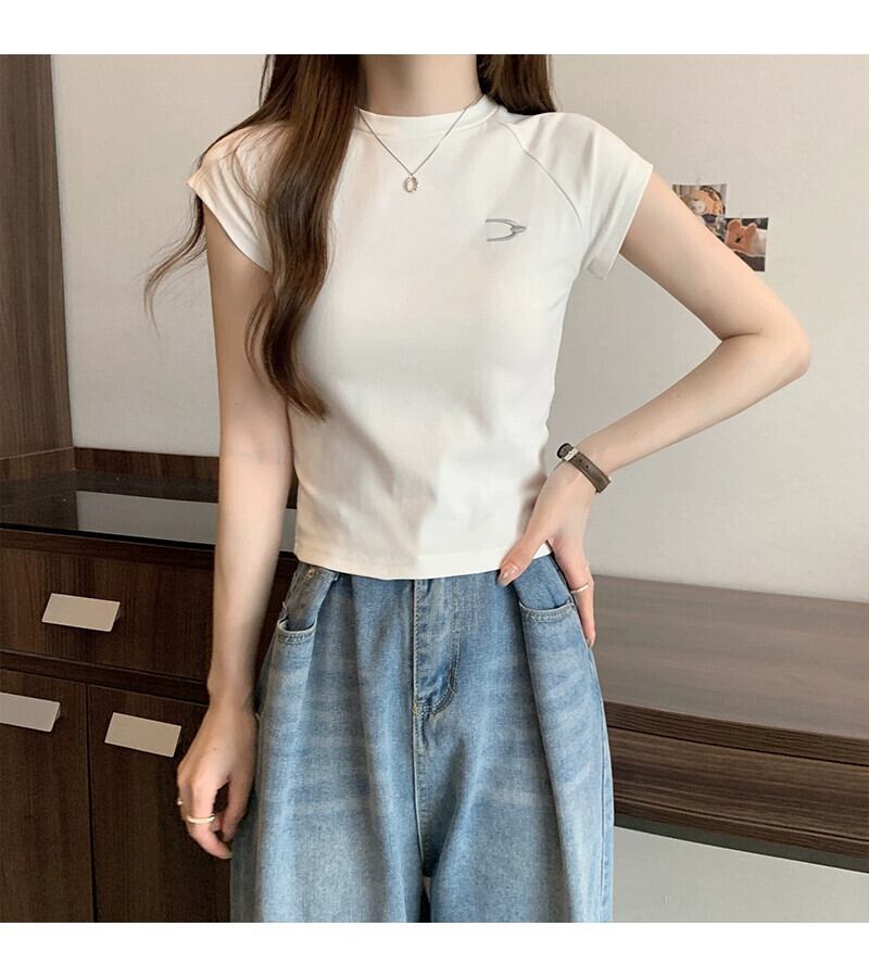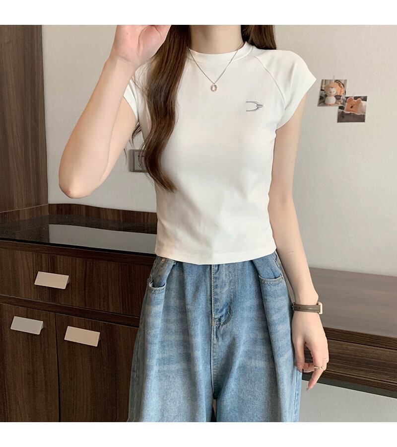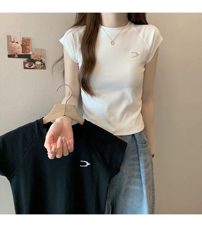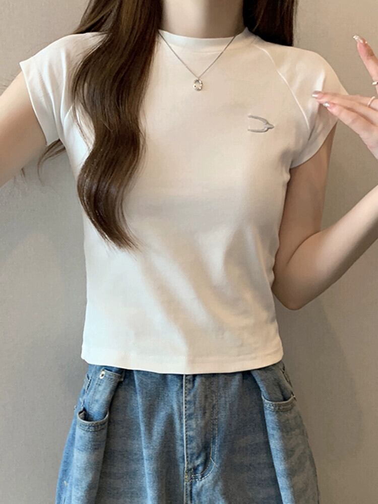 純綿ラグランショルダー半袖Tシャツレディース2023年夏新デザインセンススリムフィットと薄手ショート刺繍ラウンドネックトップ コットン サマー 夏物 Oネック 7460072479424148 | framboise21