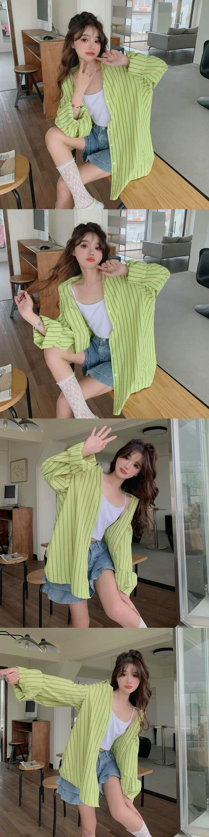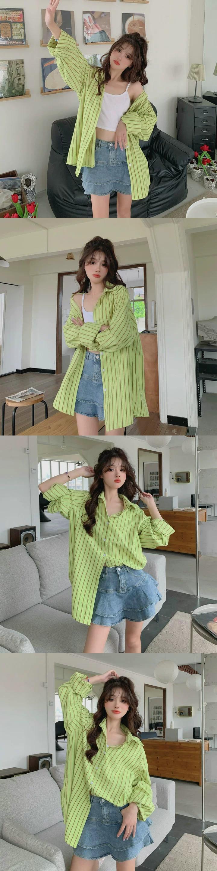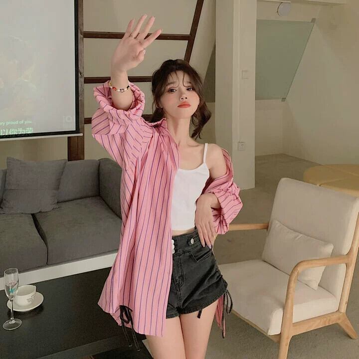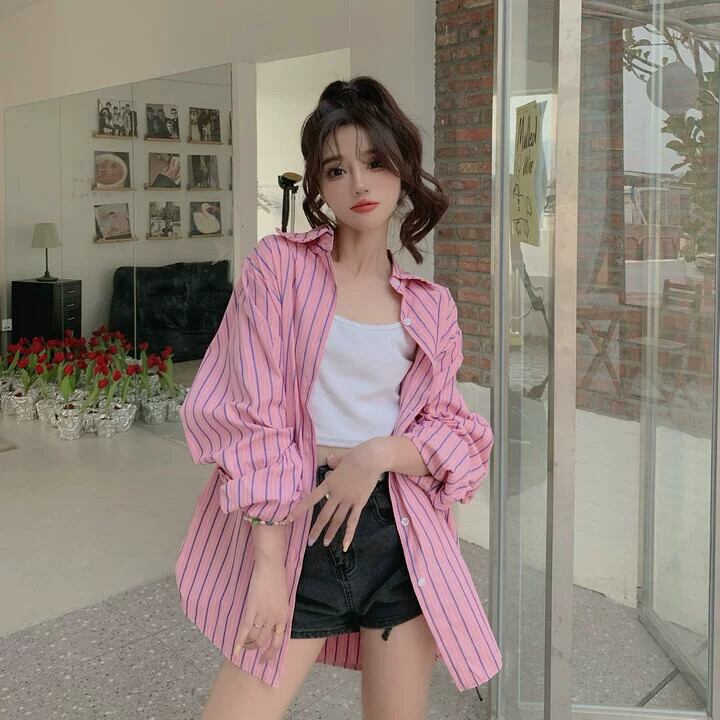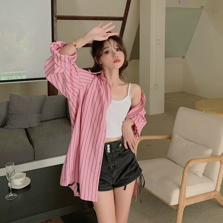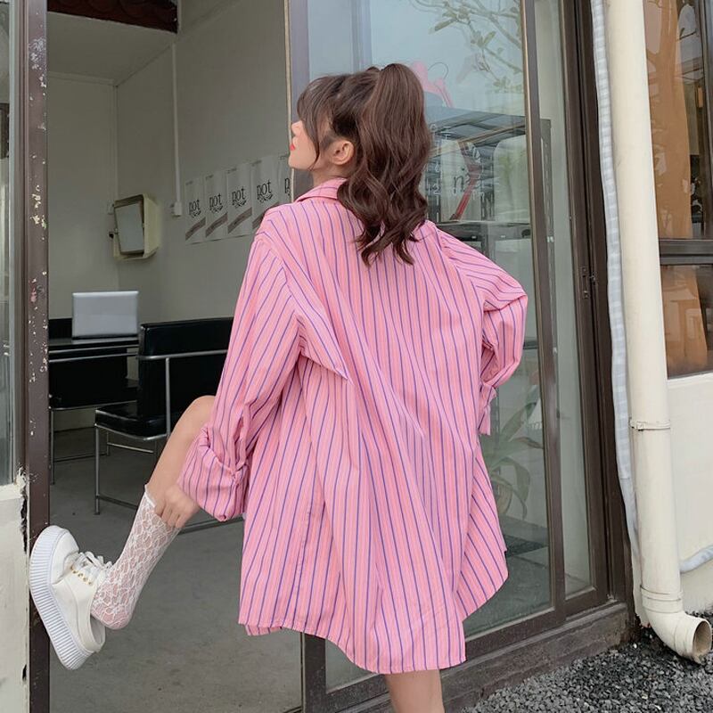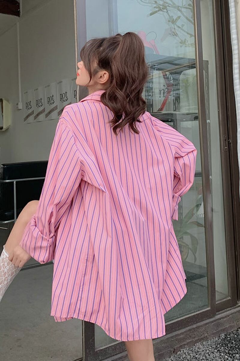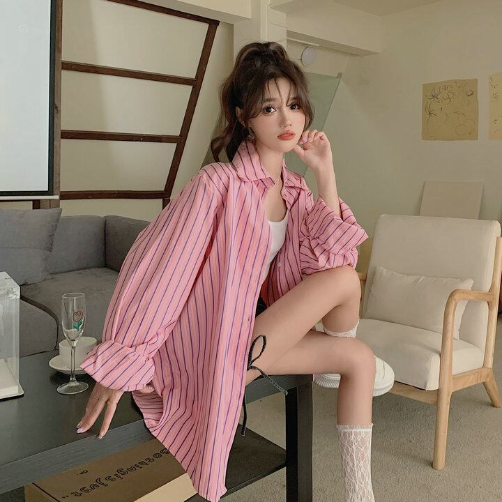 ピンクのストライプの日焼け止めシャツジャケット女性の夏ルーズカジュアルアウターウェアミッドレングス日焼け止め服薄部長袖シャツ ロング サマー 夏物 7460075728273612 | framboise21