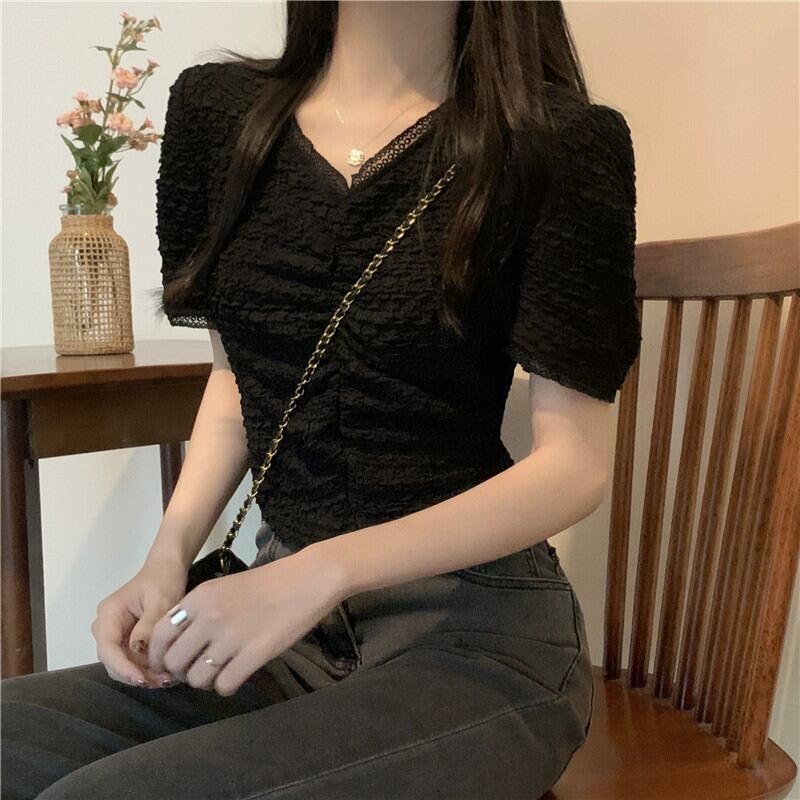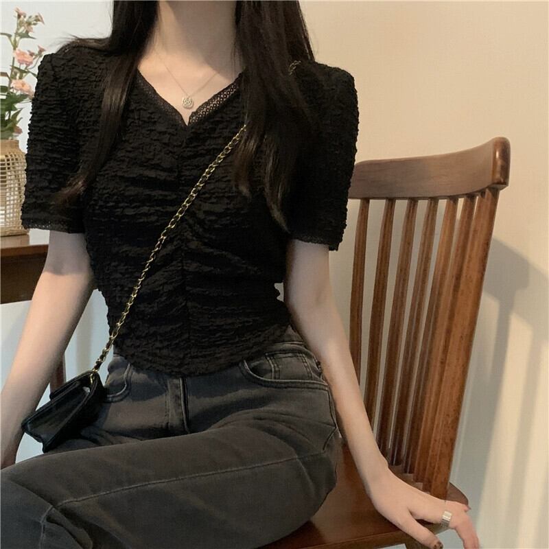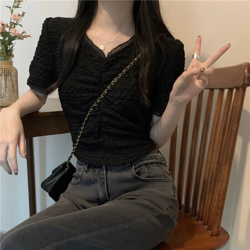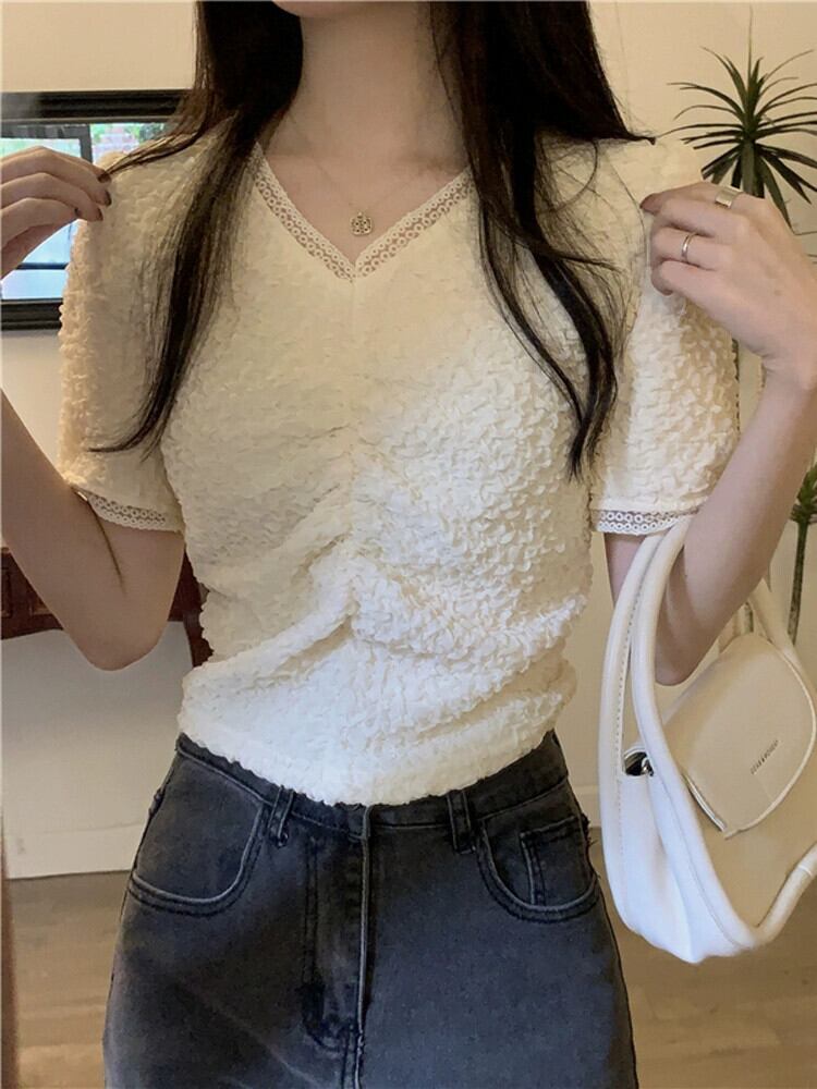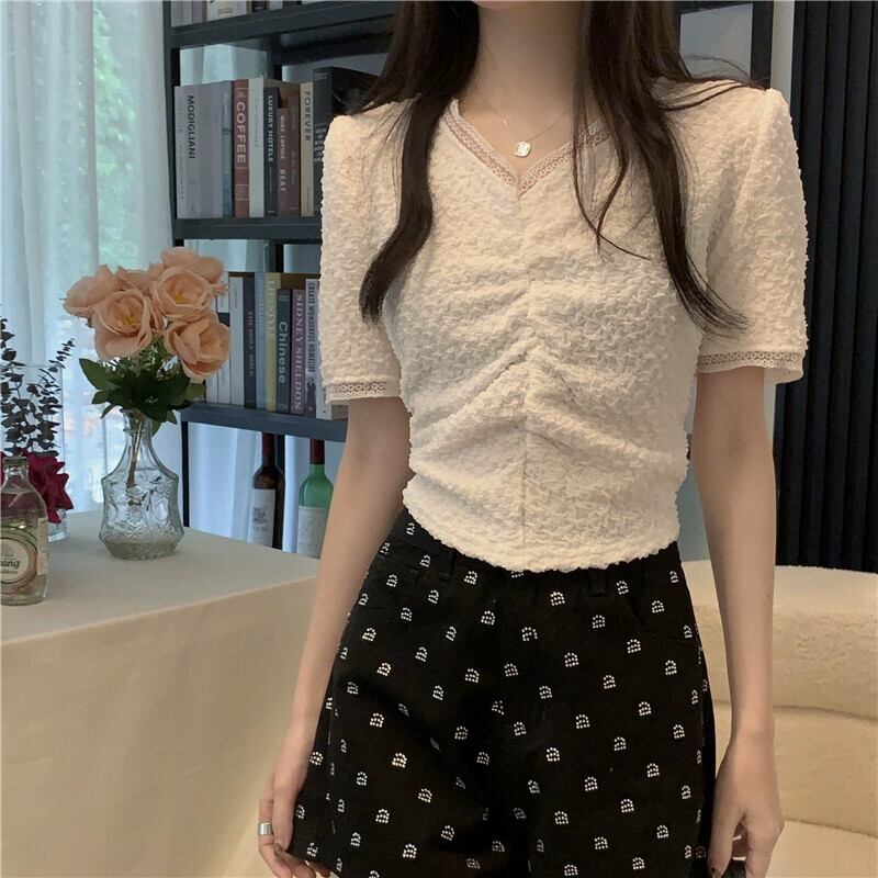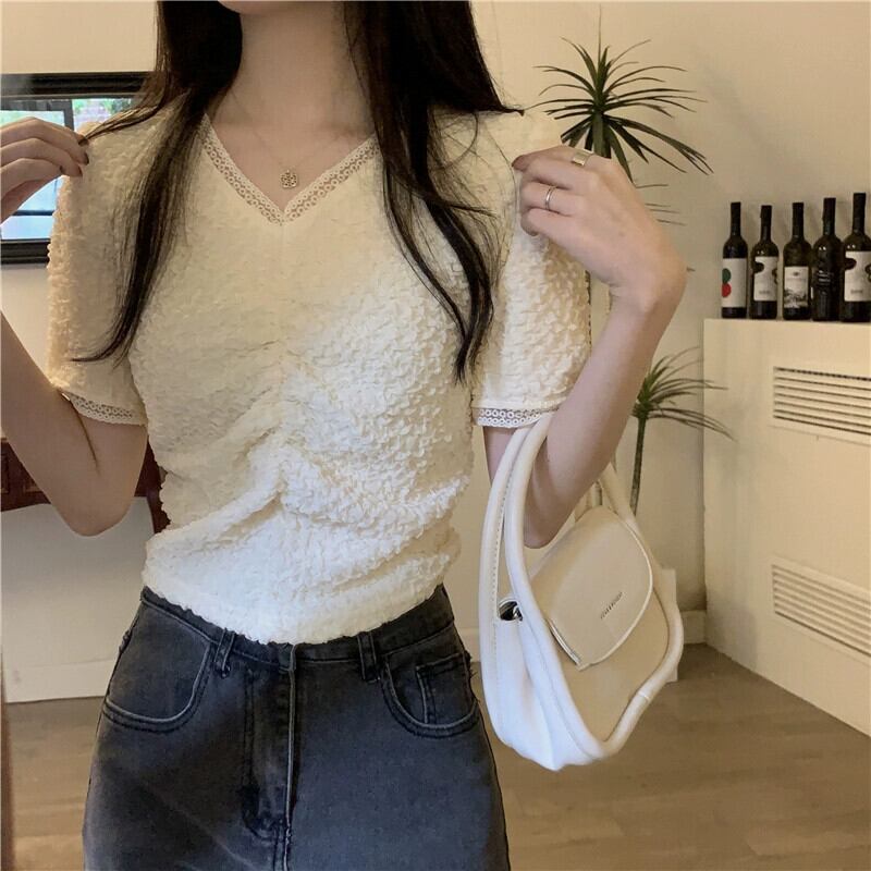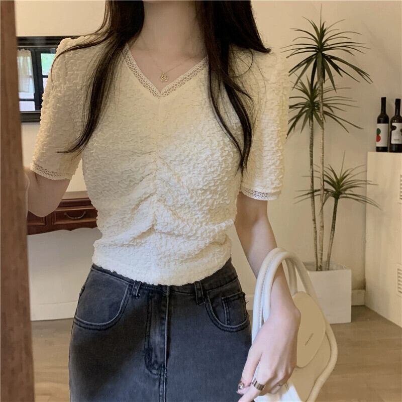 ショルダーレース V ネック半袖 T シャツレディース夏フレンチファッションデザインスリムフィットしわショートイレギュラートップ サマー 夏物 Vネック Tシャツ 7460067594147297 | framboise21