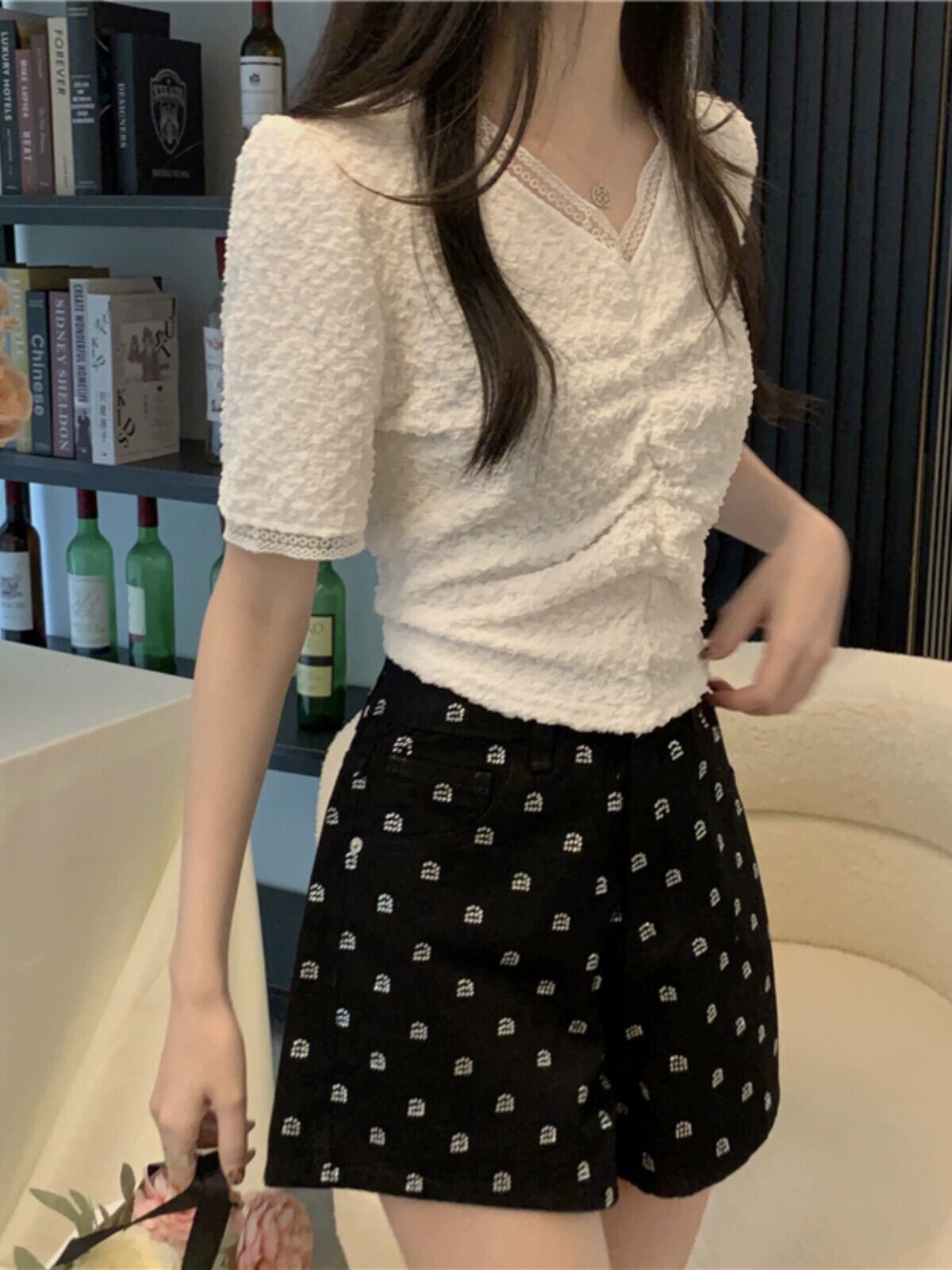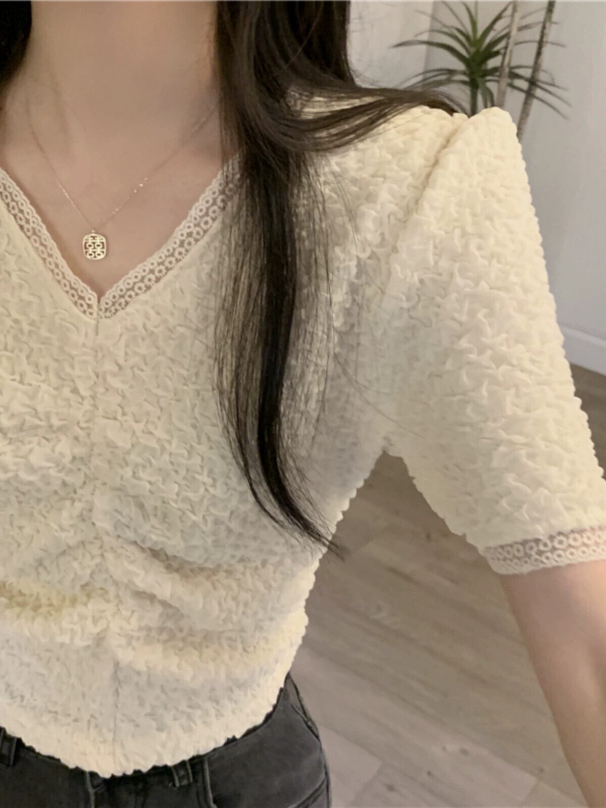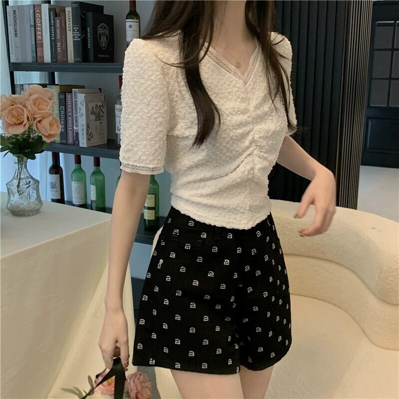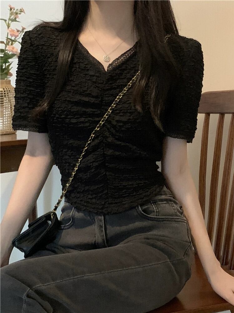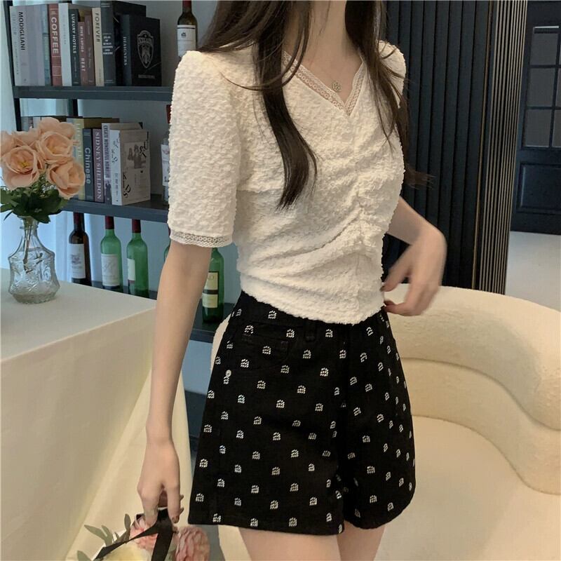 ショルダーレース V ネック半袖 T シャツレディース夏フレンチファッションデザインスリムフィットしわショートイレギュラートップ サマー 夏物 Vネック Tシャツ 7460067594147297 | framboise21