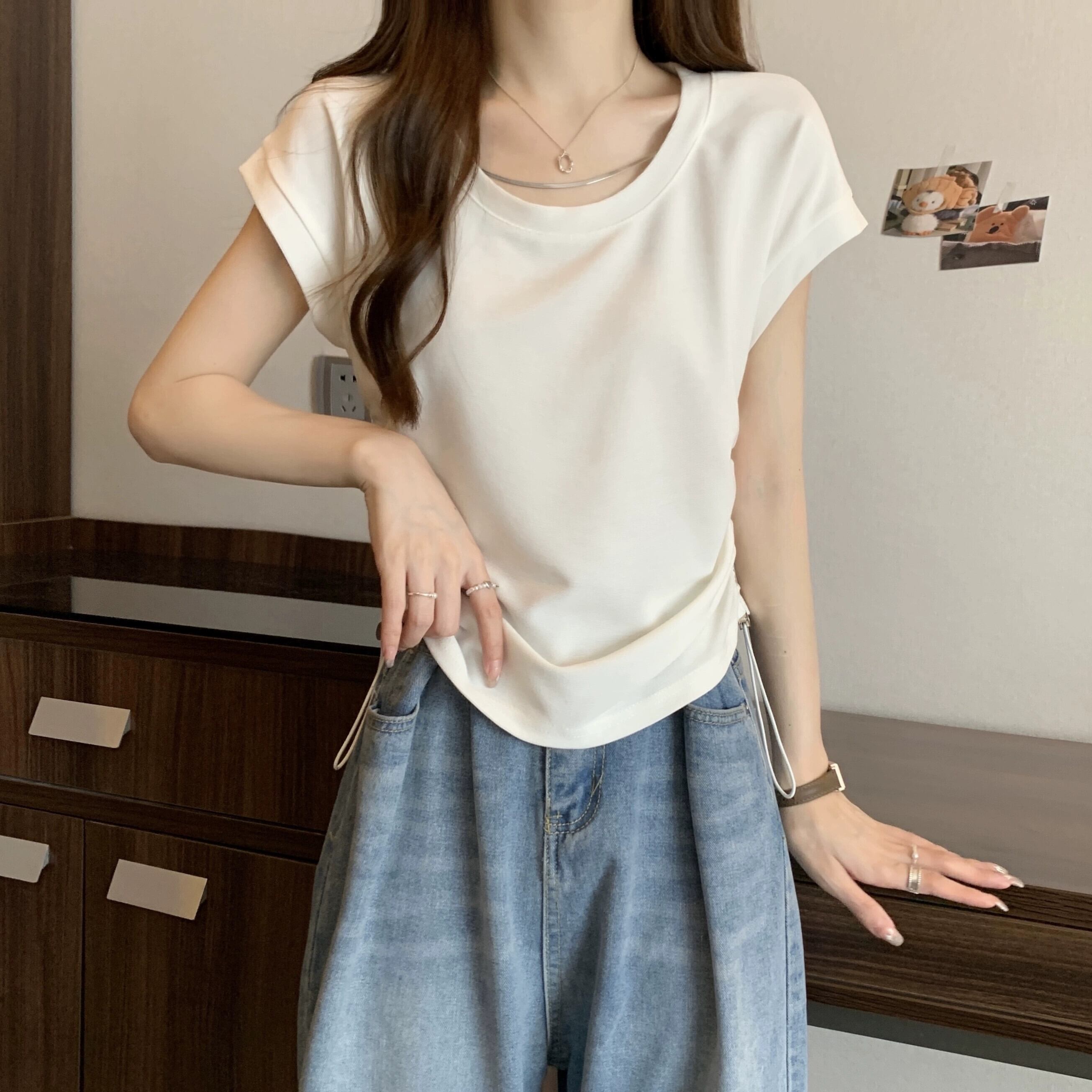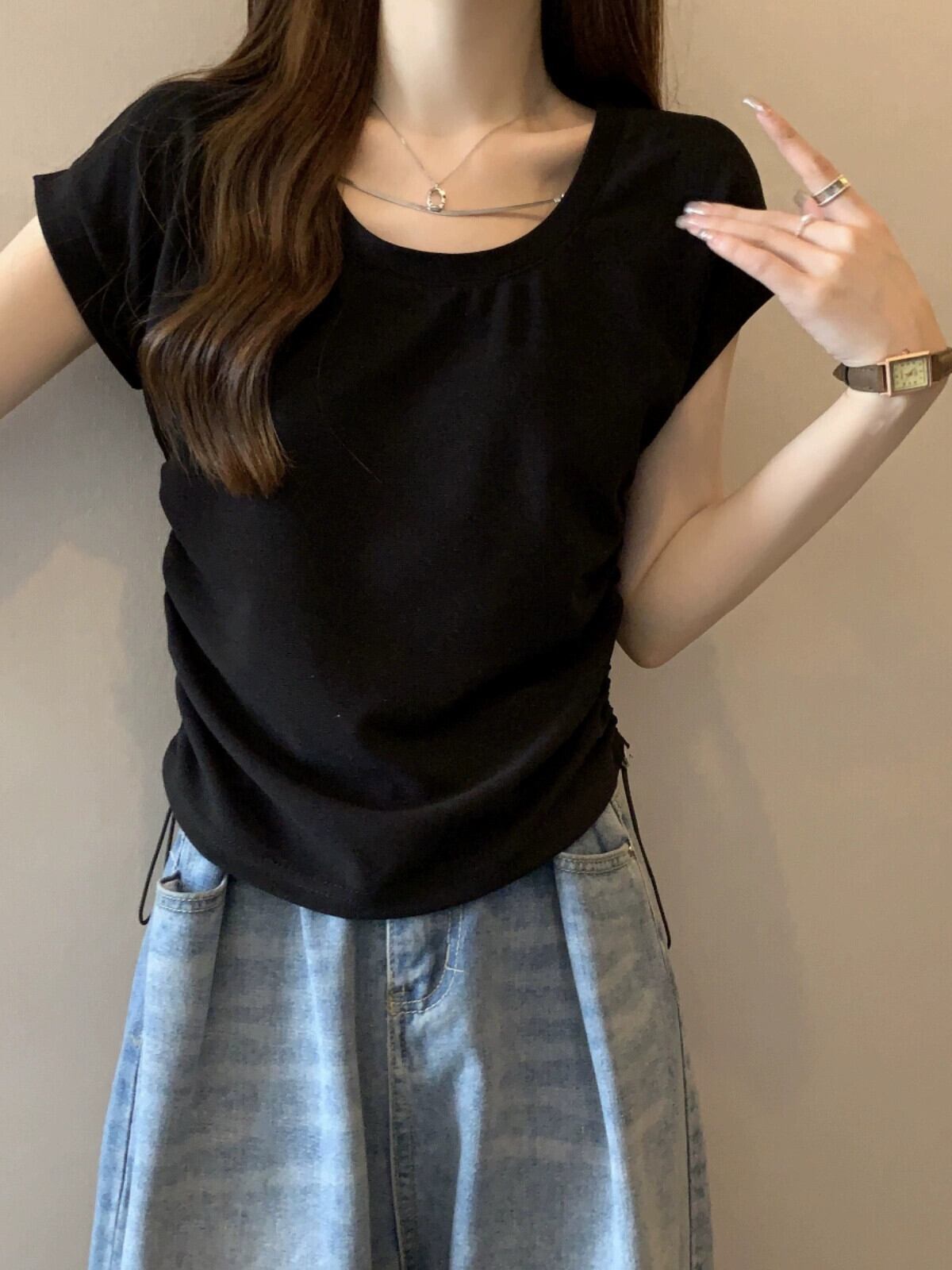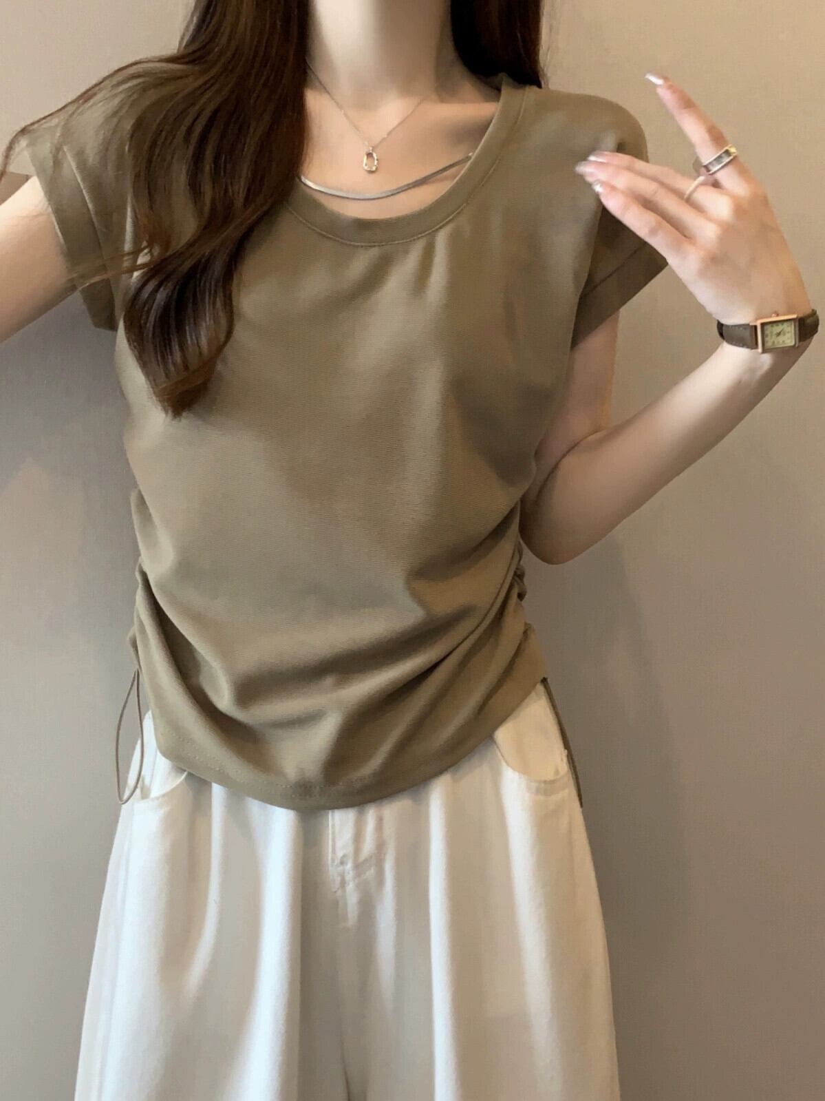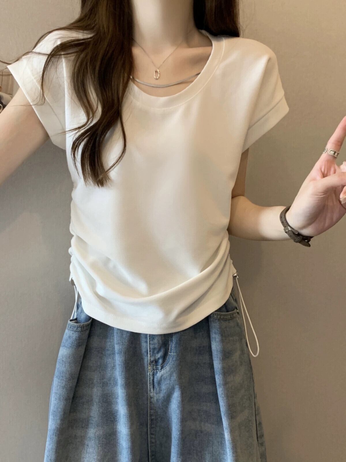 不規則なフロントショルダードローストリング半袖Tシャツレディース2023年夏新しいデザインセンスゆったりと多用途のコットンラウンドネックトップ サマー 夏物 Oネック 7460028347389932 | framboise21