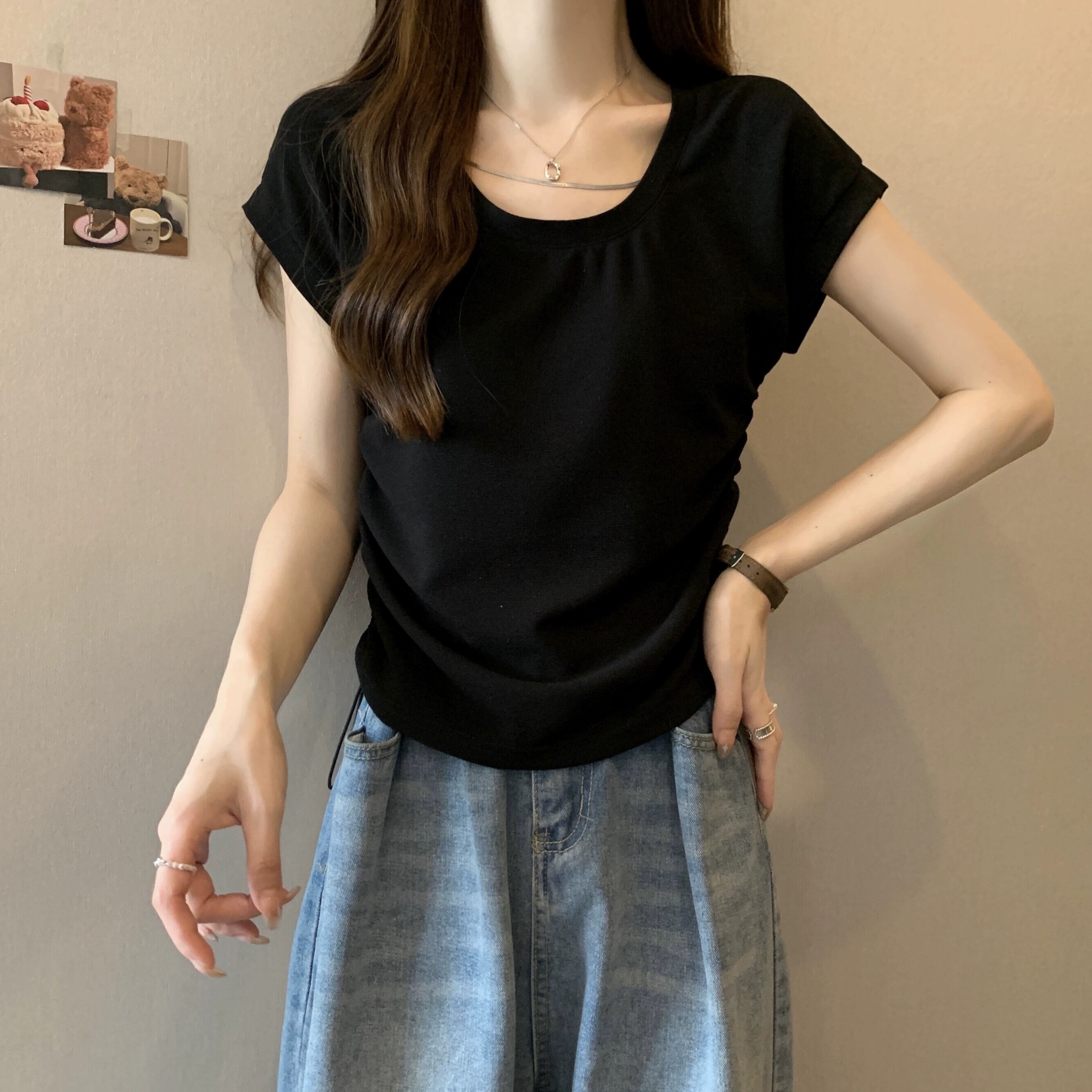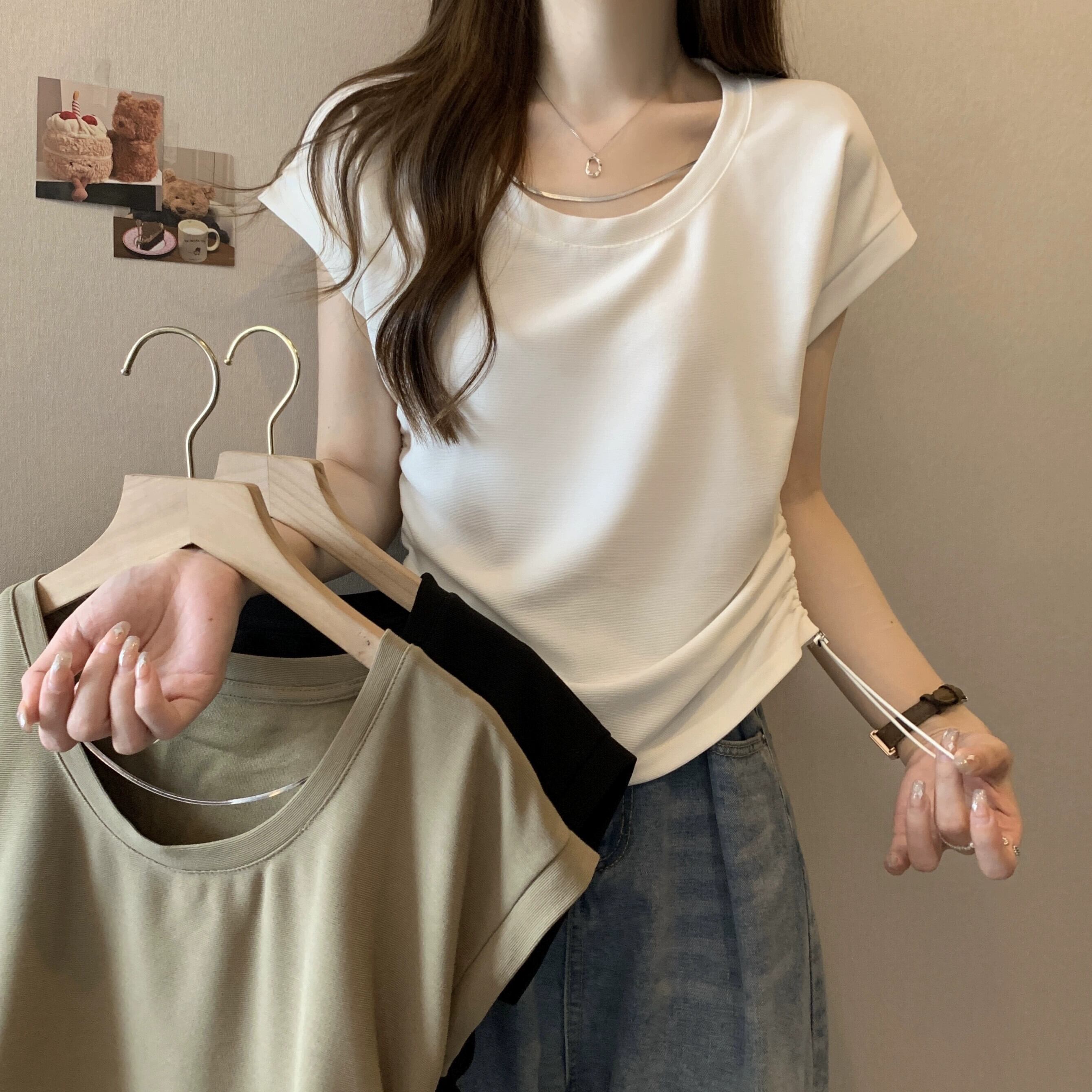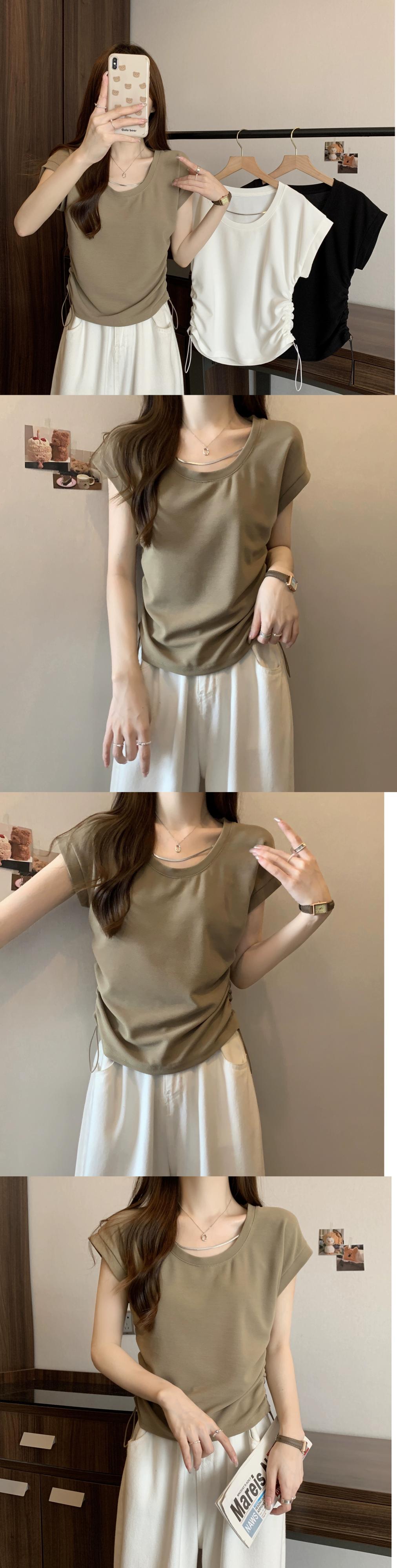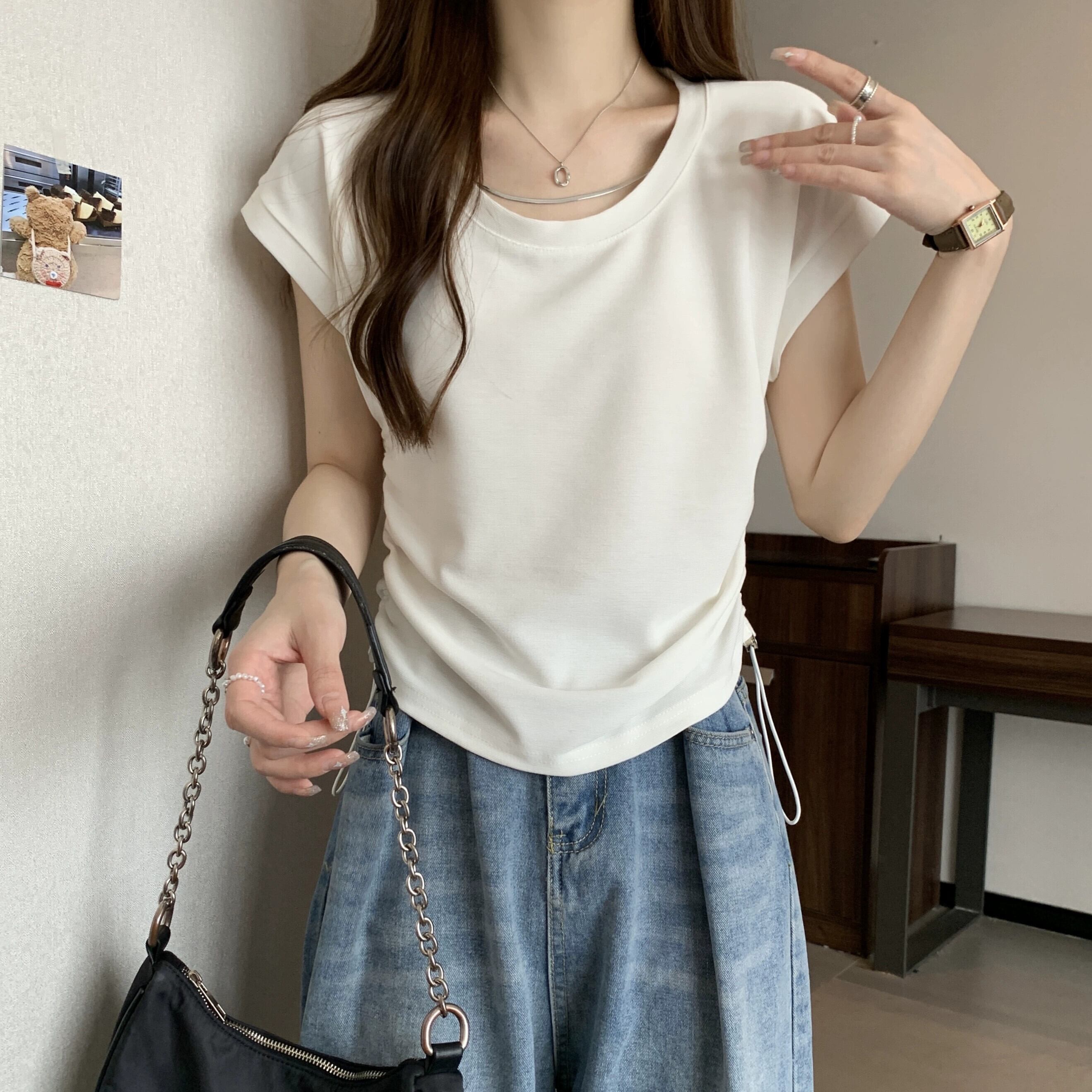 不規則なフロントショルダードローストリング半袖Tシャツレディース2023年夏新しいデザインセンスゆったりと多用途のコットンラウンドネックトップ サマー 夏物 Oネック 7460028347389932 | framboise21