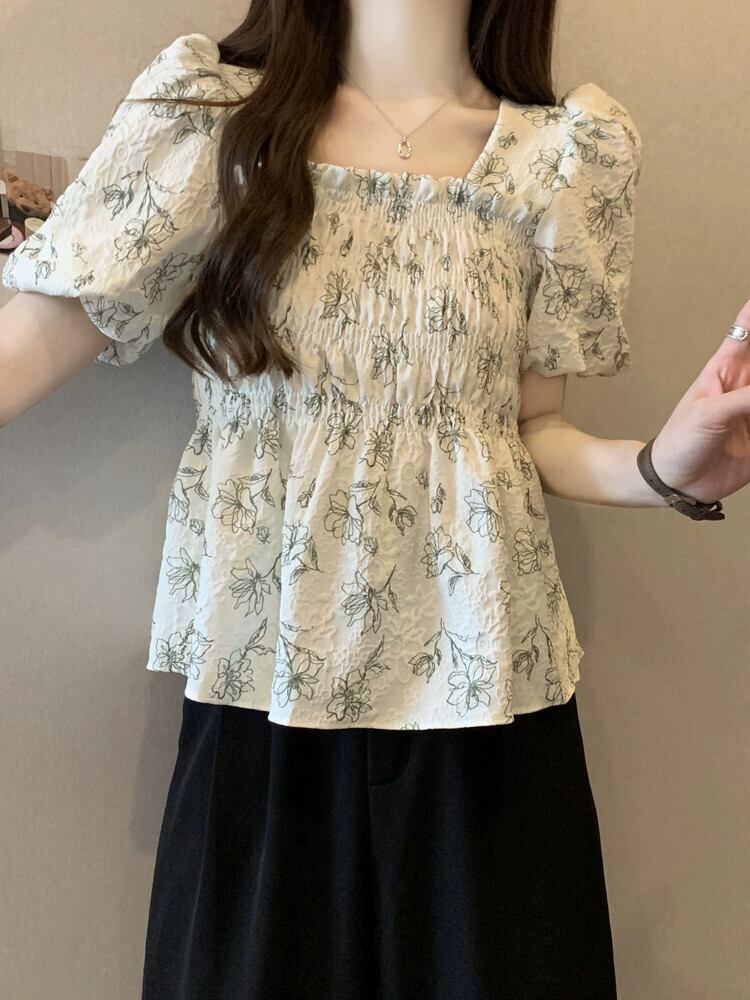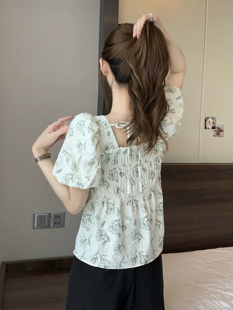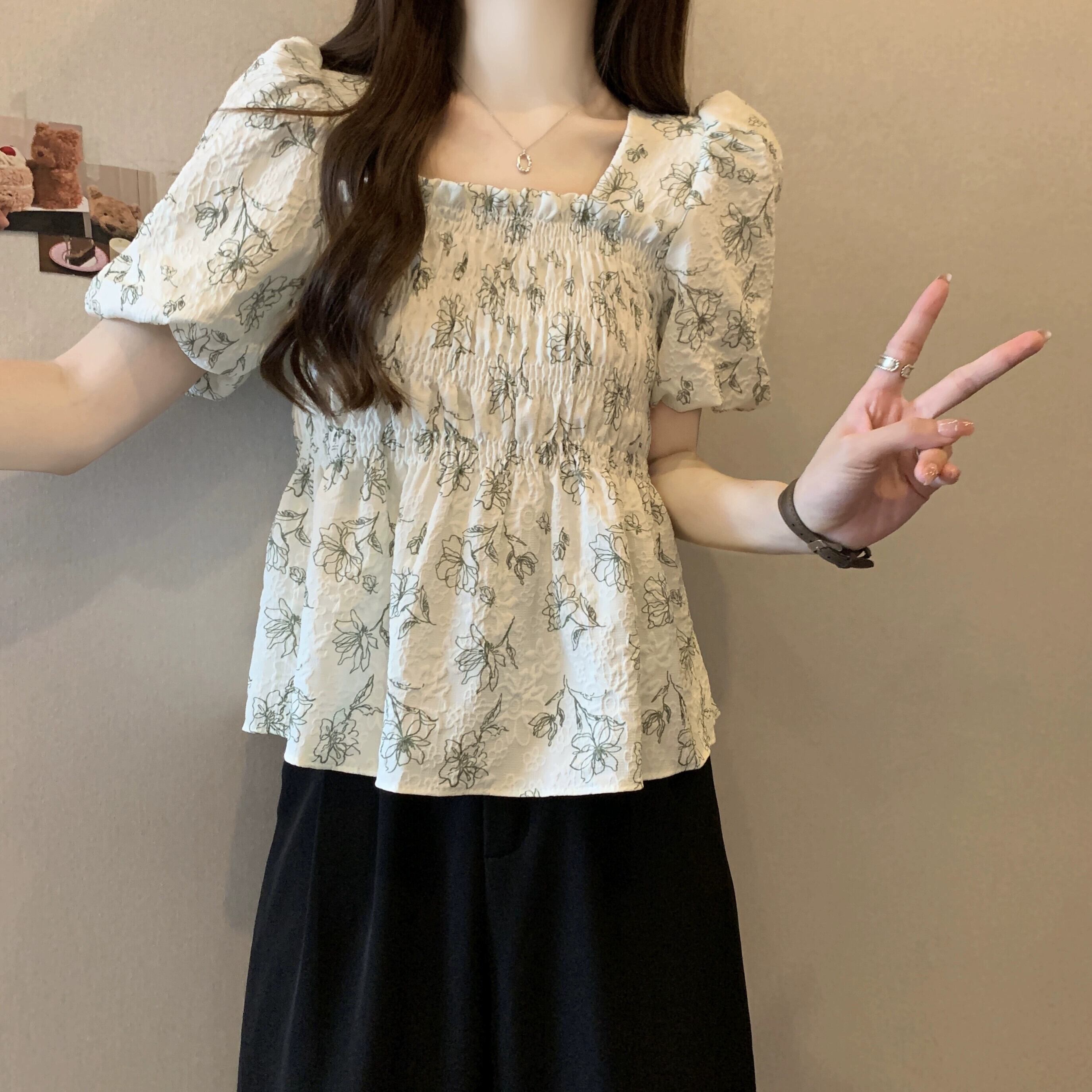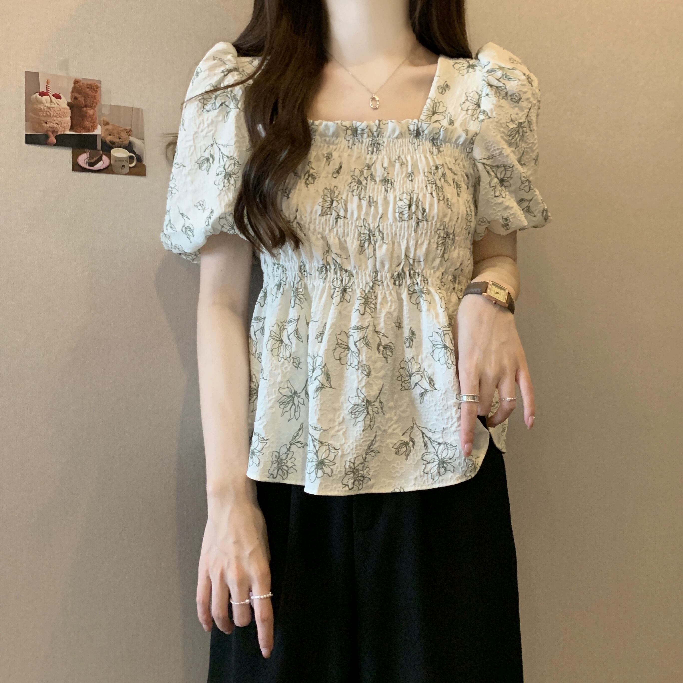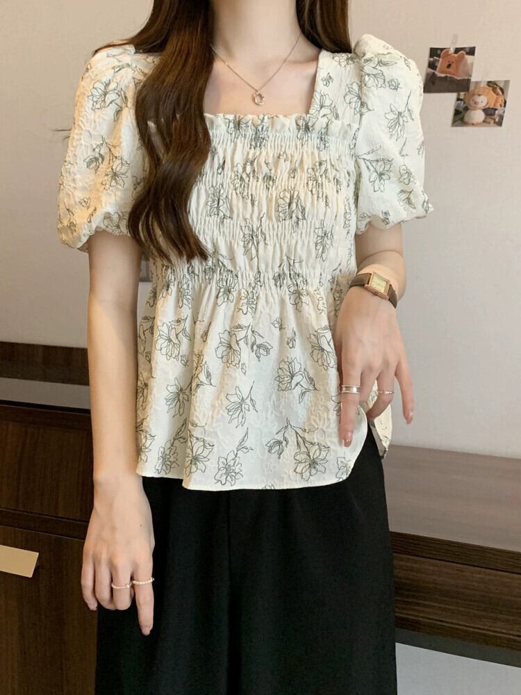 フレンチスクエアカラー半袖シャツレディース夏ルーズオールマッチデザインパフスリーブシャツショートセクションフローラルトップ潮 サマー 夏物 花柄 スクウェア 7460068250665420 | framboise21