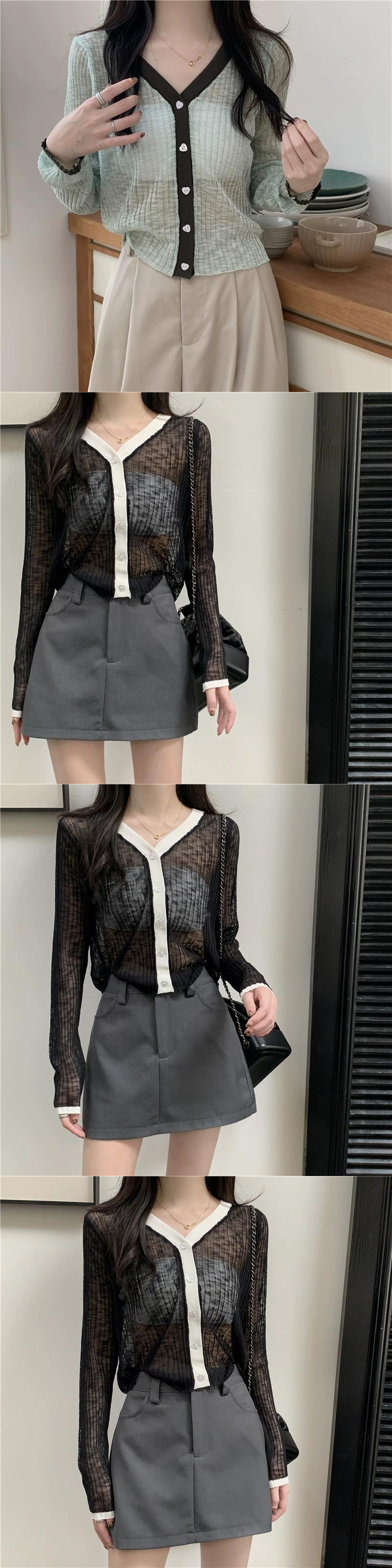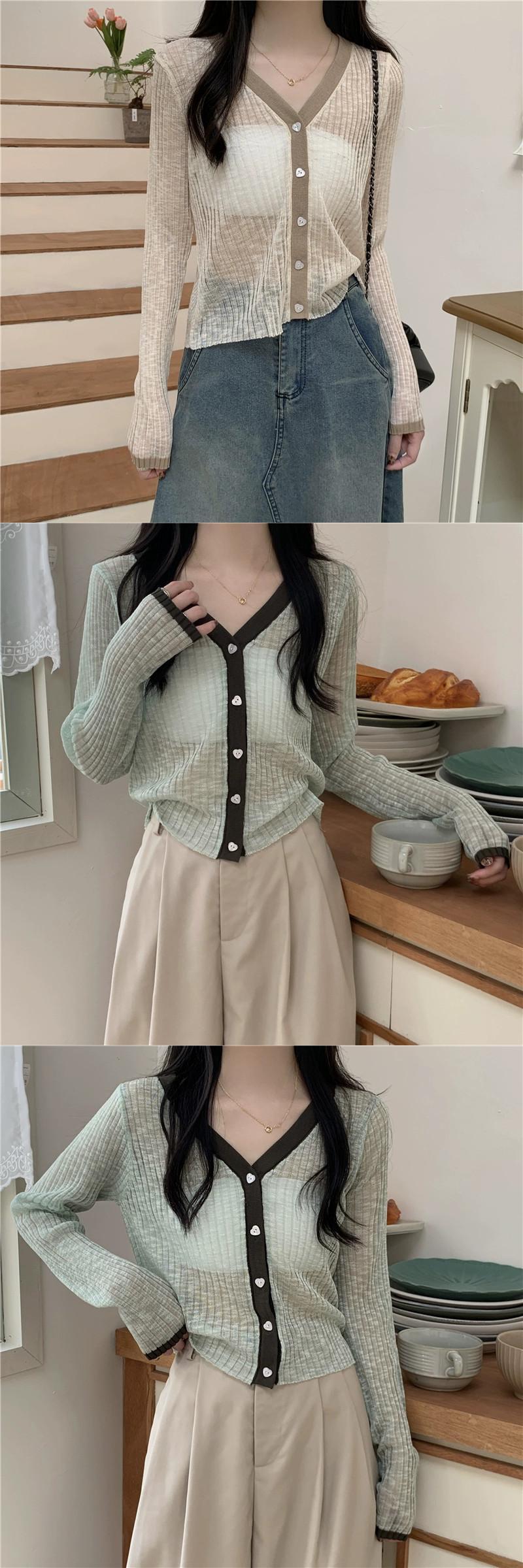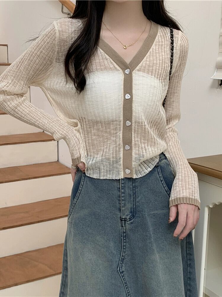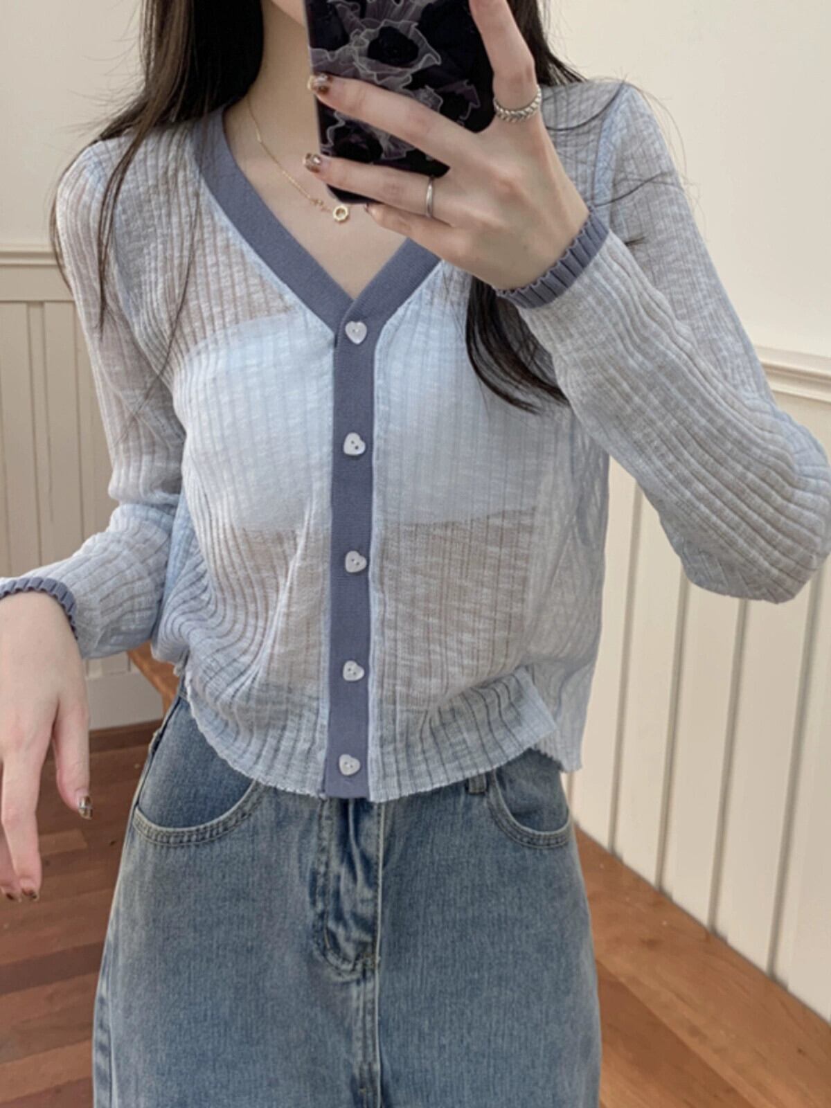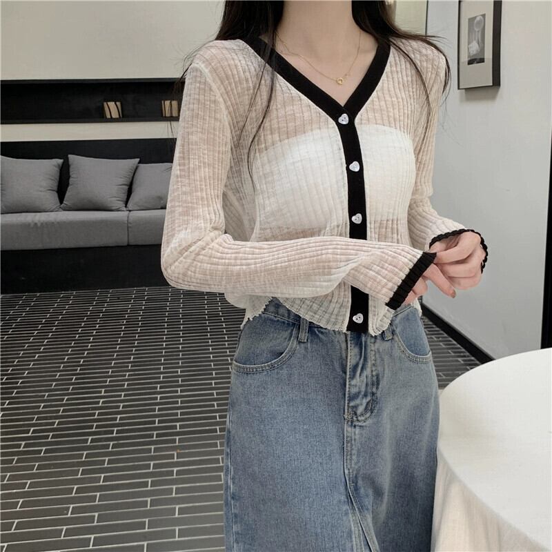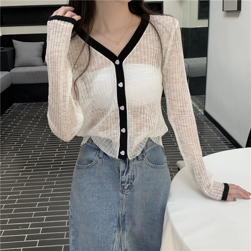 アイスシルク日焼け止めカーディガン薄いセクション女性の夏のルーズアウターニット空調セータージャケット対照的なカラー V ネックセータージャケット サマー 夏物 Vネック 7460054034929948 | framboise21