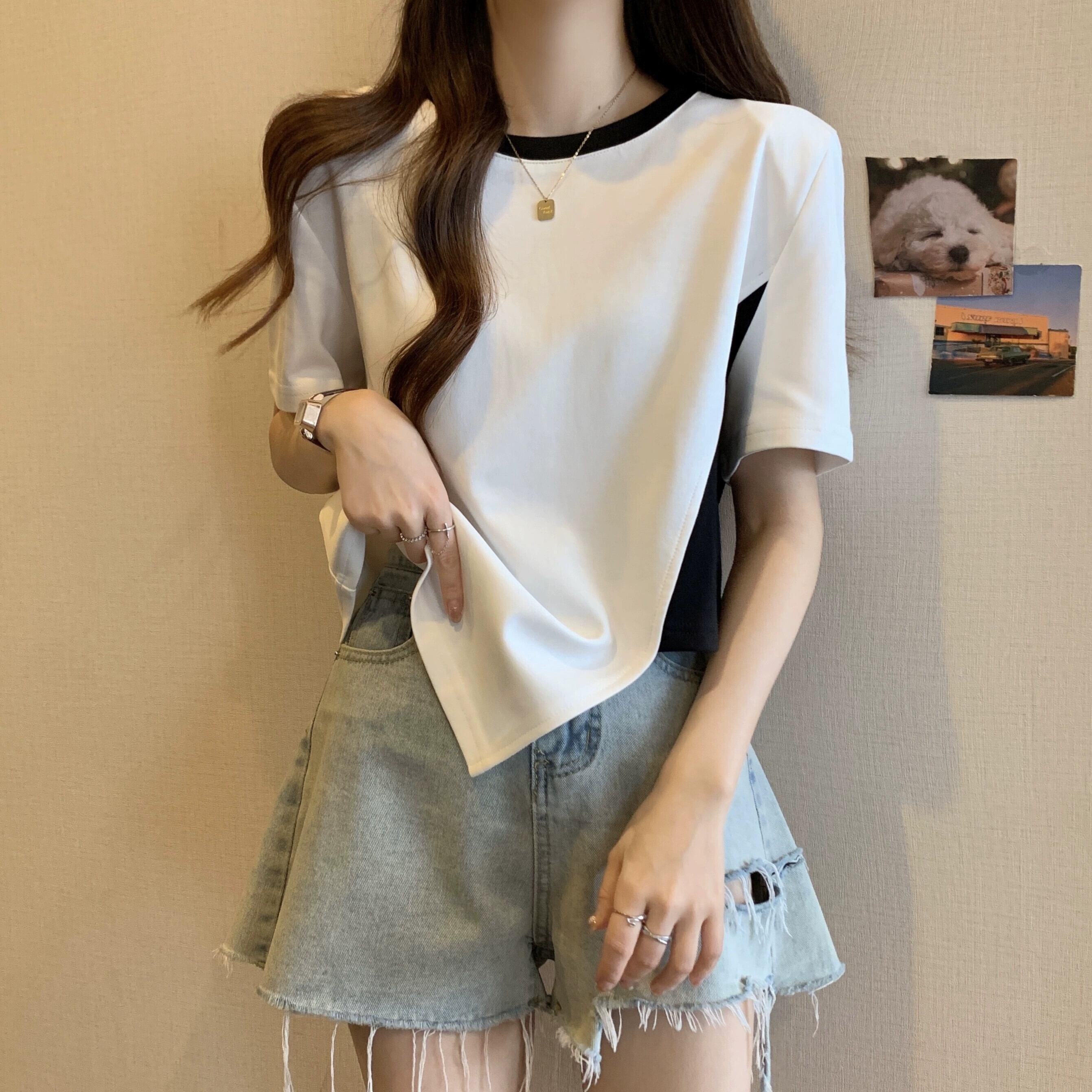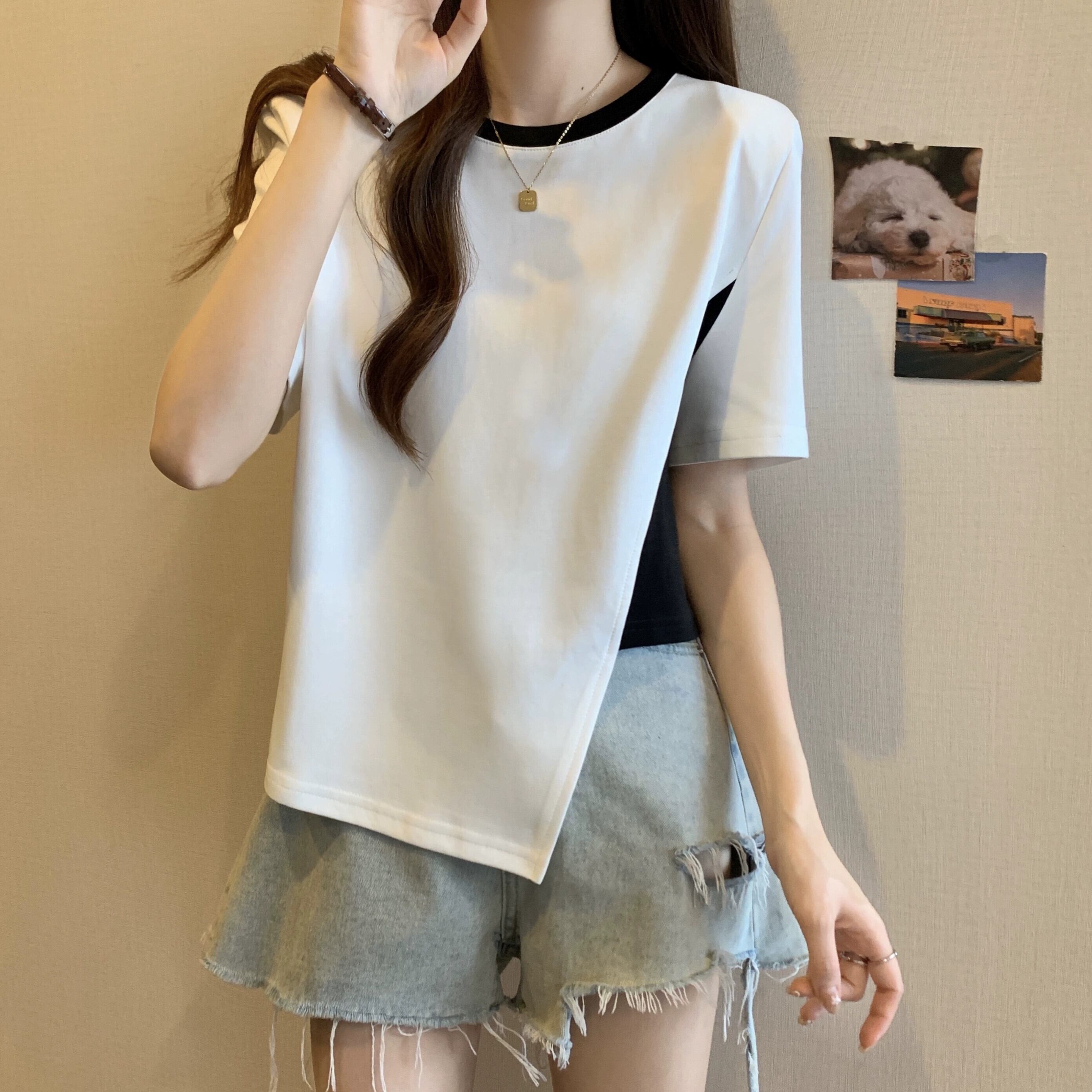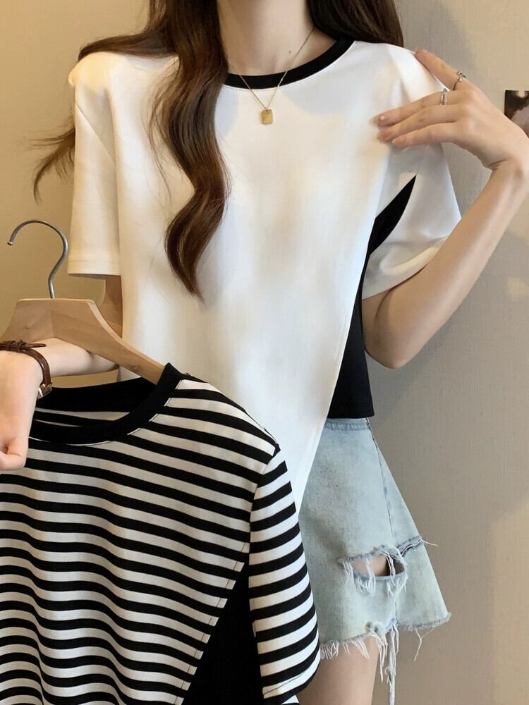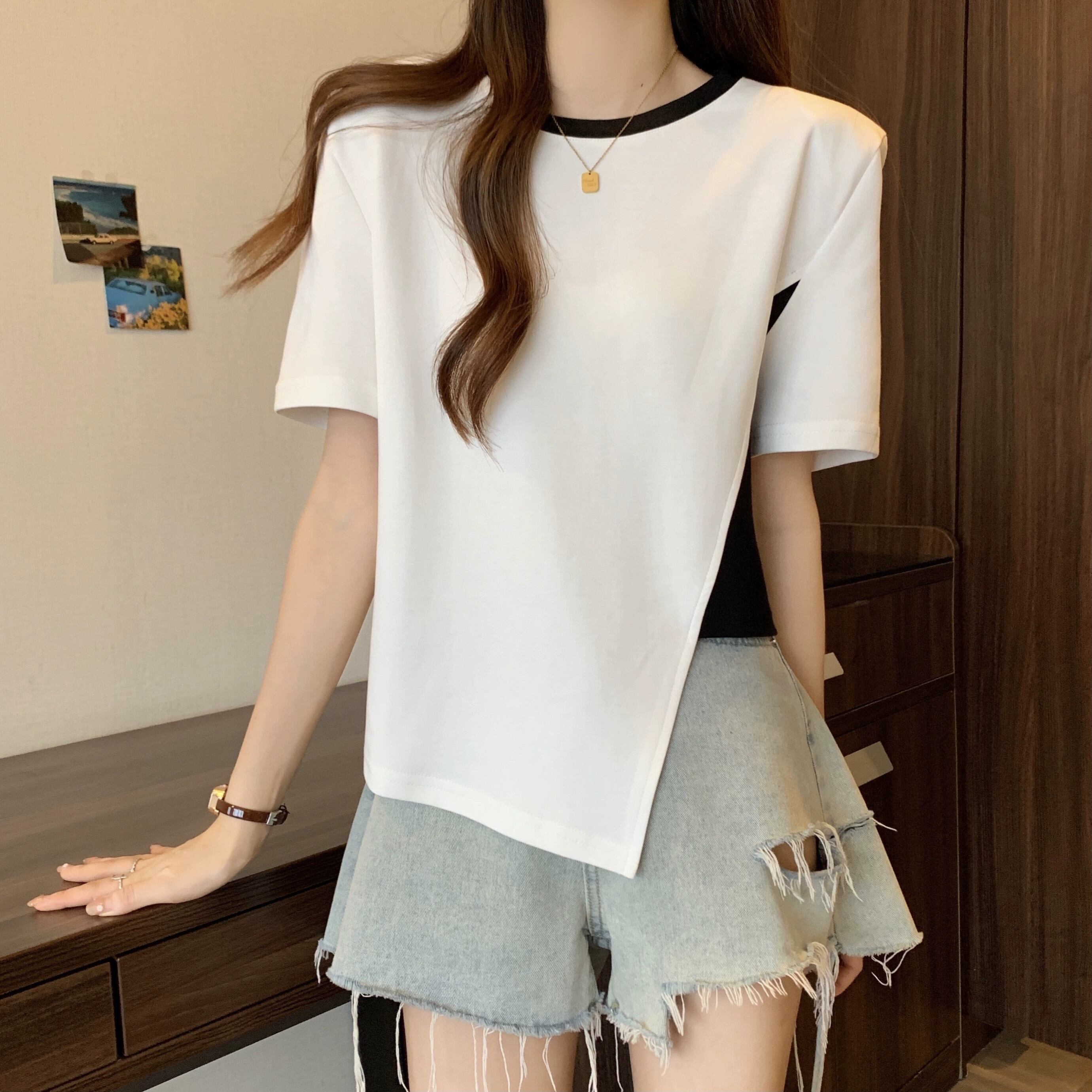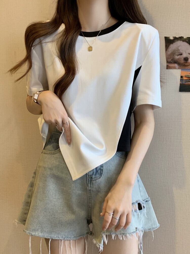 カラーブロッキング ラウンドネック 半袖 Tシャツ レディース 夏 アイン スタイル デザイン センス ニッチ ルーズ オールマッチ 不規則 フロント ショルダー トップス ホワイト サマー 夏物 Oネック 7460048882276608 | framboise21