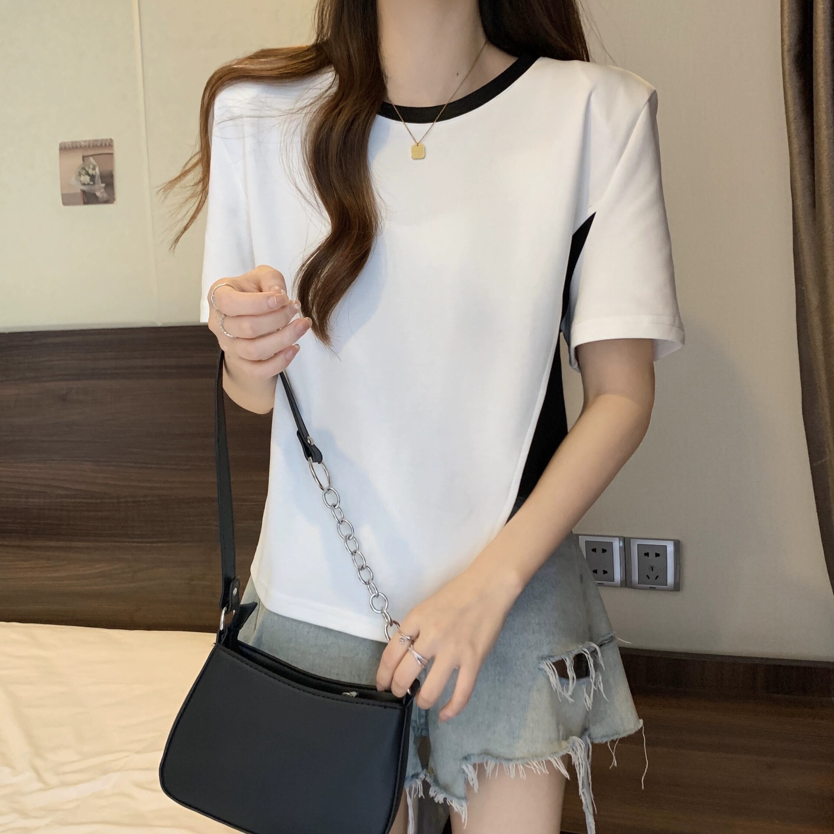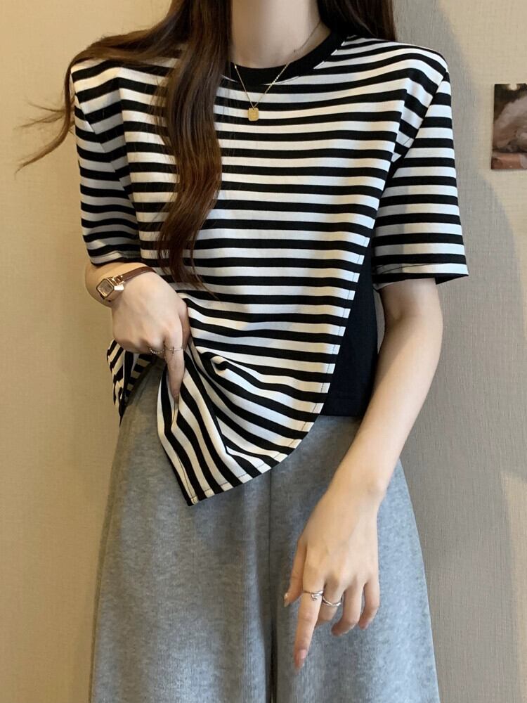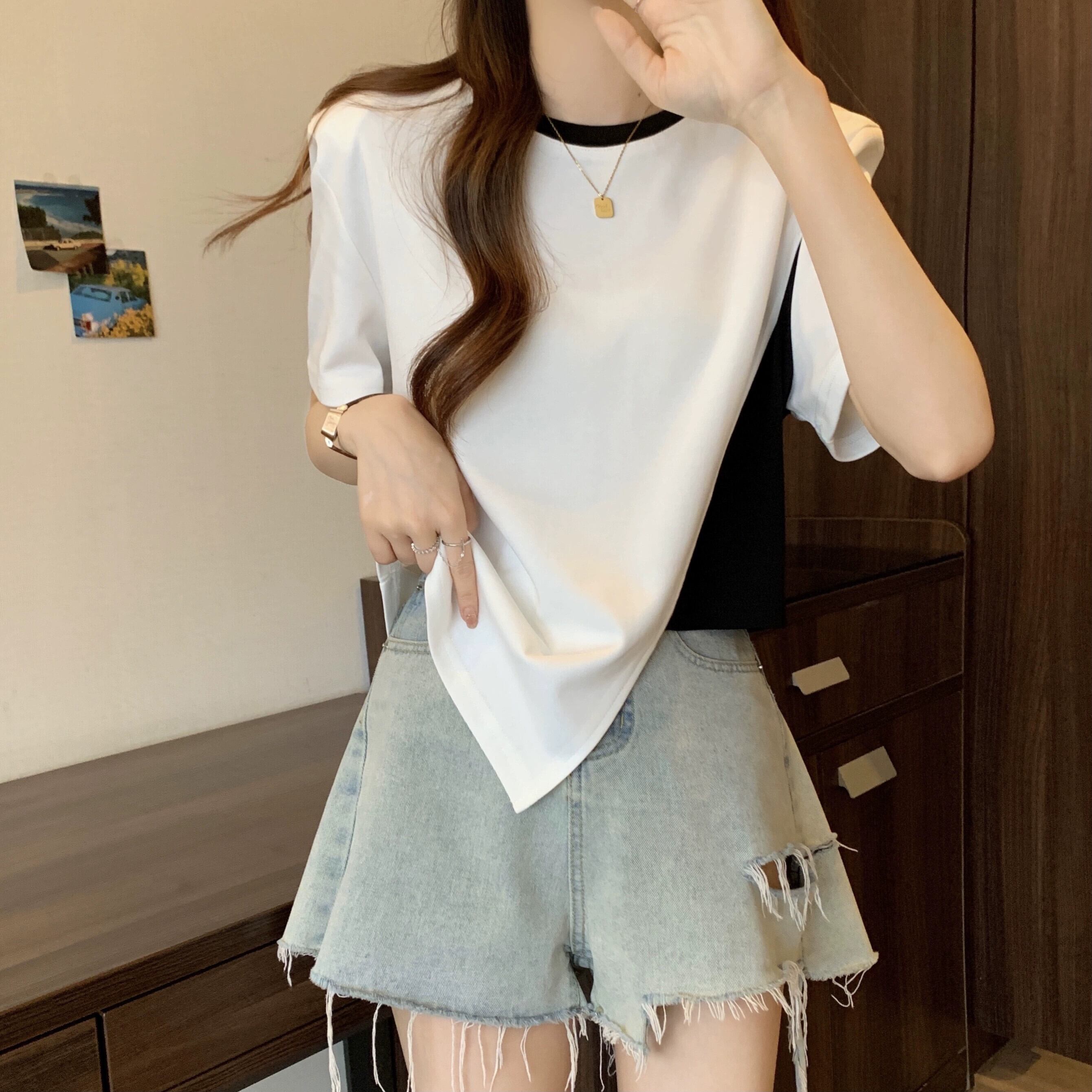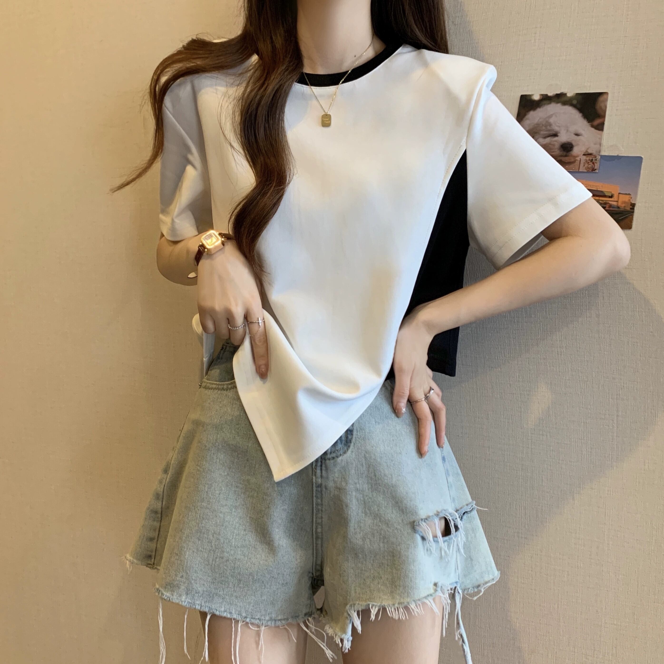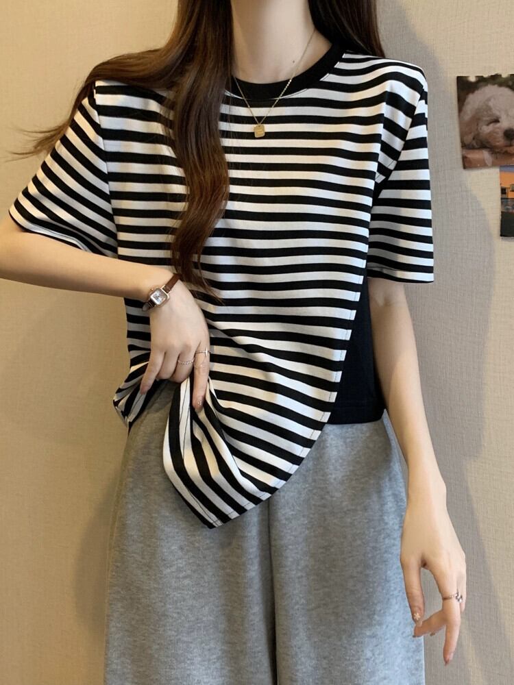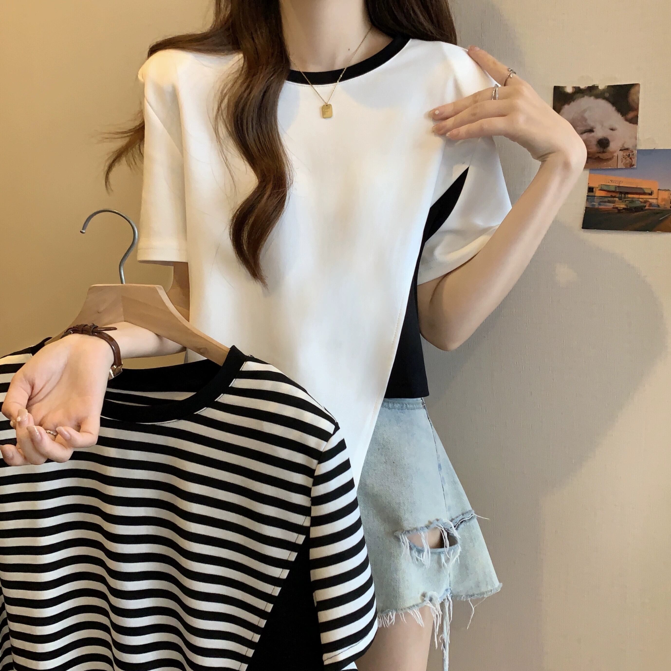 カラーブロッキング ラウンドネック 半袖 Tシャツ レディース 夏 アイン スタイル デザイン センス ニッチ ルーズ オールマッチ 不規則 フロント ショルダー トップス ホワイト サマー 夏物 Oネック 7460048882276608 | framboise21
