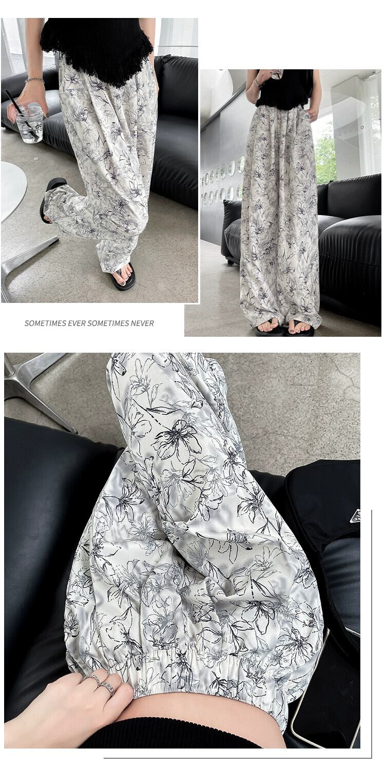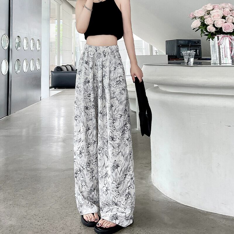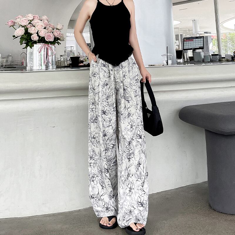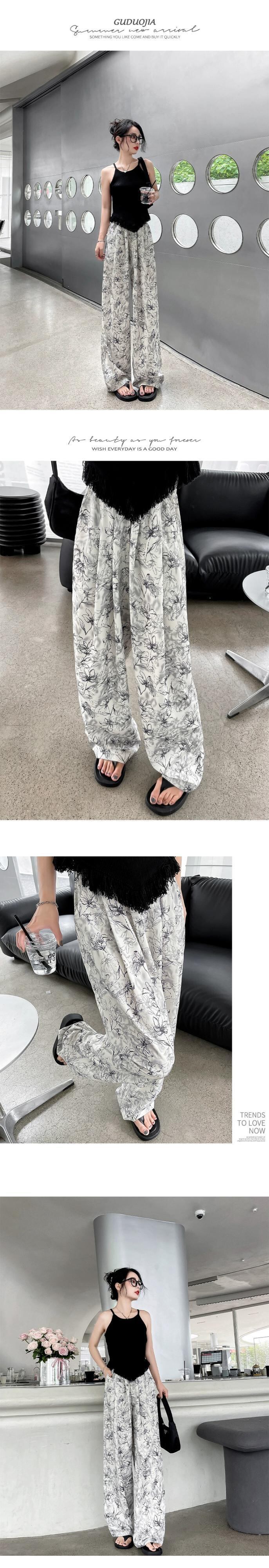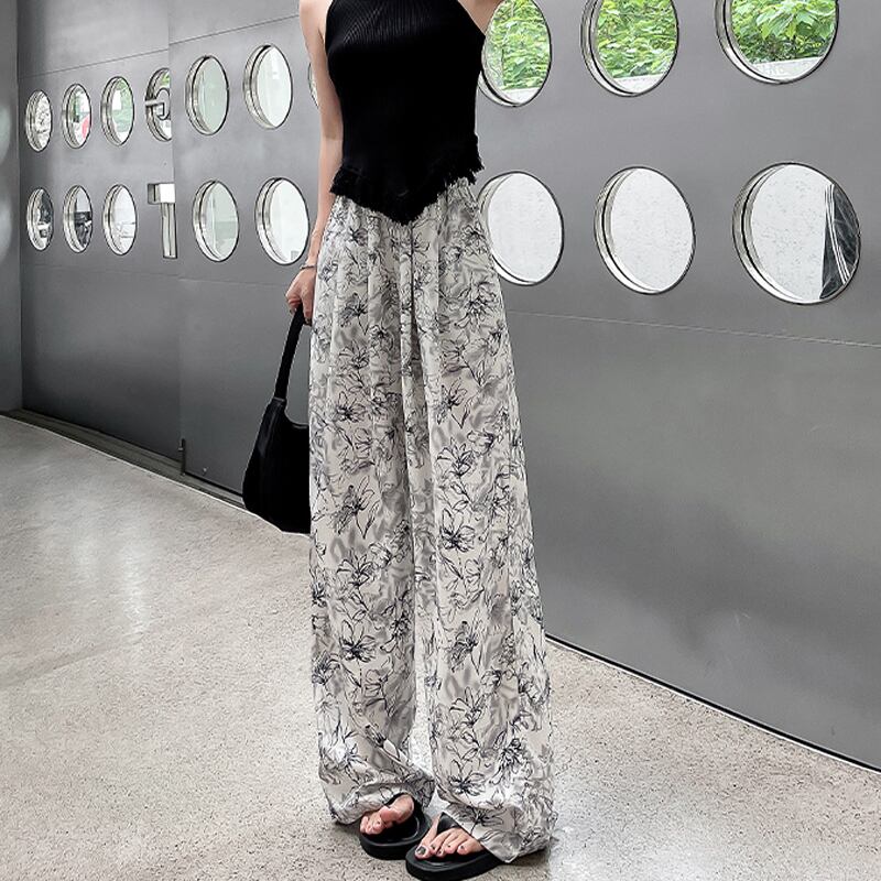 インク汚れ染めアイスシルクワイドレッグパンツレディース夏薄い国民風シフォンタイダイパンツストレートハイウエストドレープカジュアルパンツ ハイウェスト サマー 夏物 746002244523259 | framboise21