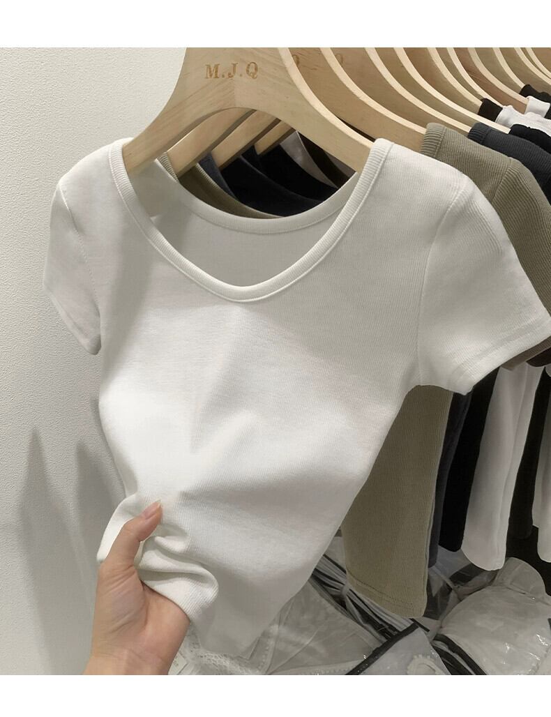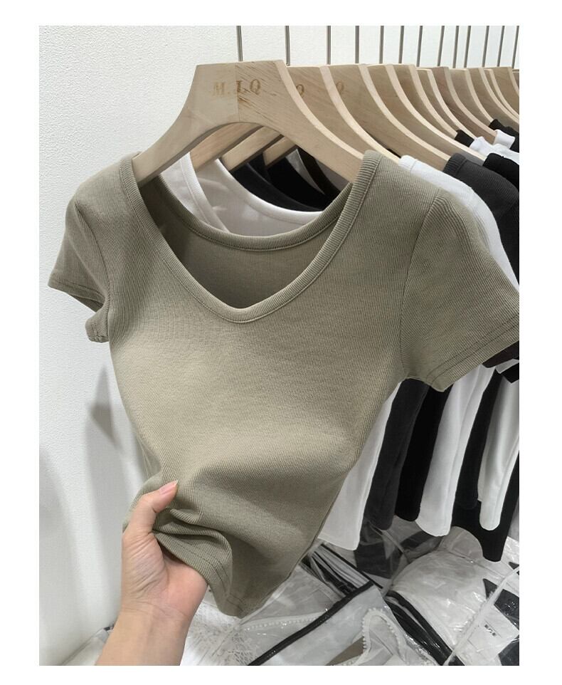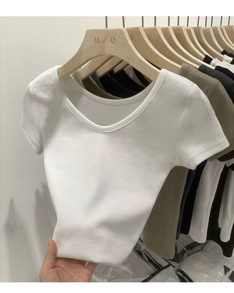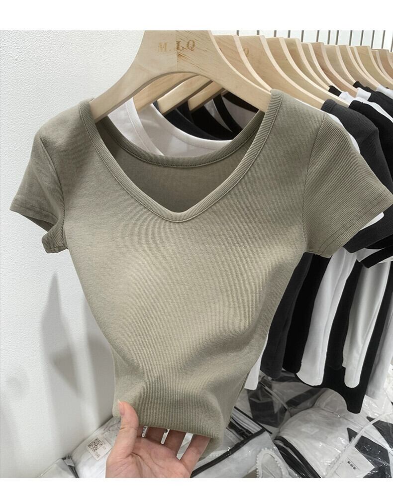 フロントショルダー半袖Tシャツレディース夏レトロスリムフィットオールマッチ甘辛小男ショート鎖骨Vネックトップ 大人ガーリー スウィート キュート カジュアル サマー 夏物 7460073115204095 | framboise21