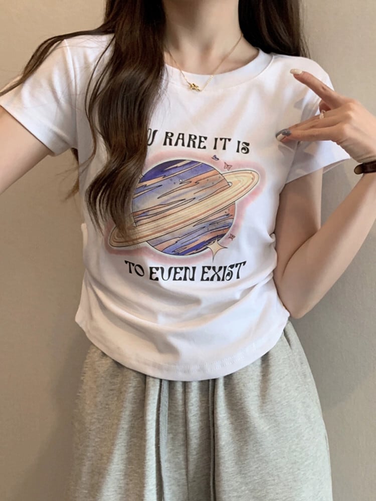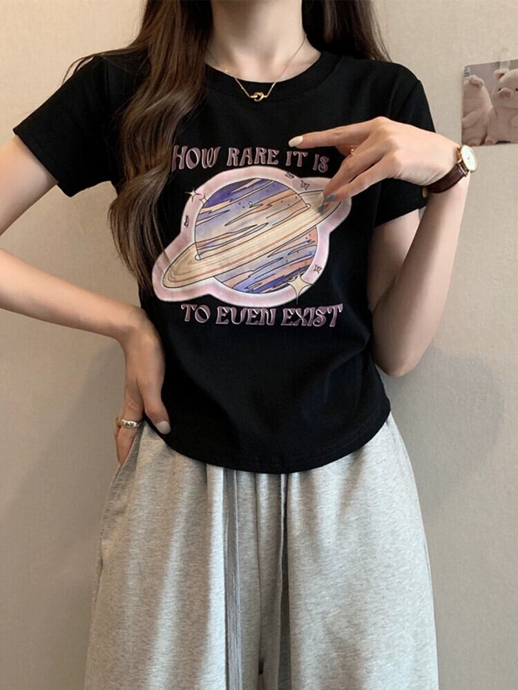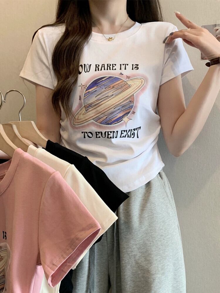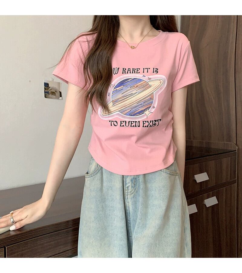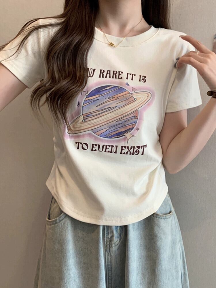 カーブヘム半袖 Tシャツレディース夏のファッションアインスタイルデザインセンススリムフィットフィッシュボーンフロントショルダープリントトップ サマー 夏物 746008427723161 | framboise21
