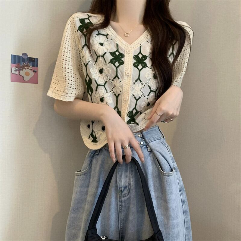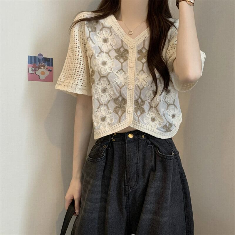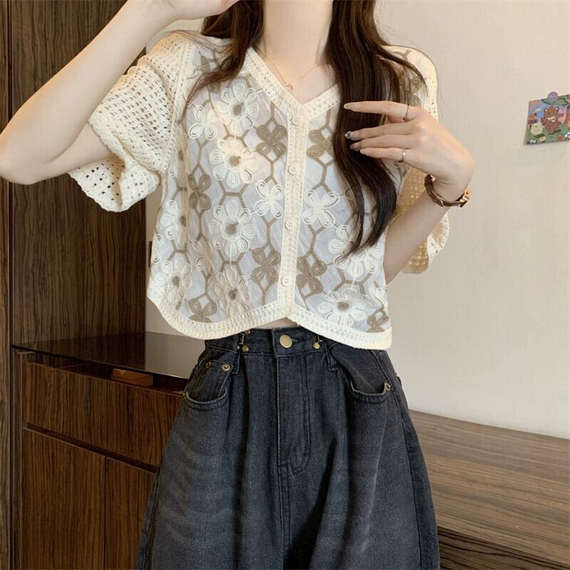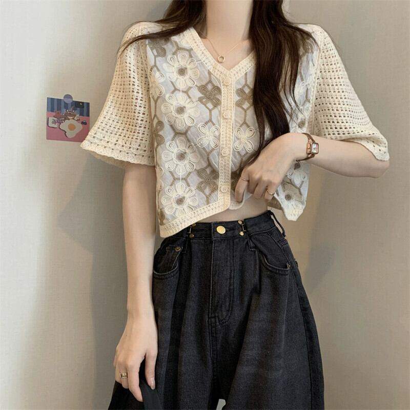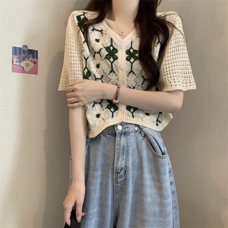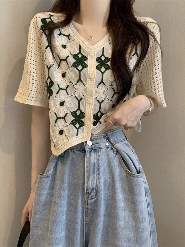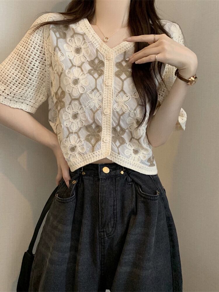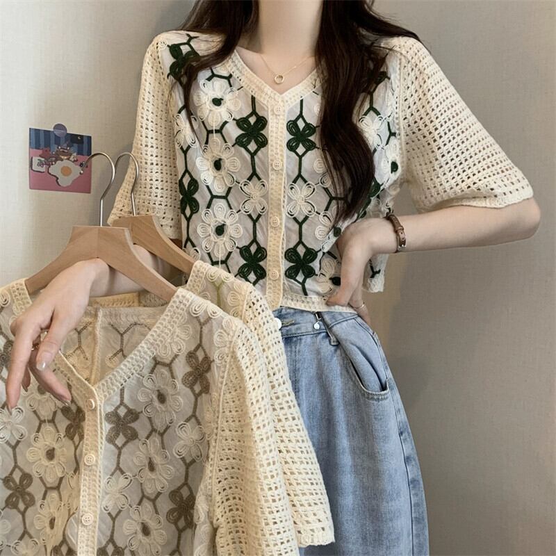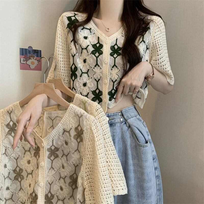 中空かぎ針編みニット半袖カーディガンレディース夏シックなアインスタイルルーズオールマッチショート不規則な V ネックトップ サマー 夏物 Vネック 7460094102994239 | framboise21