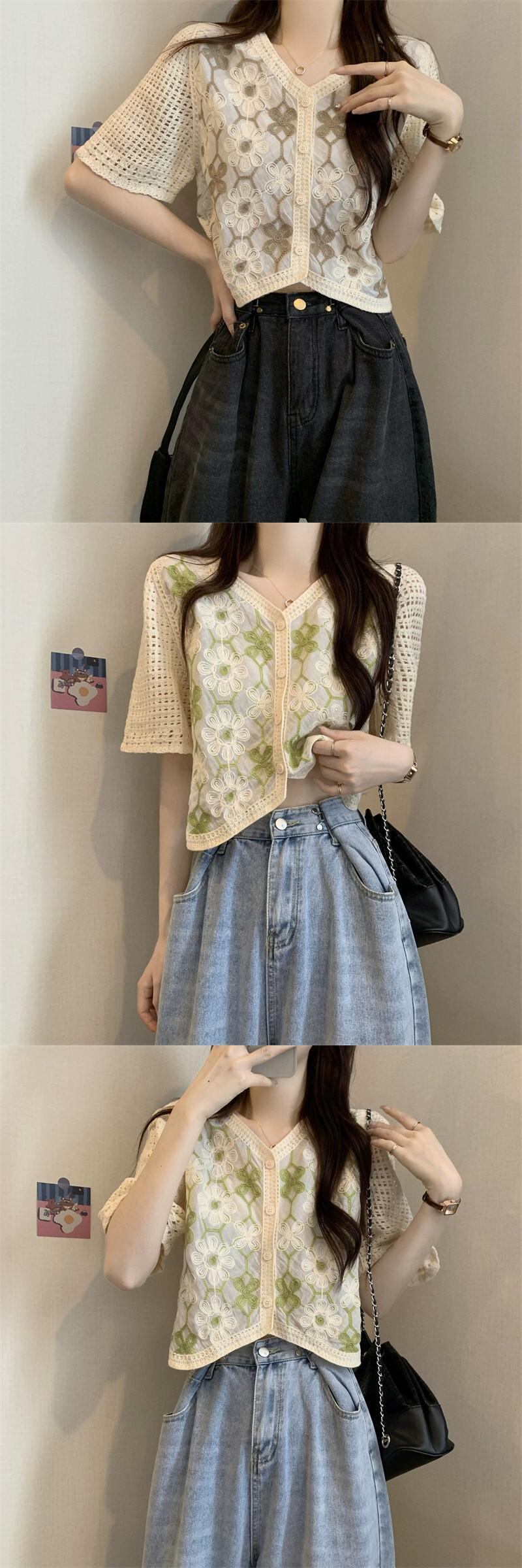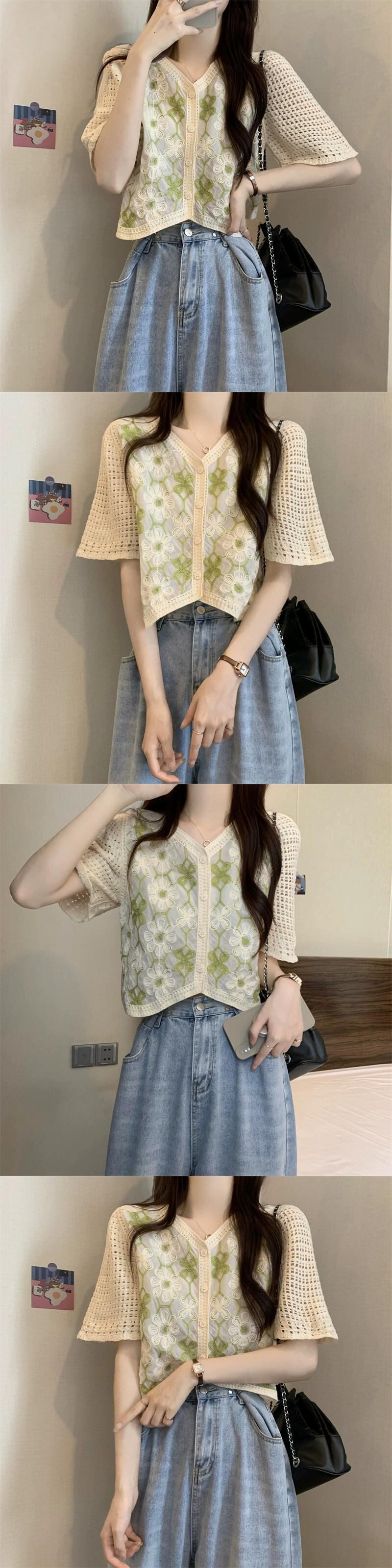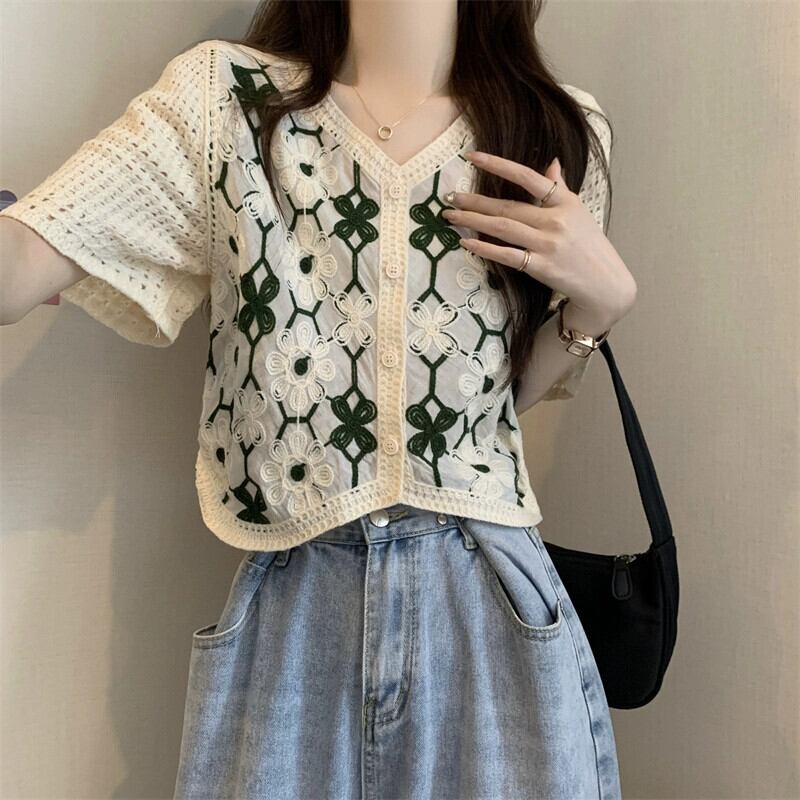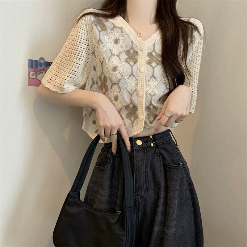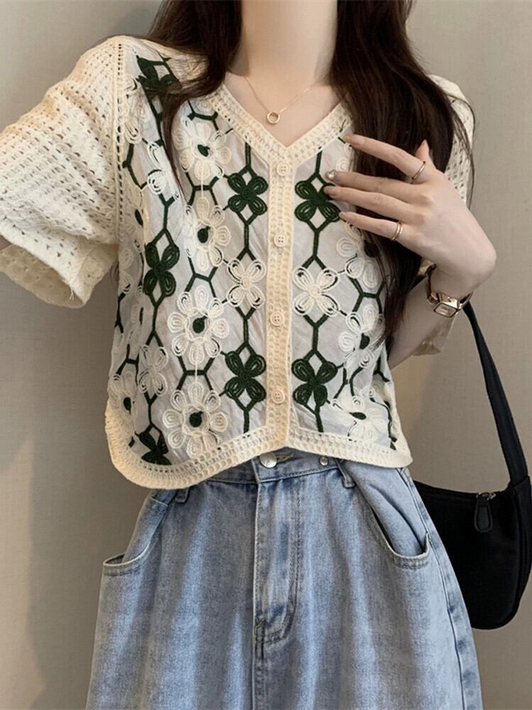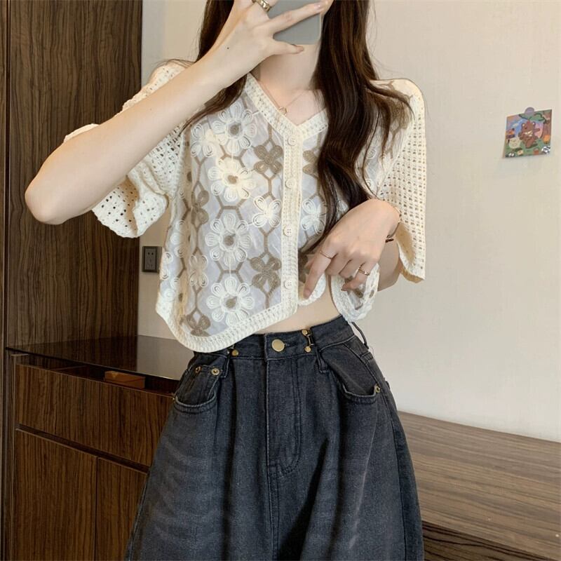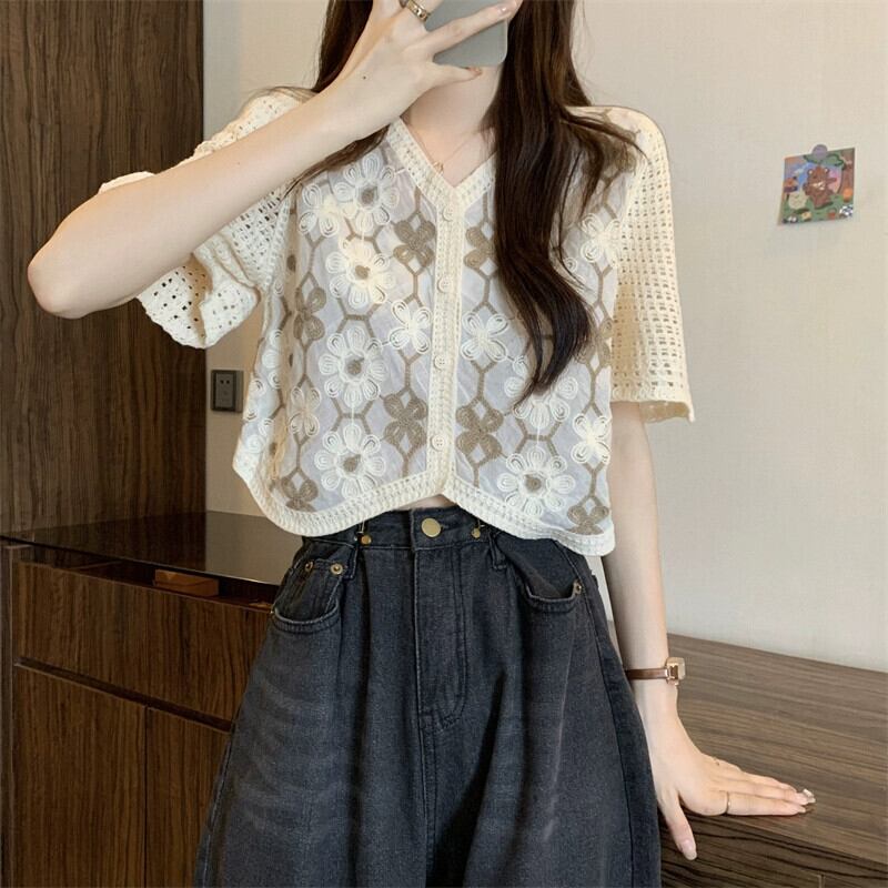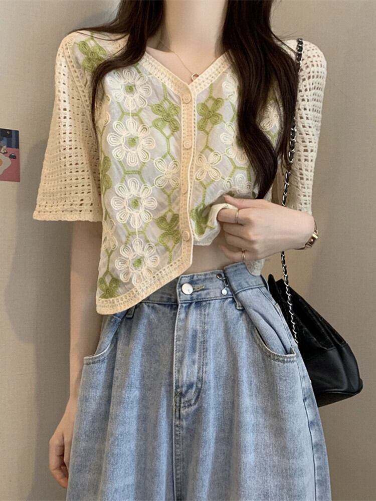 中空かぎ針編みニット半袖カーディガンレディース夏シックなアインスタイルルーズオールマッチショート不規則な V ネックトップ サマー 夏物 Vネック 7460094102994239 | framboise21