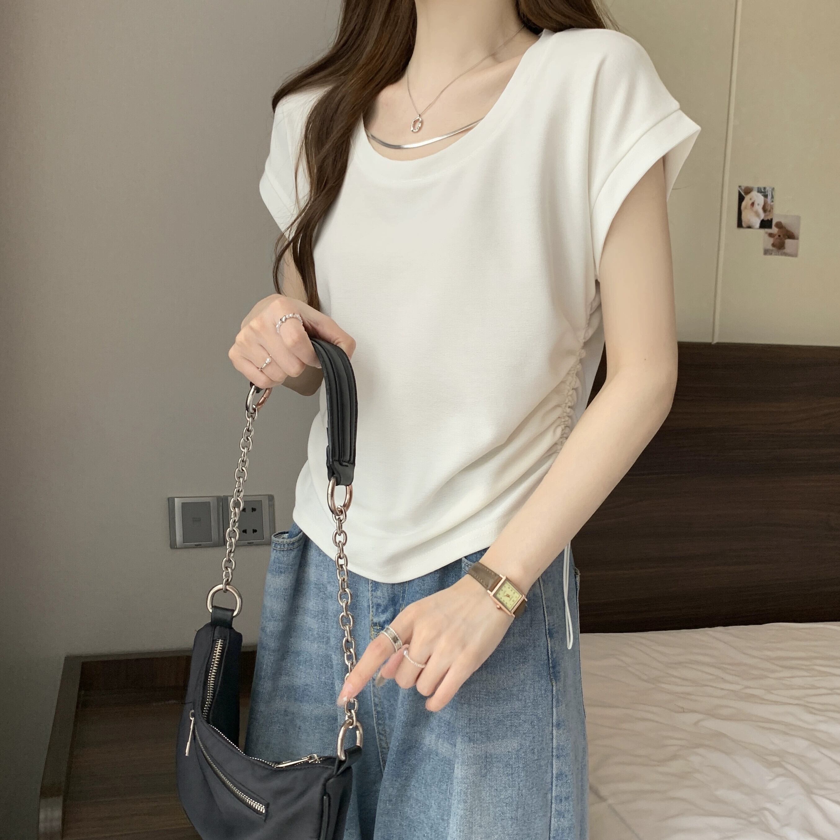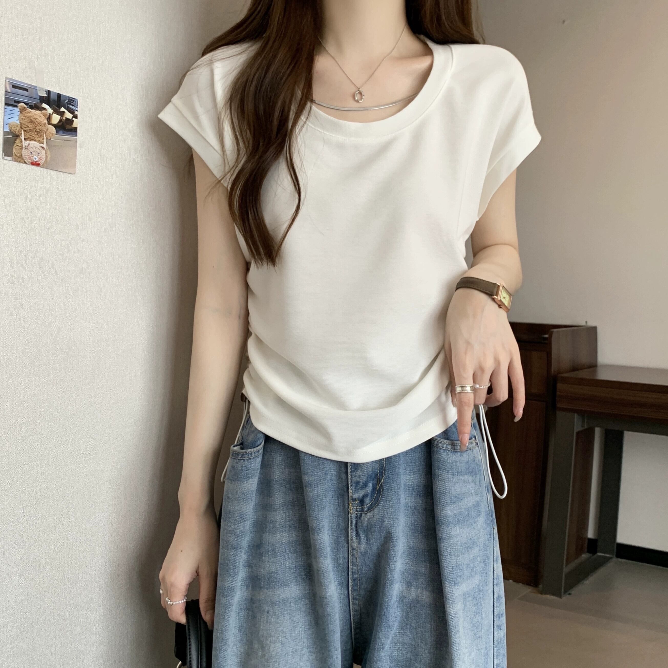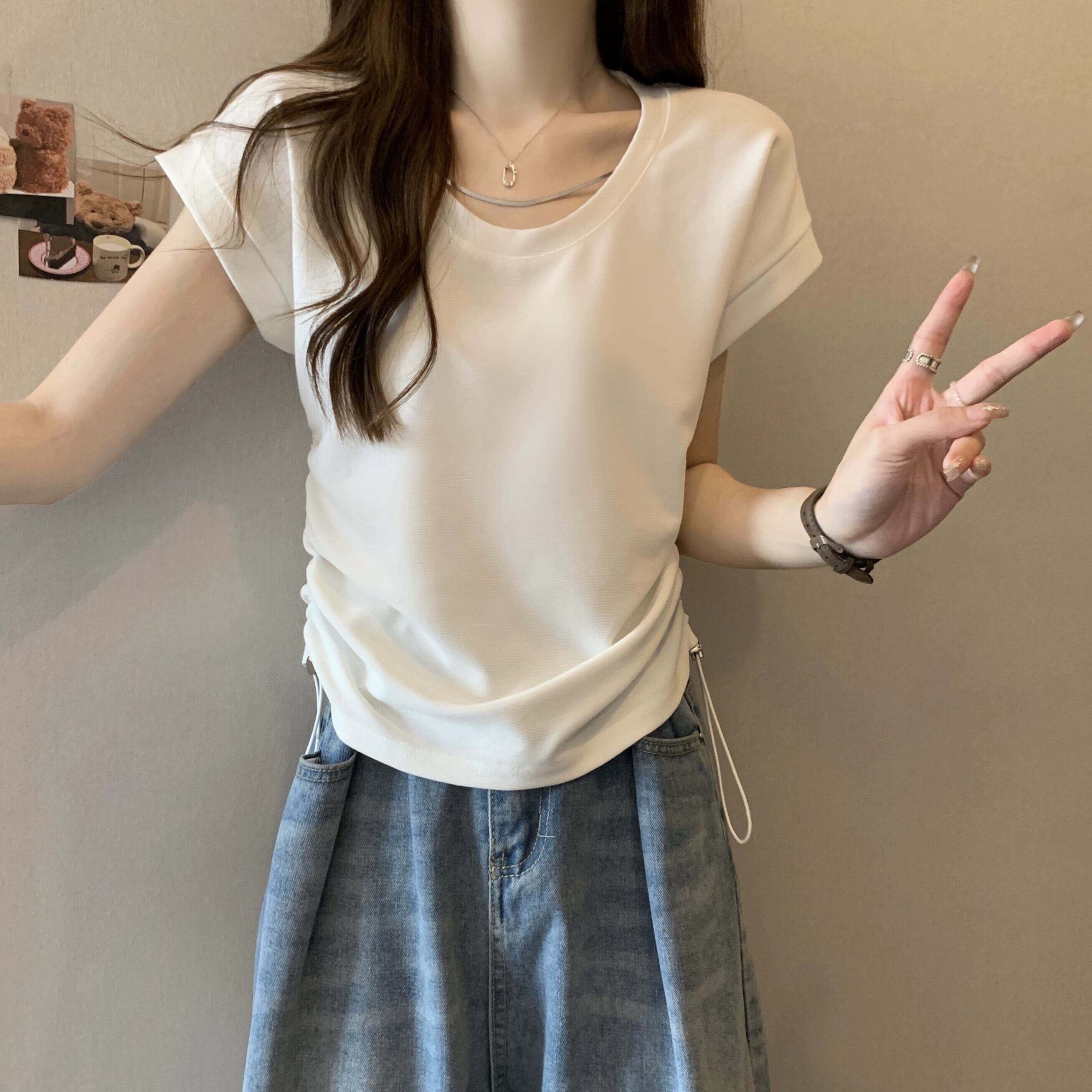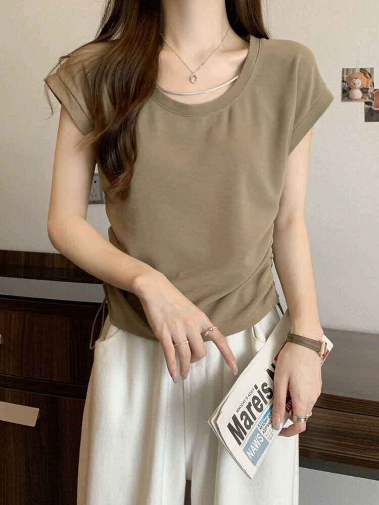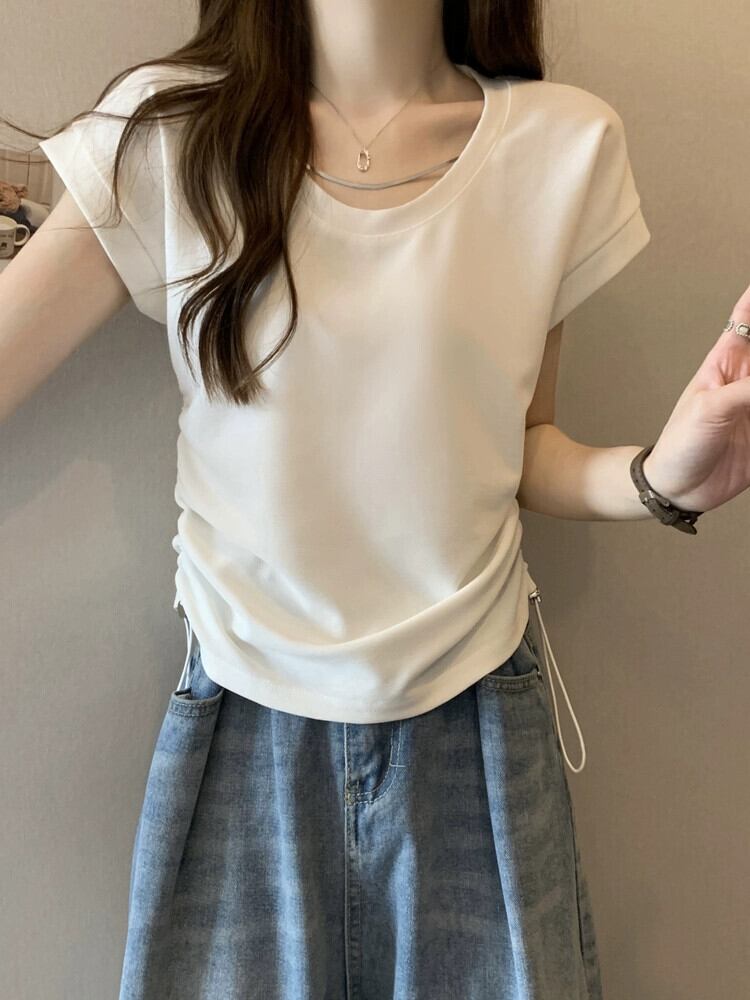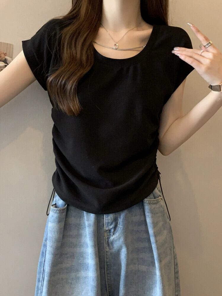 不規則なラウンドネック半袖 Tシャツレディース夏のファッションオールマッチデザイン自己修養の感覚ショートショルダードローストリングトップイン サマー 夏物 Oネック 7460015557137063 | framboise21