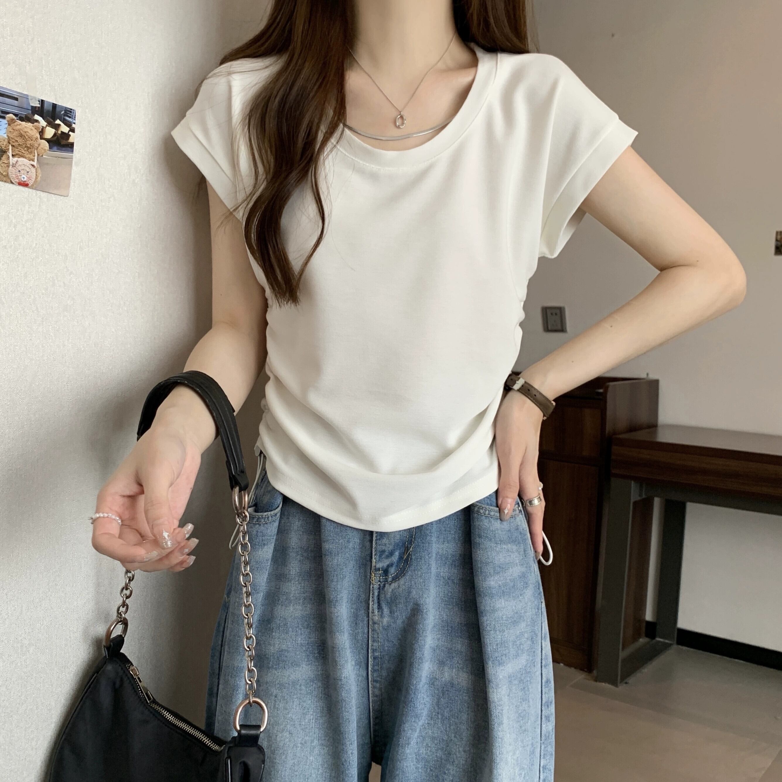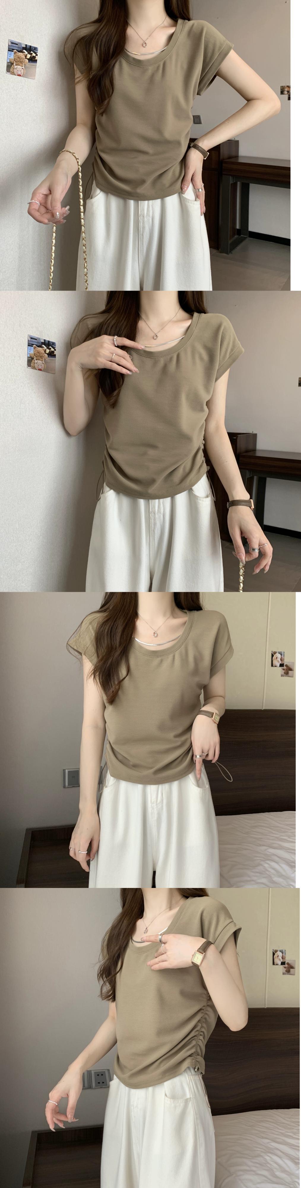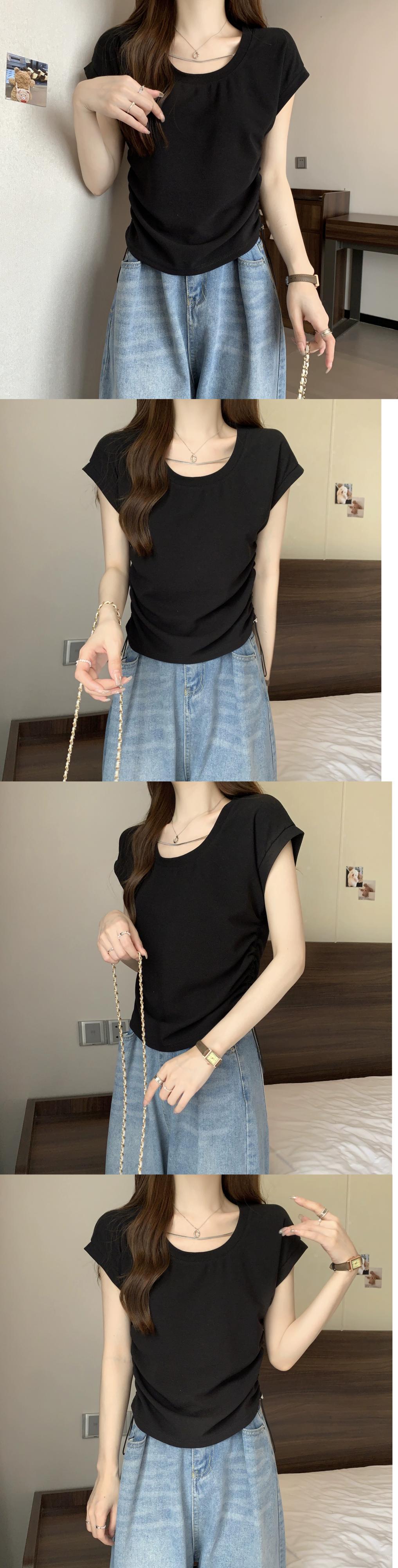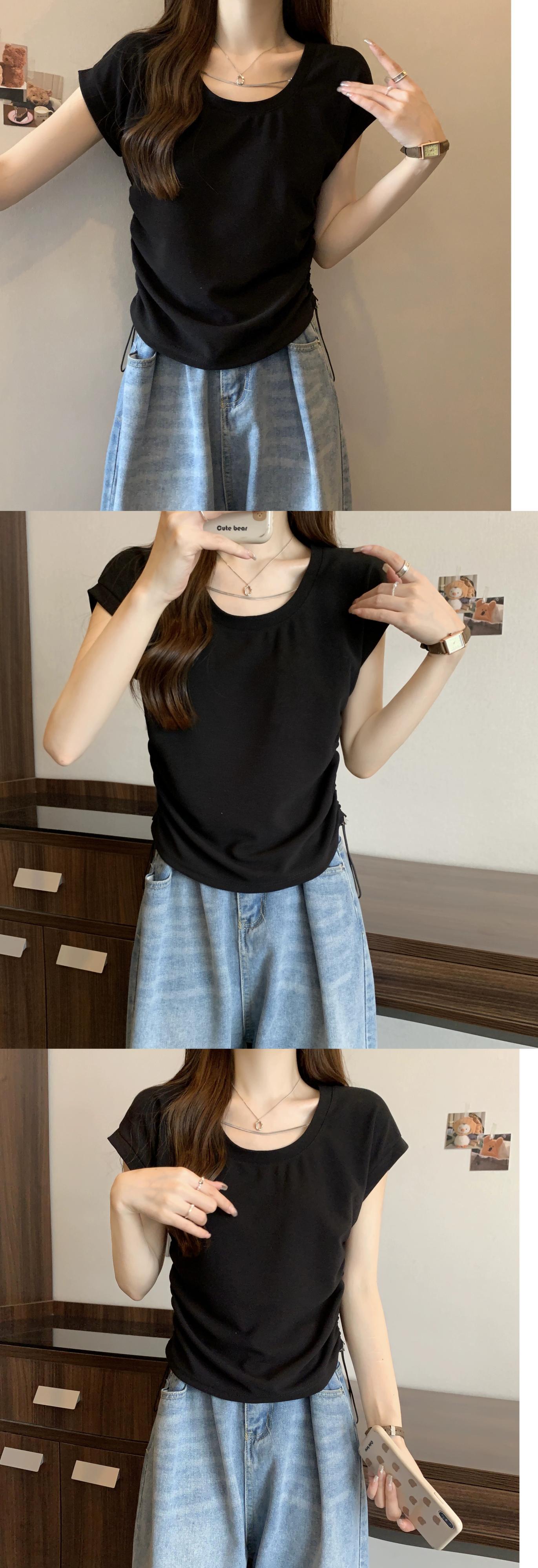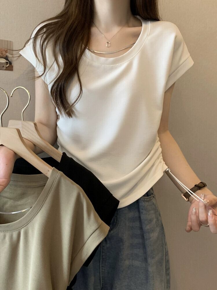 不規則なラウンドネック半袖 Tシャツレディース夏のファッションオールマッチデザイン自己修養の感覚ショートショルダードローストリングトップイン サマー 夏物 Oネック 7460015557137063 | framboise21