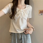 フロントショルダー半袖Tシャツレディース夏のファッションアインスタイルデザイン自己修養の感覚スリムハイウエストショートネクタイスクエアカラートップ ハイウェスト サマー 夏物 スクウェア 7460042608696173