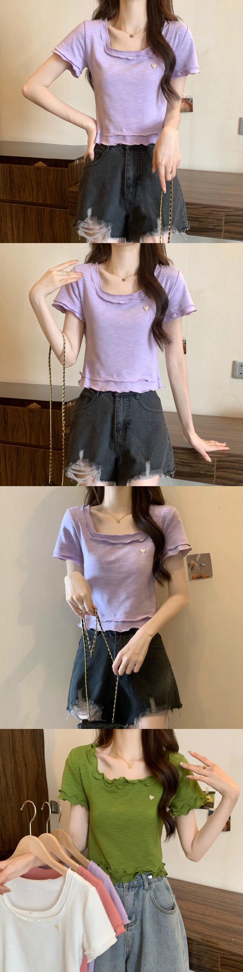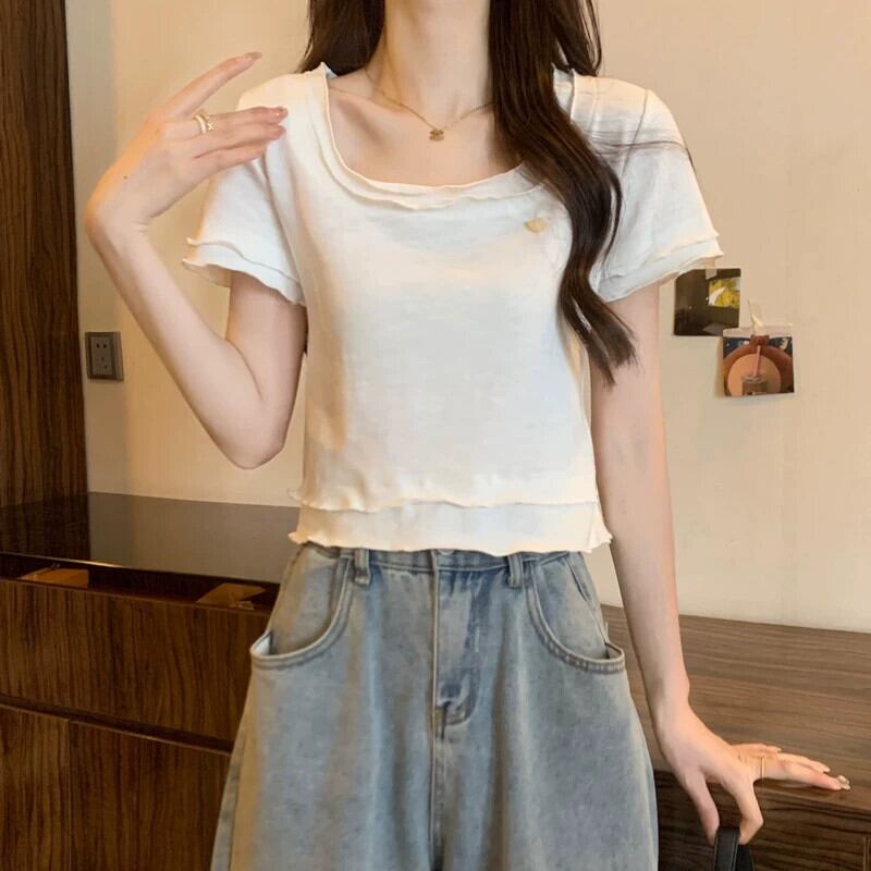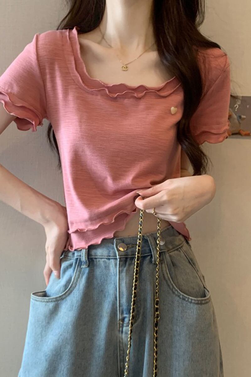 ピンクのスクエアカラー半袖Tシャツレディース夏のファッションデザイン自己修養の感覚スリムショルダーショート木耳エッジトップトレンディ サマー 夏物 スクウェア 7460019358047638 | framboise21