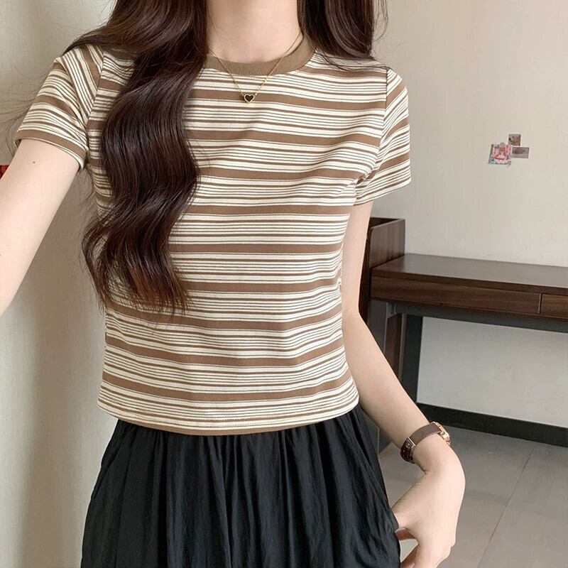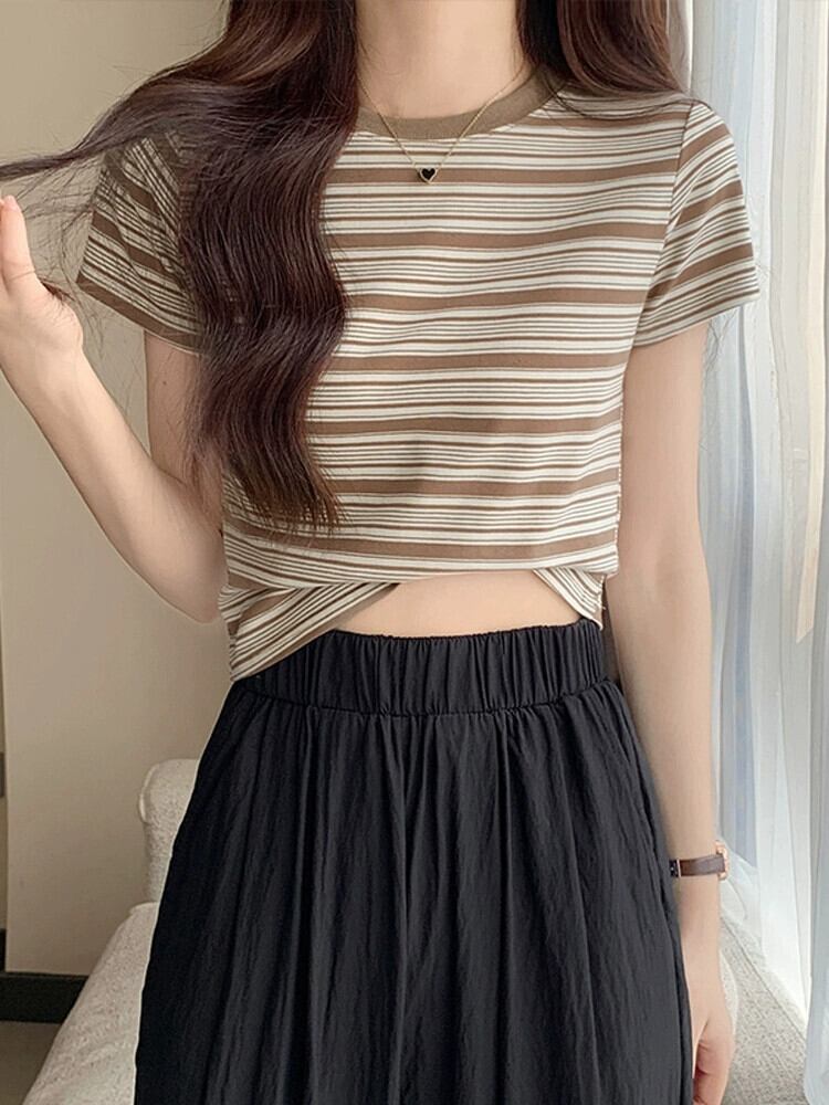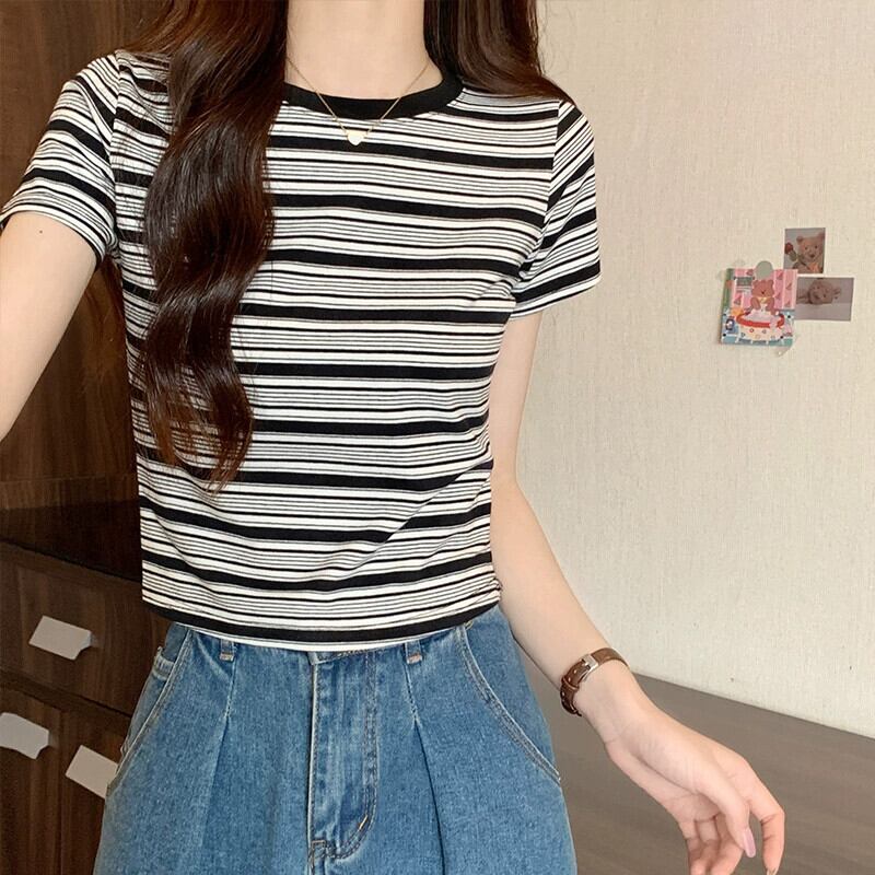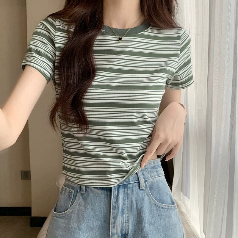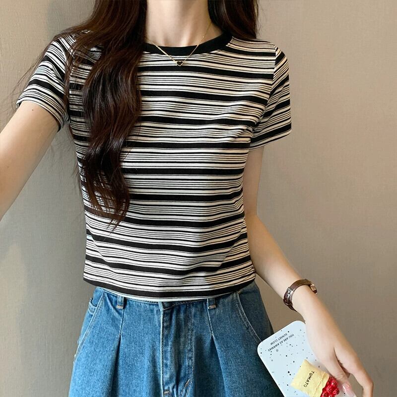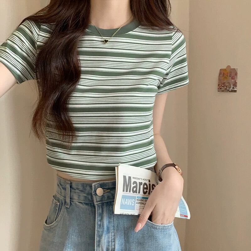 ストライプコットン半袖Tシャツレディース2023年夏新デザインセンス痩身スリムハイウエストショートショルダートップ ハイウェスト サマー 夏物 7460082852886947 | framboise21