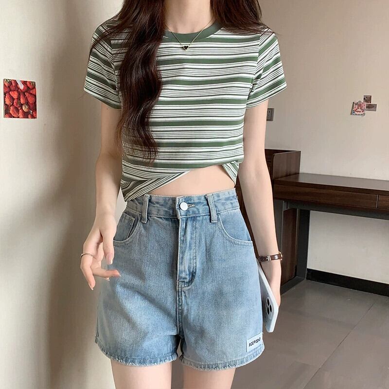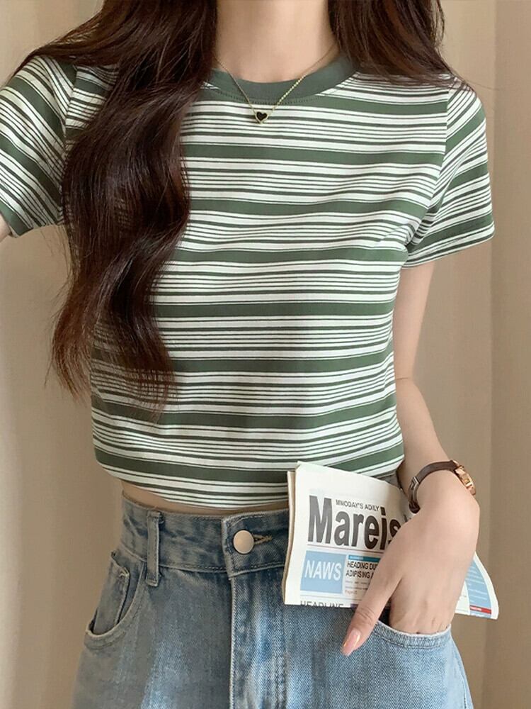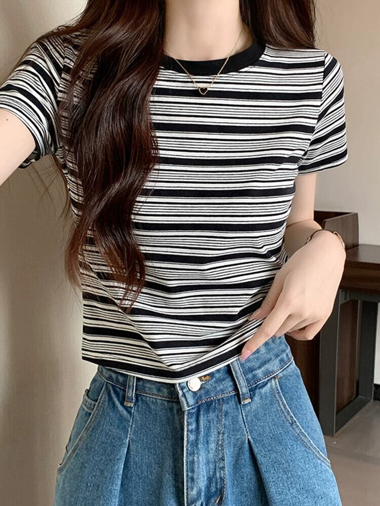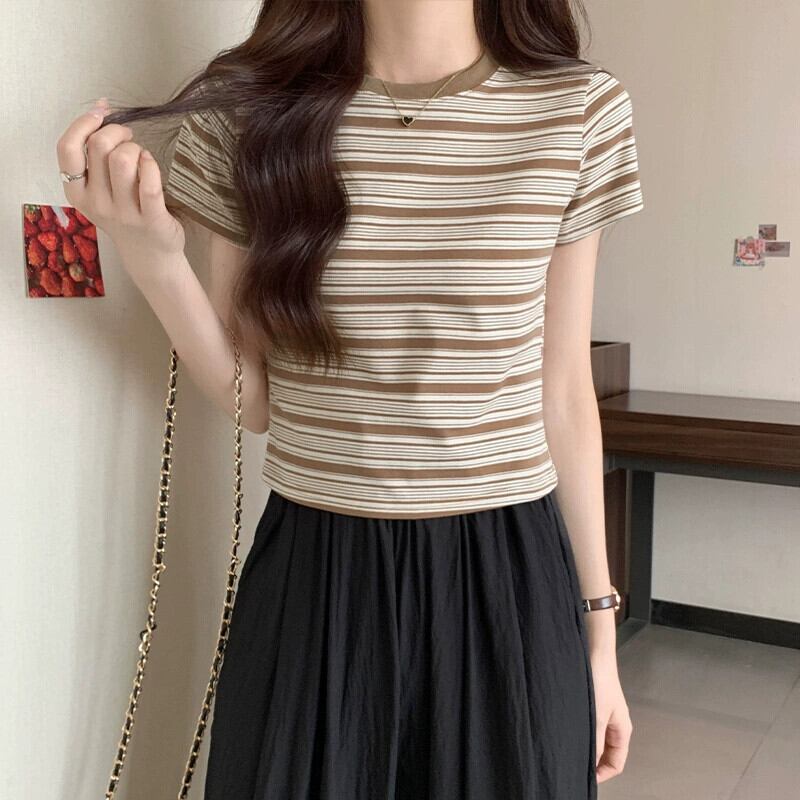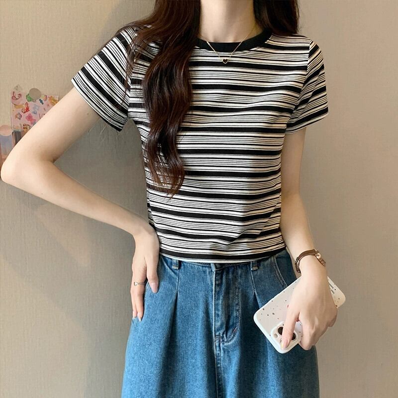 ストライプコットン半袖Tシャツレディース2023年夏新デザインセンス痩身スリムハイウエストショートショルダートップ ハイウェスト サマー 夏物 7460082852886947 | framboise21