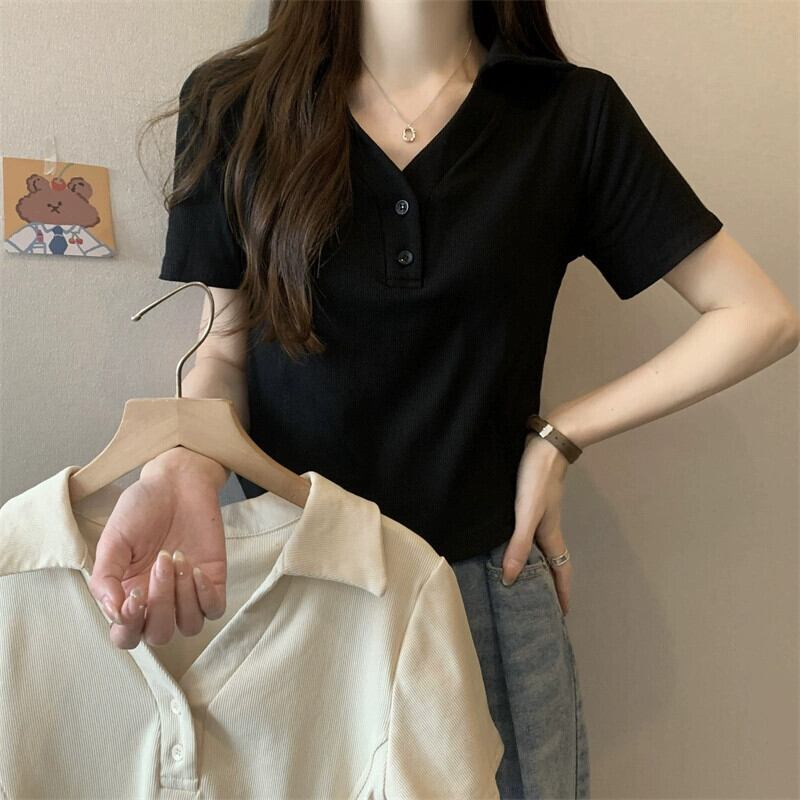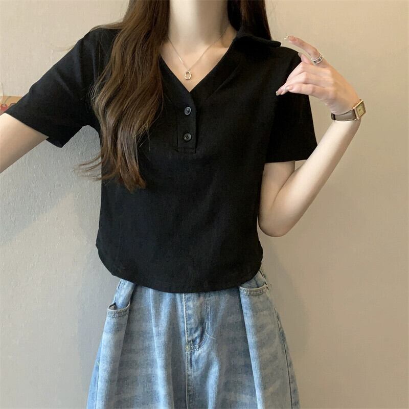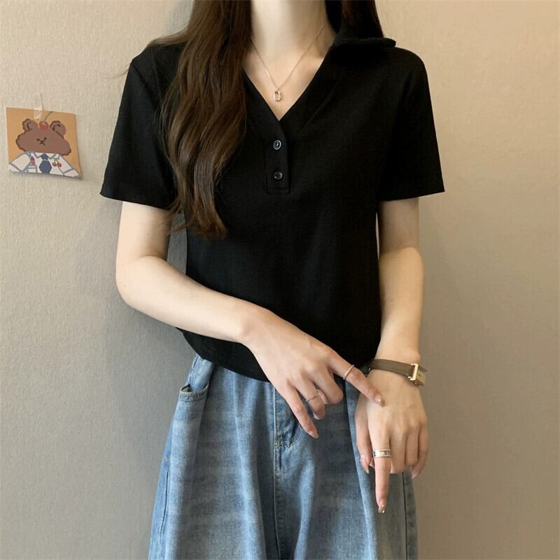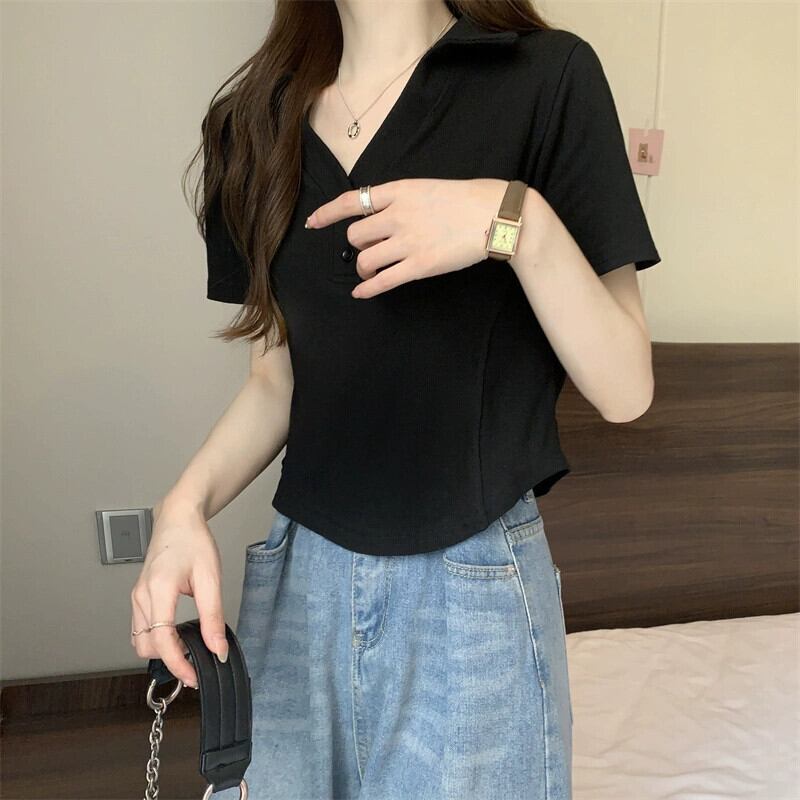 黒のポロカラー半袖Tシャツレディース夏スリムフィットハイレベルデザインセンスショートイレギュラーフィッシュボーントップ ブラック サマー 夏物 7460094647498363 | framboise21