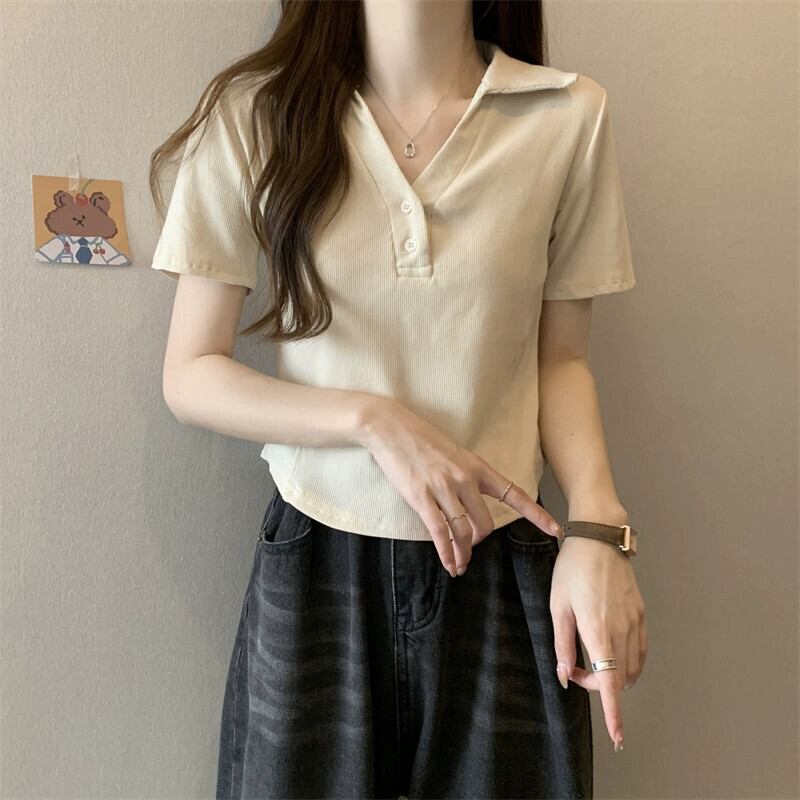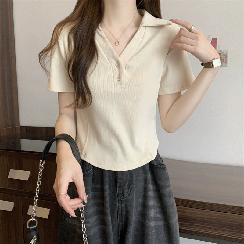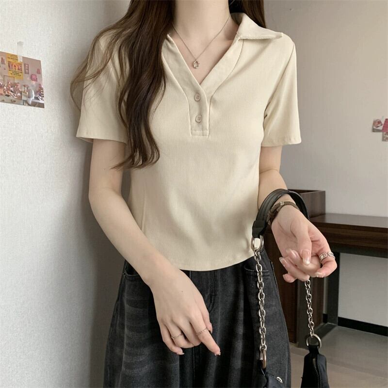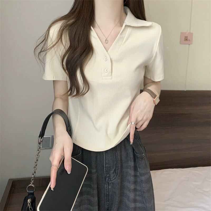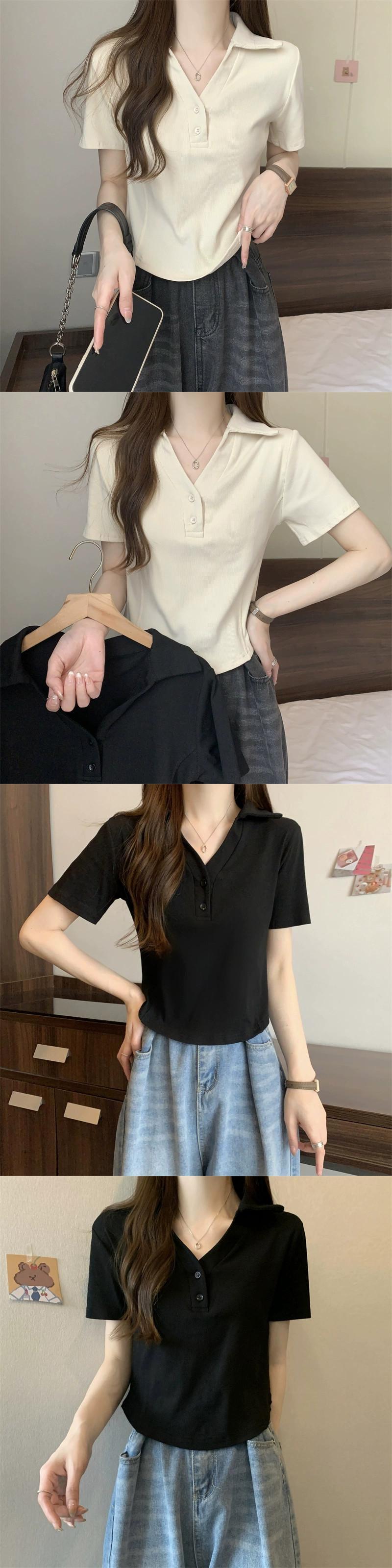 黒のポロカラー半袖Tシャツレディース夏スリムフィットハイレベルデザインセンスショートイレギュラーフィッシュボーントップ ブラック サマー 夏物 7460094647498363 | framboise21
