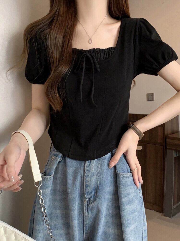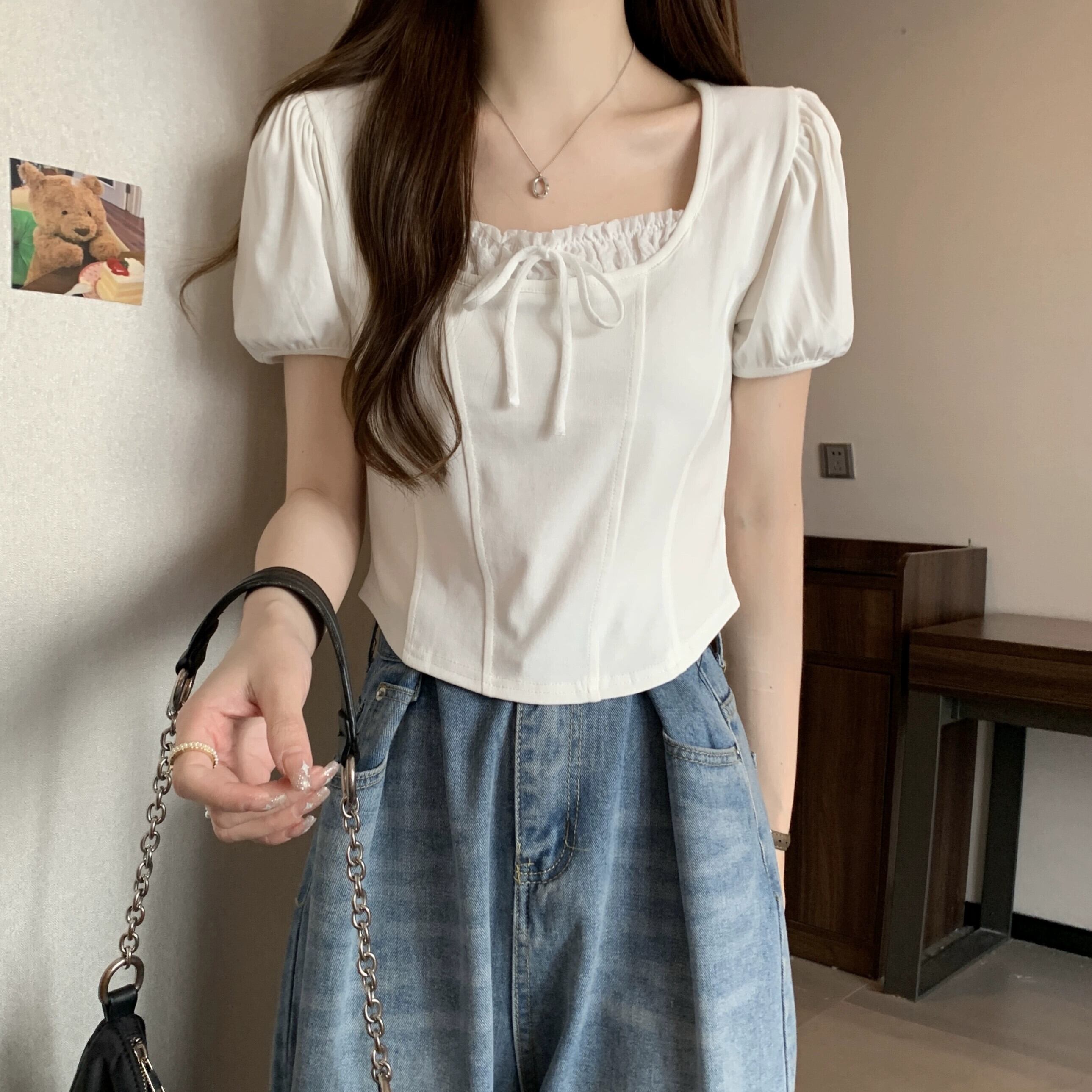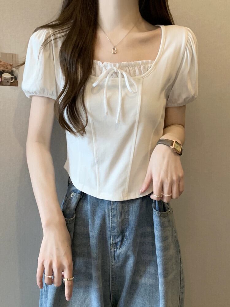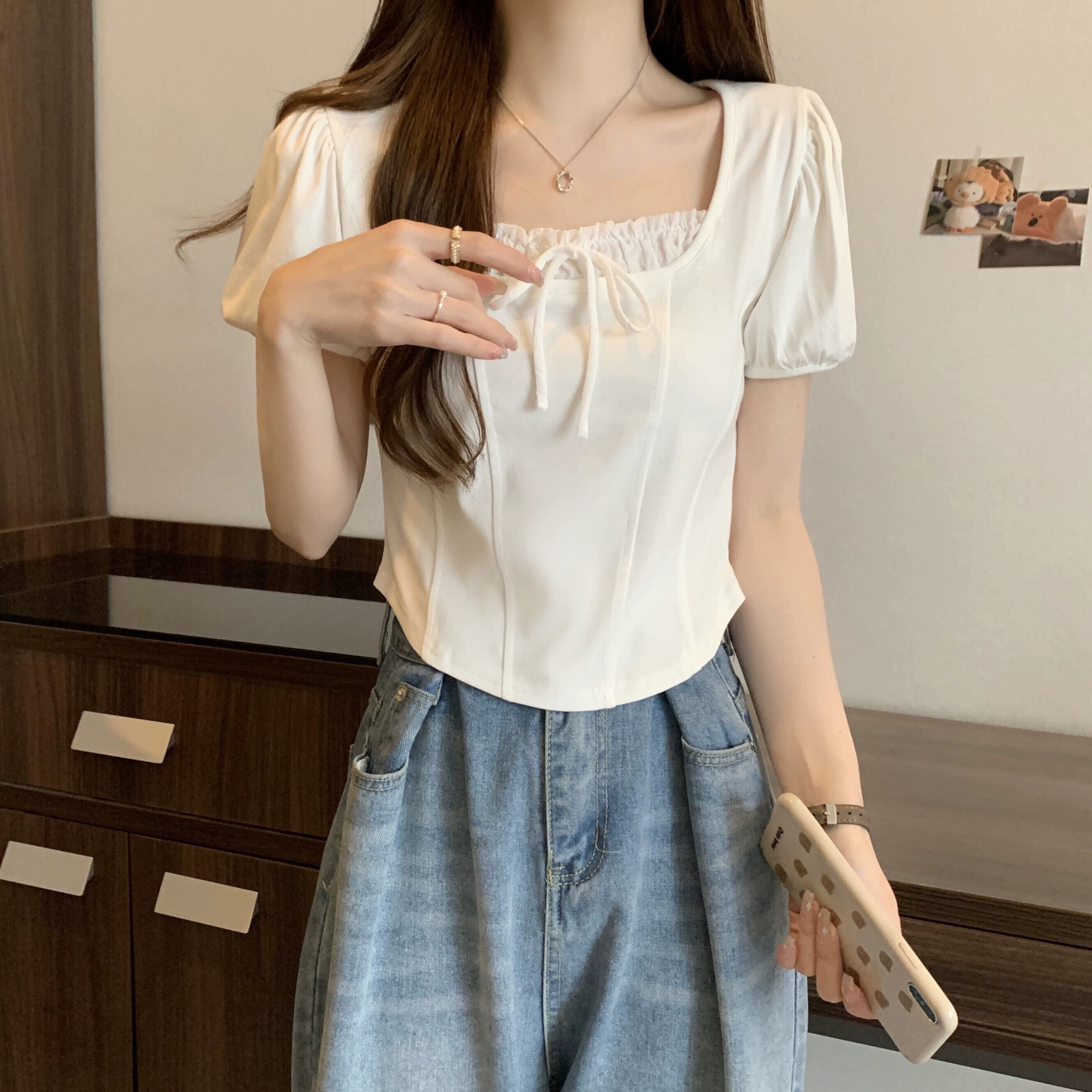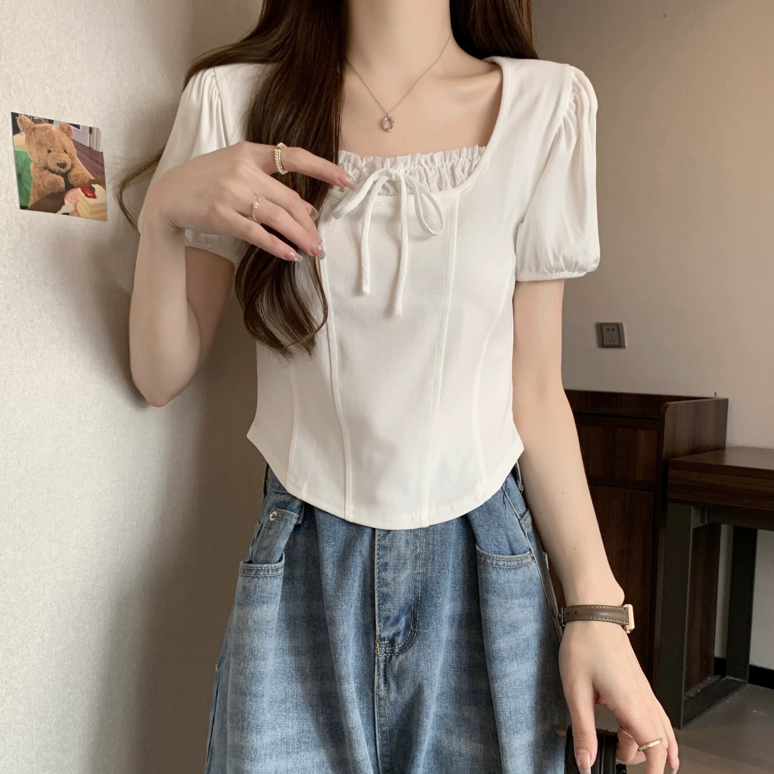 カーブした裾フロントショルダー半袖 Tシャツ女性の夏フランス自己修養ニッチデザイン不規則なショートスクエアカラートップ サマー 夏物 スクウェア 746003946747358 | framboise21