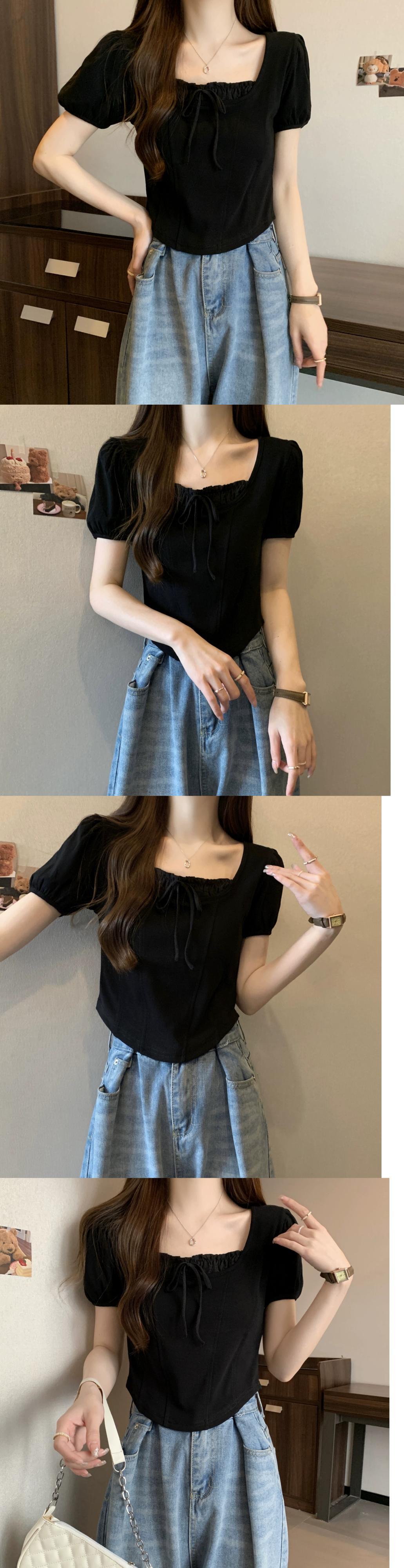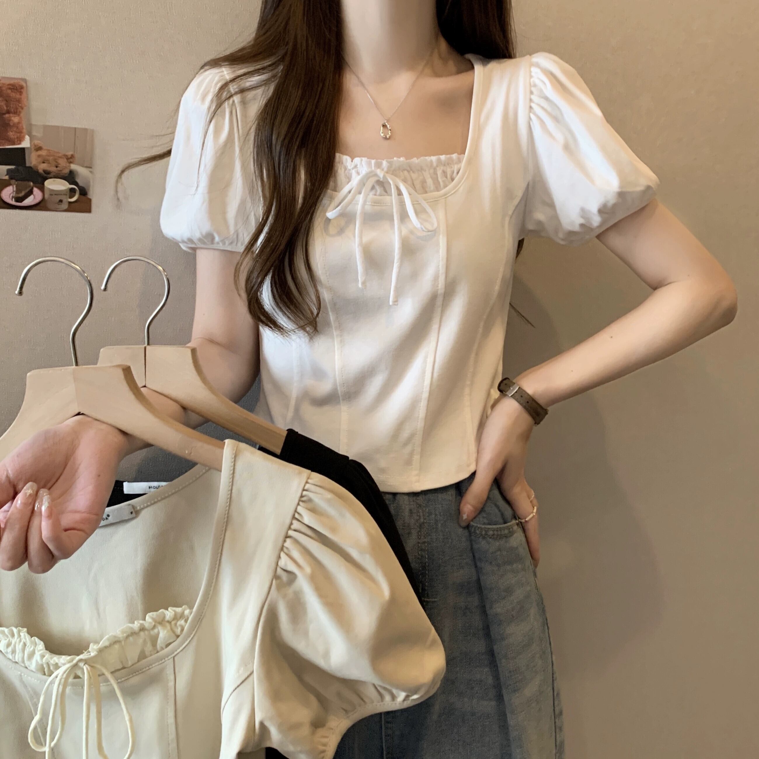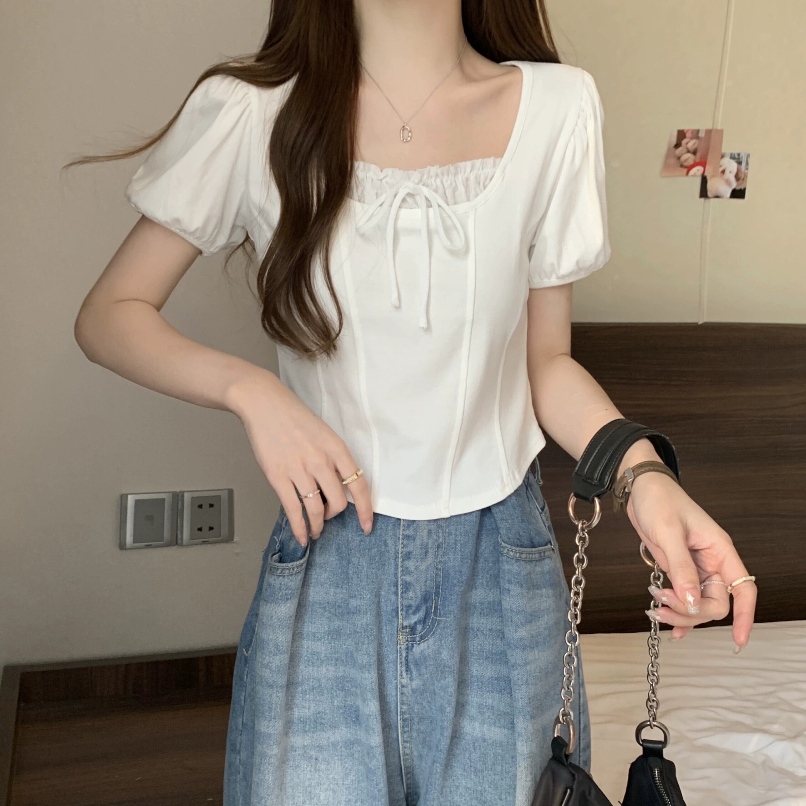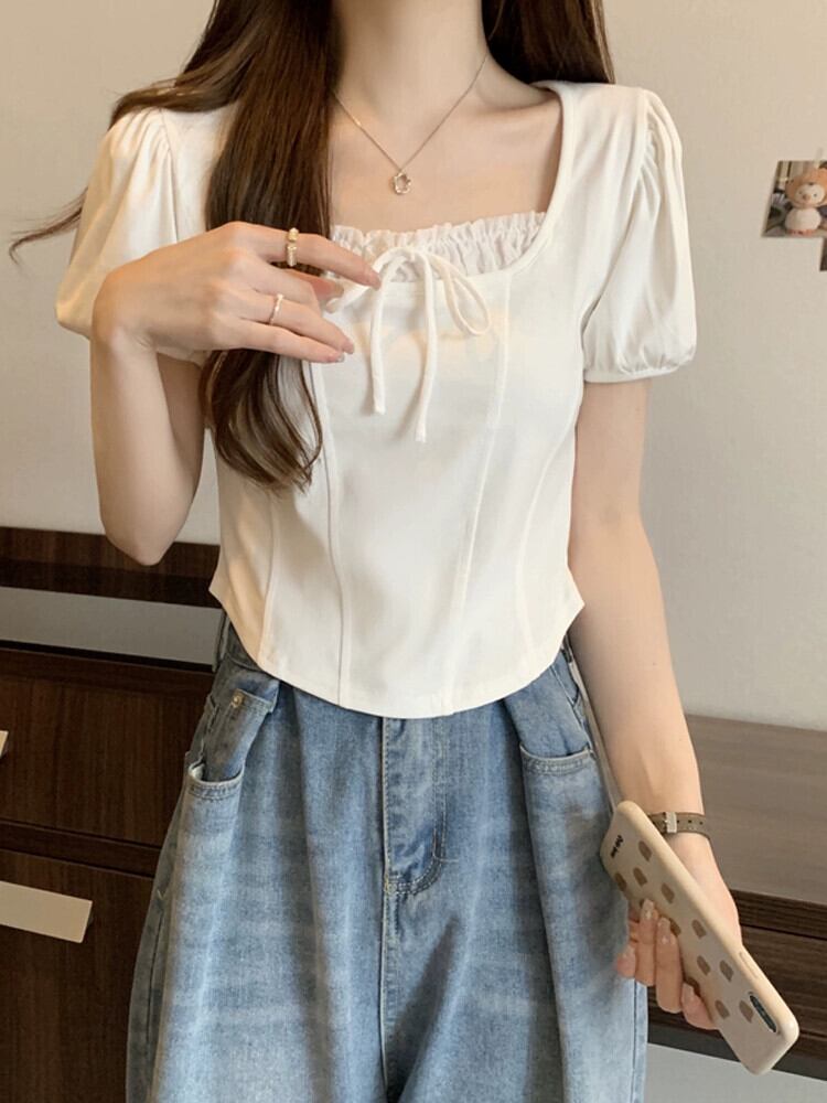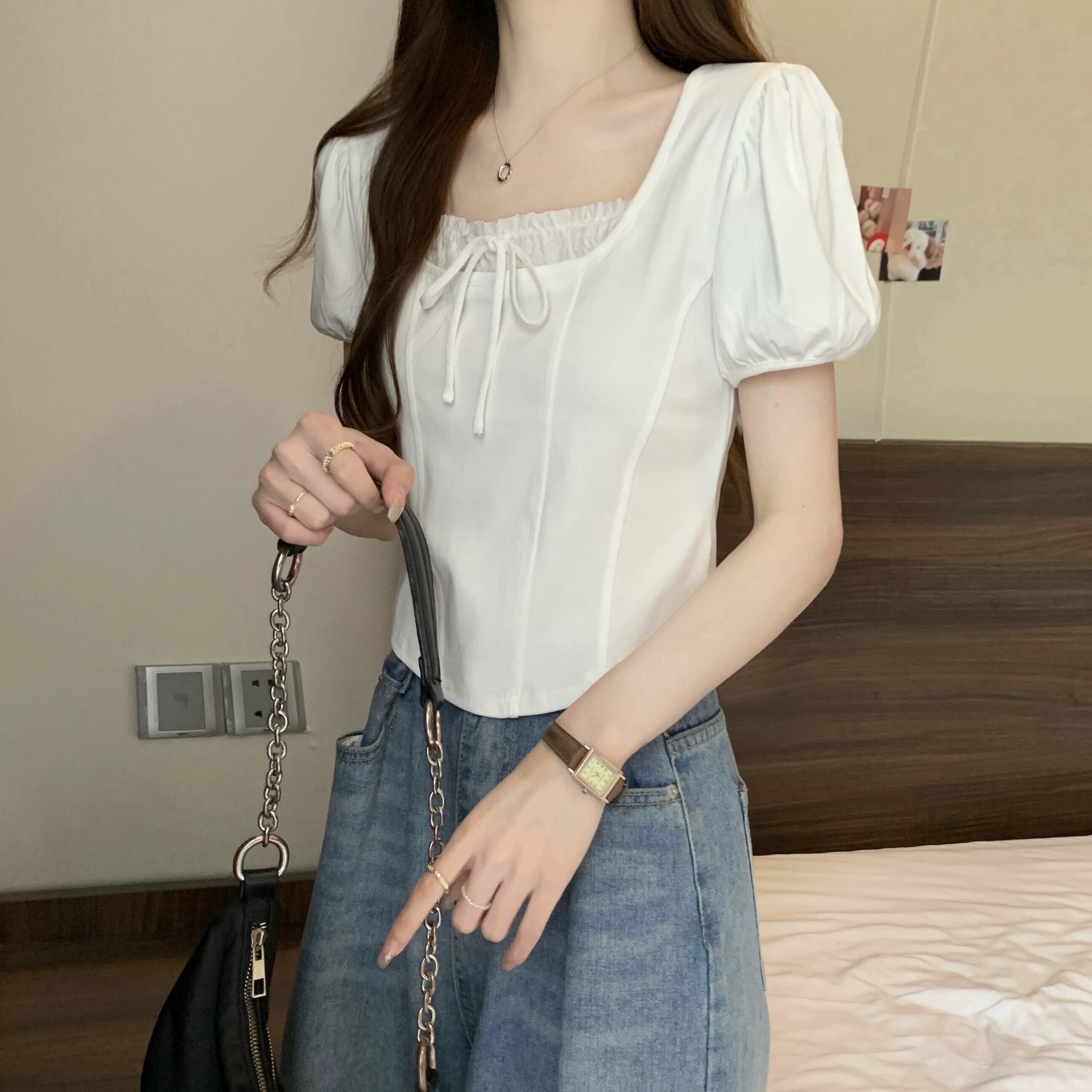 カーブした裾フロントショルダー半袖 Tシャツ女性の夏フランス自己修養ニッチデザイン不規則なショートスクエアカラートップ サマー 夏物 スクウェア 746003946747358 | framboise21