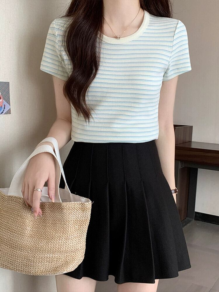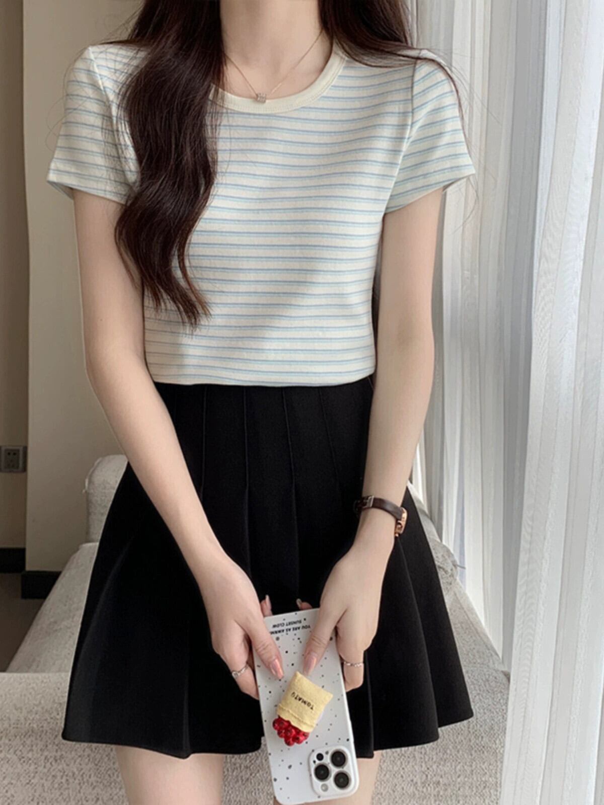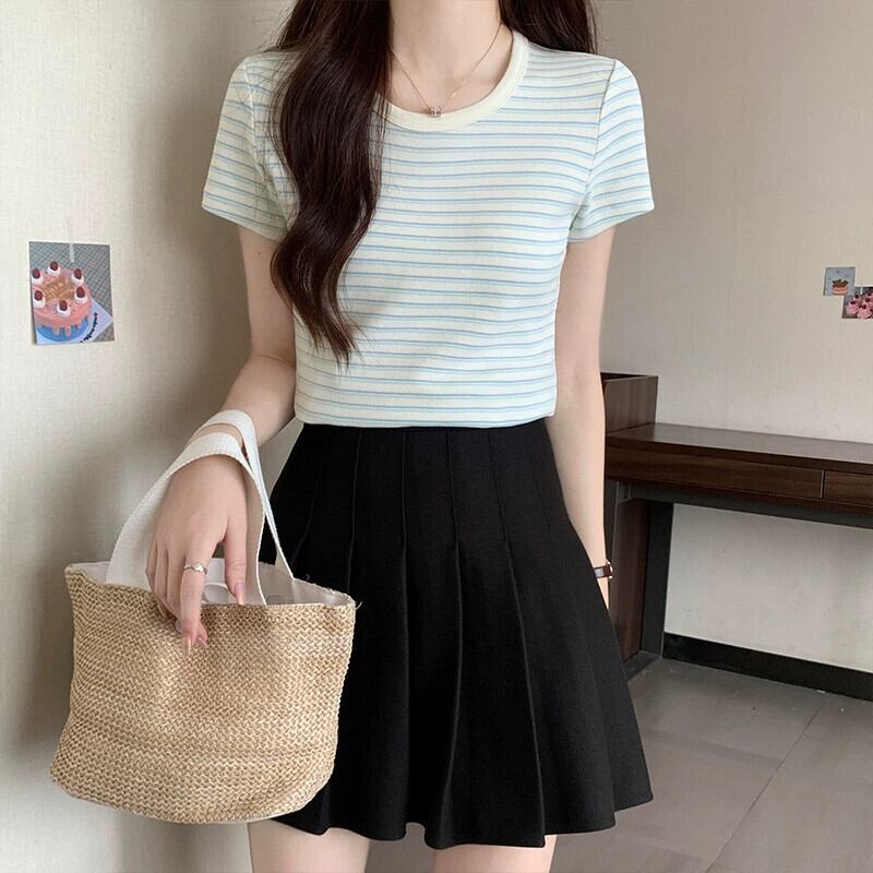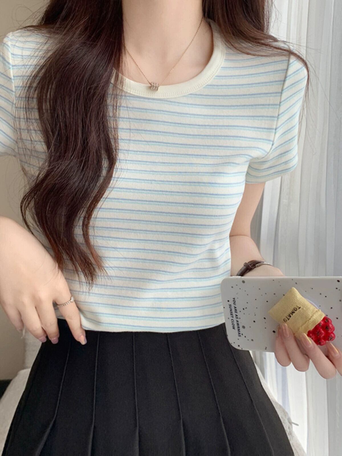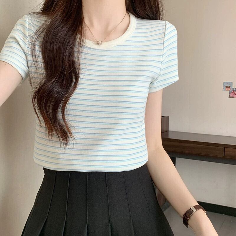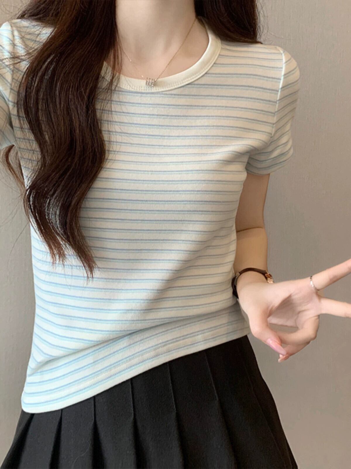 純綿フロントショルダーストライプ半袖 Tシャツレディース 2023 年夏新デザイン自己修養の感覚オールマッチショートラウンドネックトップ コットン サマー 夏物 Oネック 7460098471138377 | framboise21