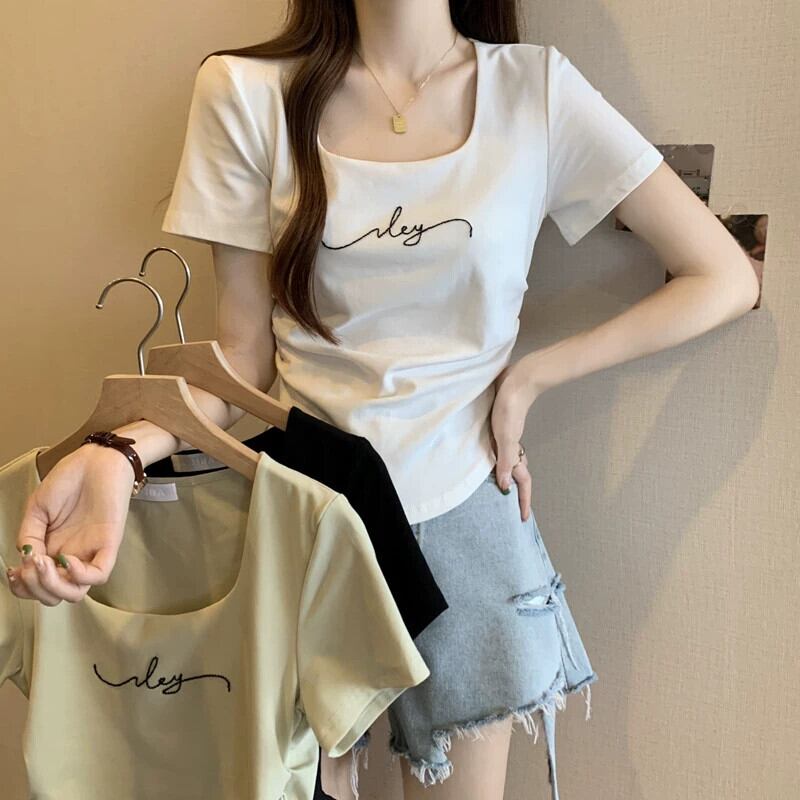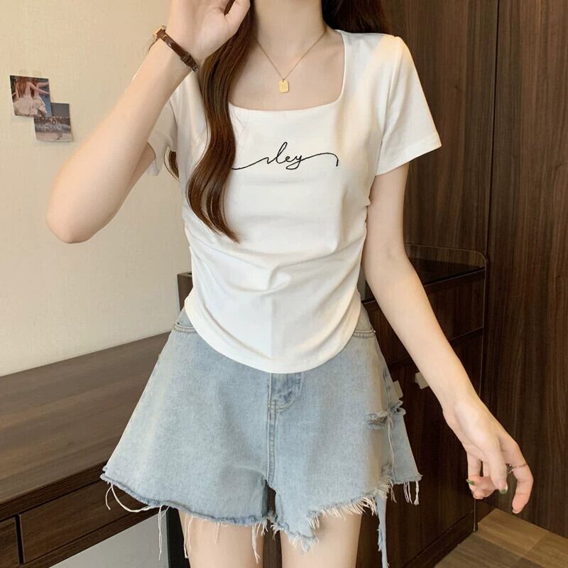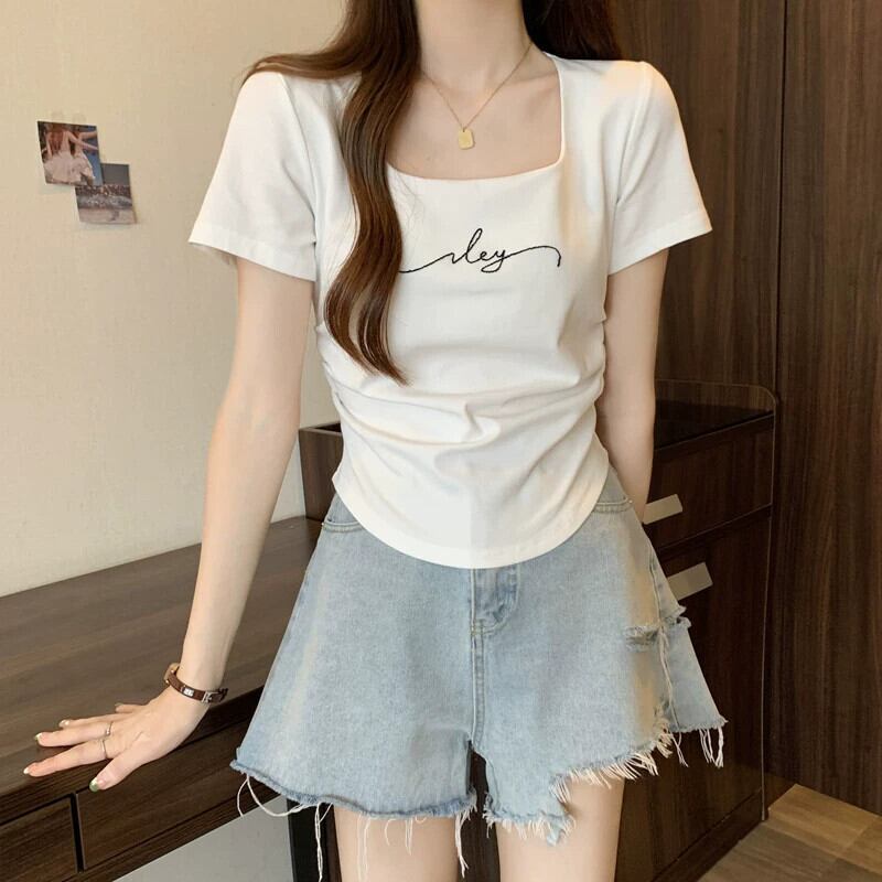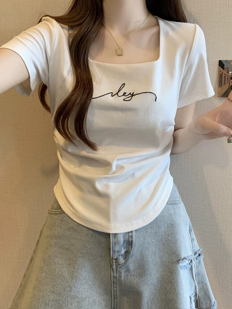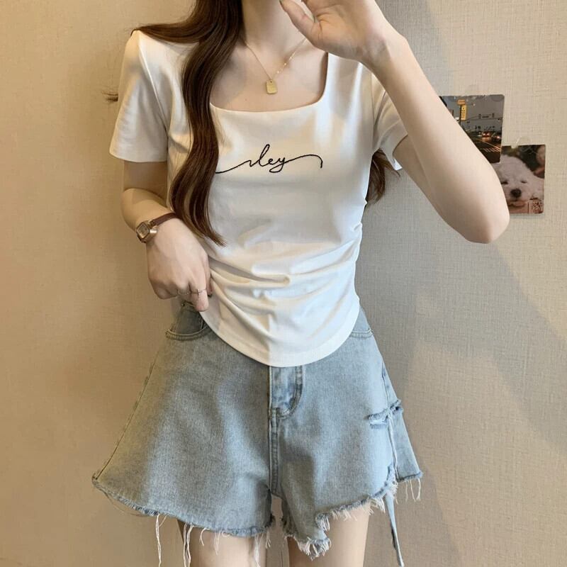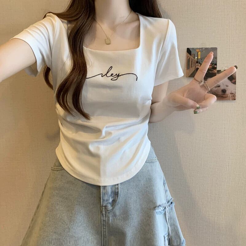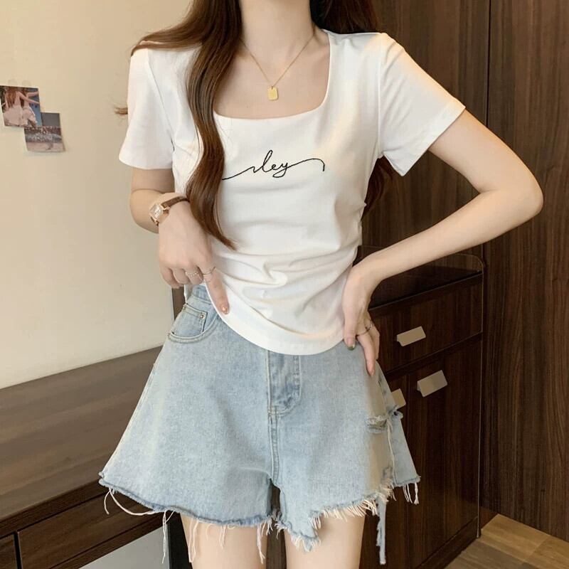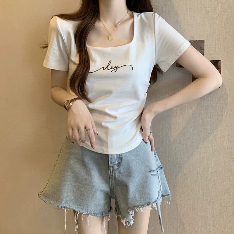 ホワイトフロントショルダー半袖Tシャツレディース夏ニッチデザインファッションオールマッチ自己修養ショートセクション不規則なスクエアカラートップ サマー 夏物 スクウェア 7460031526117948 | framboise21