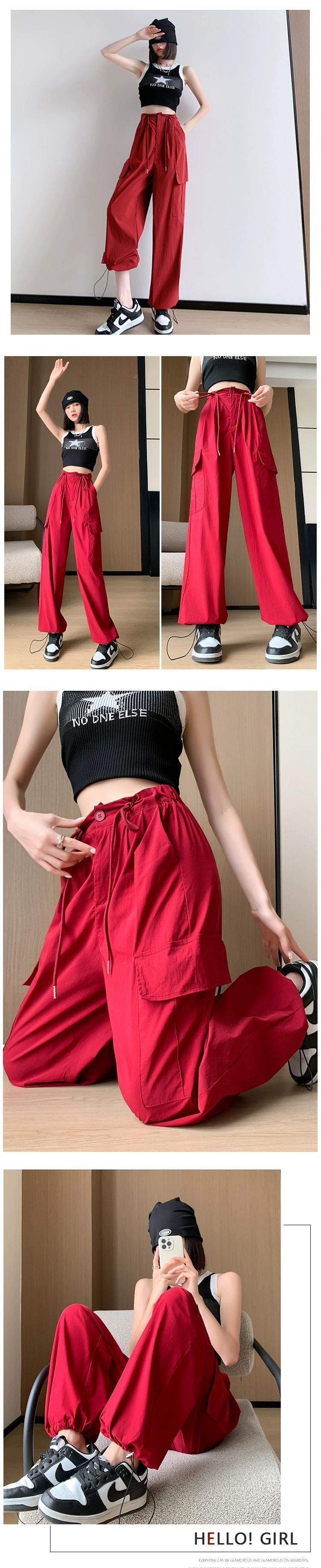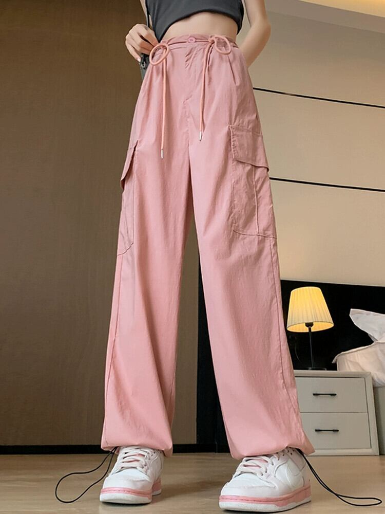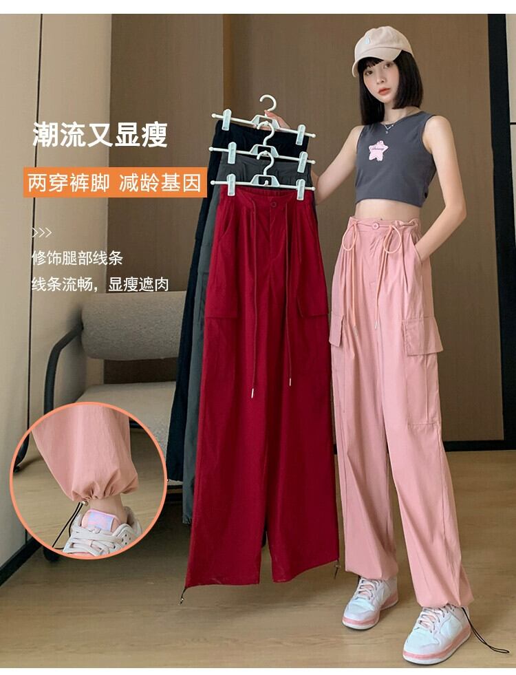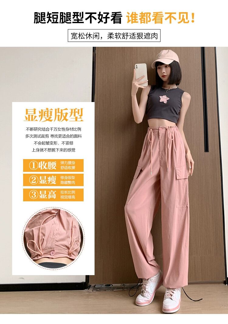 ピンクの速乾性オーバーオール レディース 夏 アメリカン スタイル レトロ 薄いセクション ドローストリング ハイウエスト ワイドレッグ パンツ カジュアル スポーツ パンツ ハイウェスト サマー 夏物 7460071721564906 | framboise21