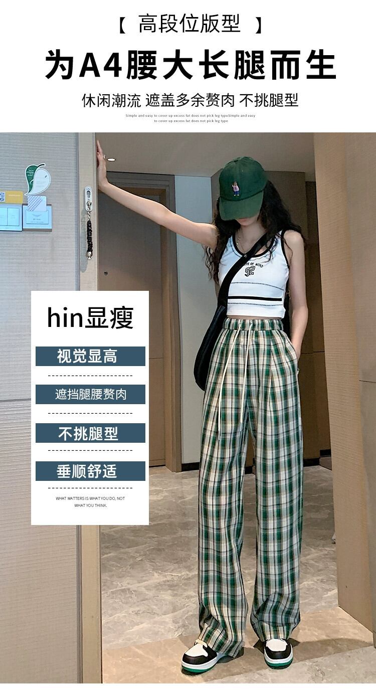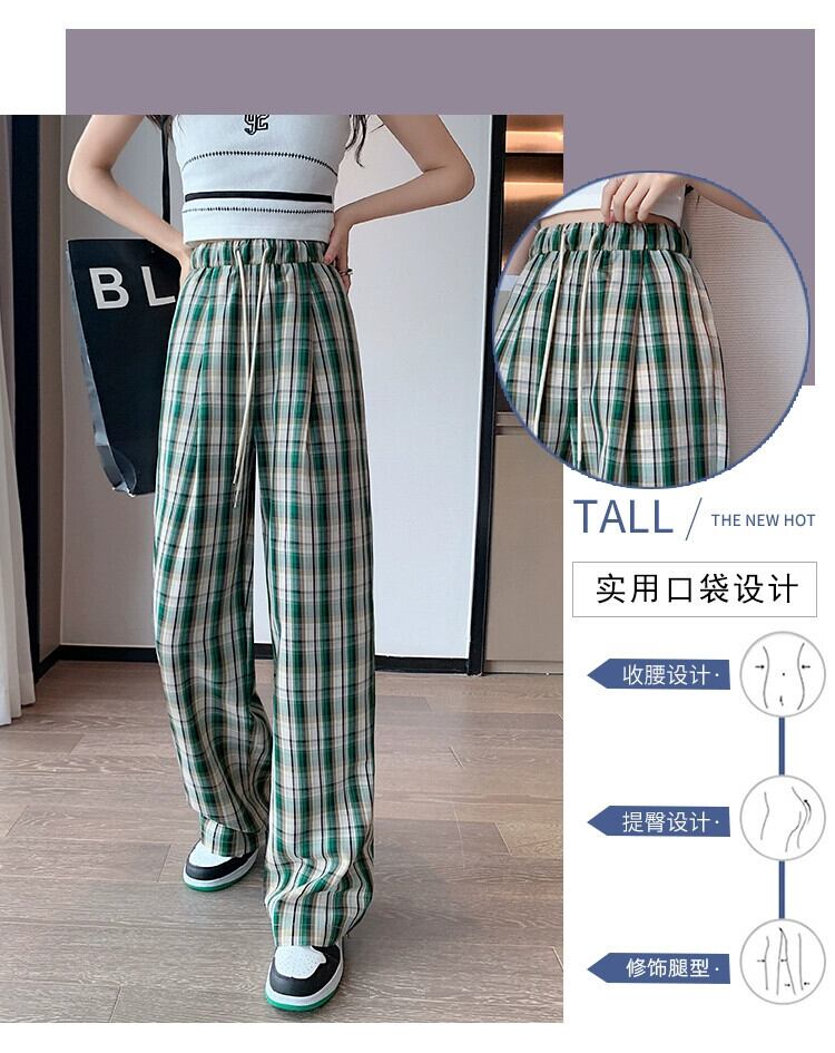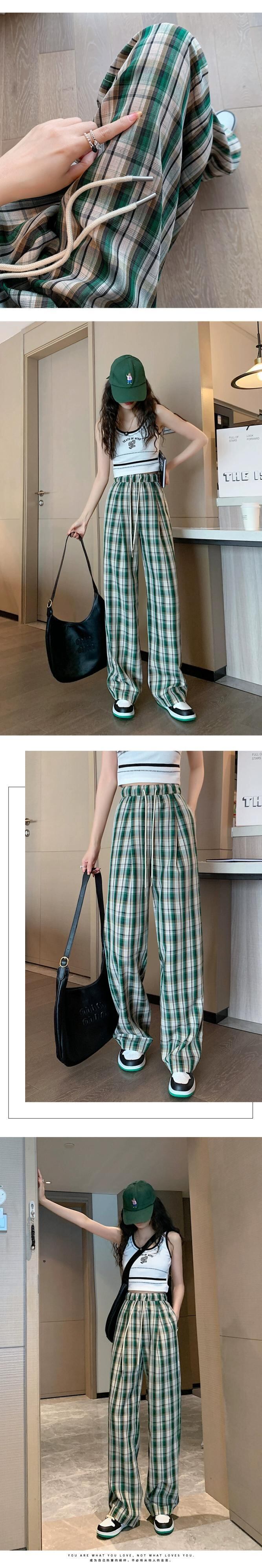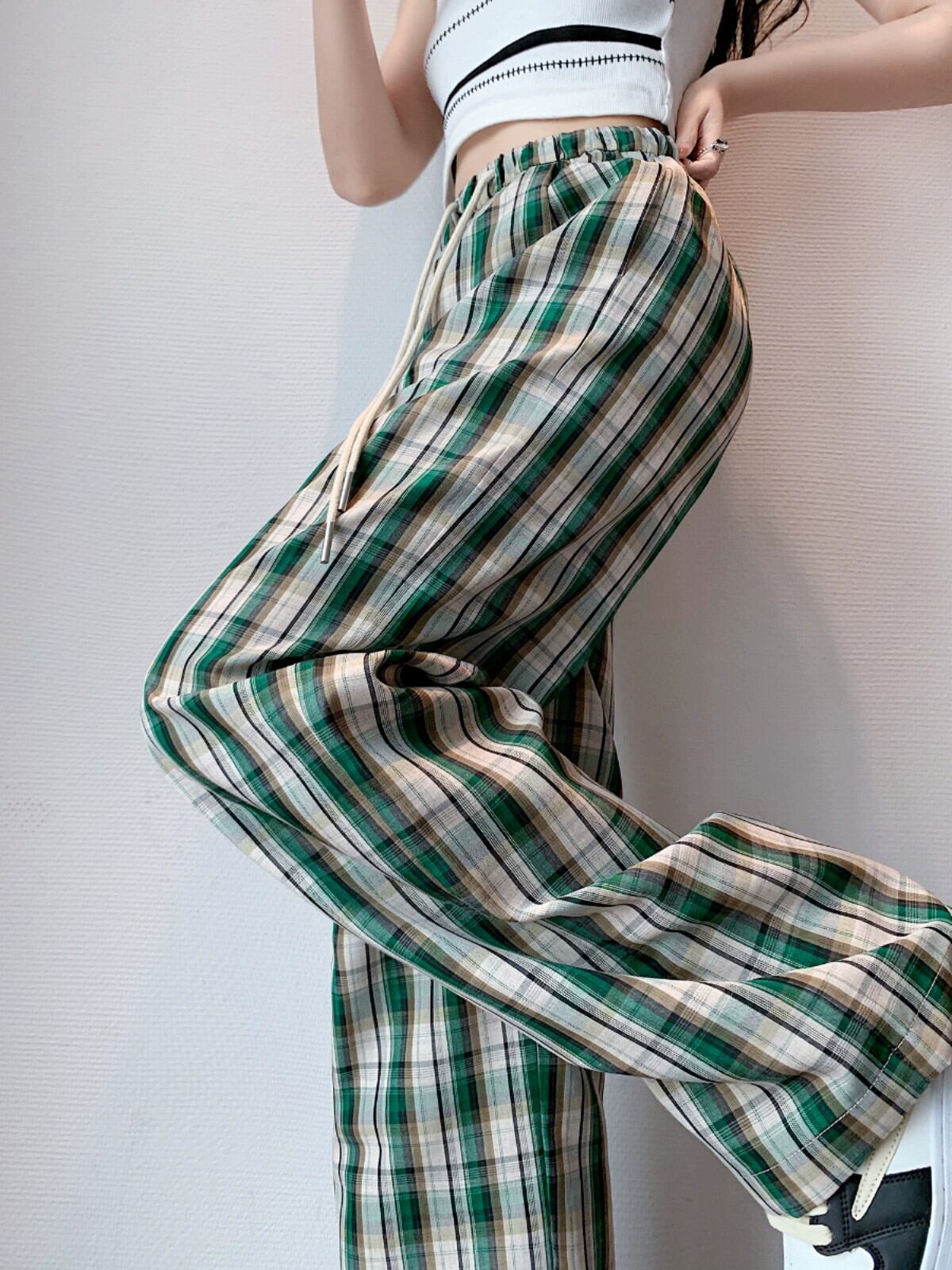 弾性ウエストチェック柄ワイドレッグパンツ女性の夏のレトロドレープモップロングパンツルーズスリムウエストストレートパンツ エラスティック 伸縮 サマー 夏物 ワイドパンツ 7460027968746677 | framboise21