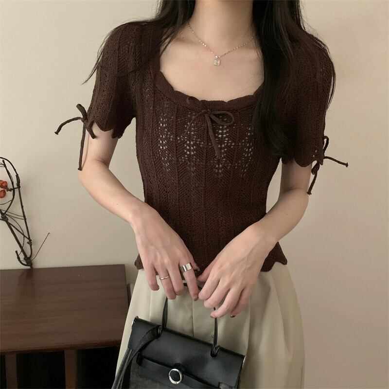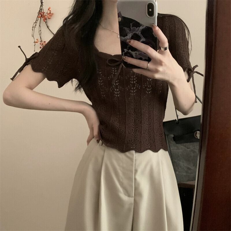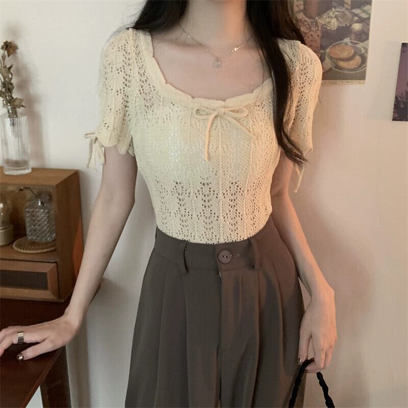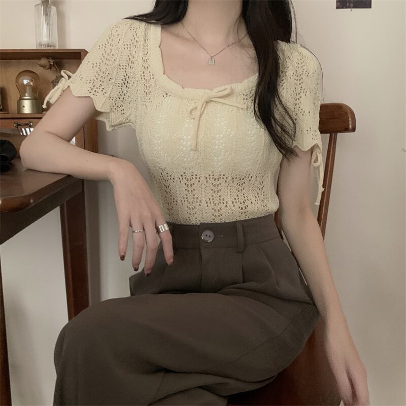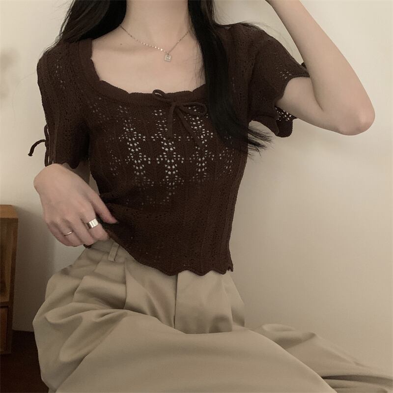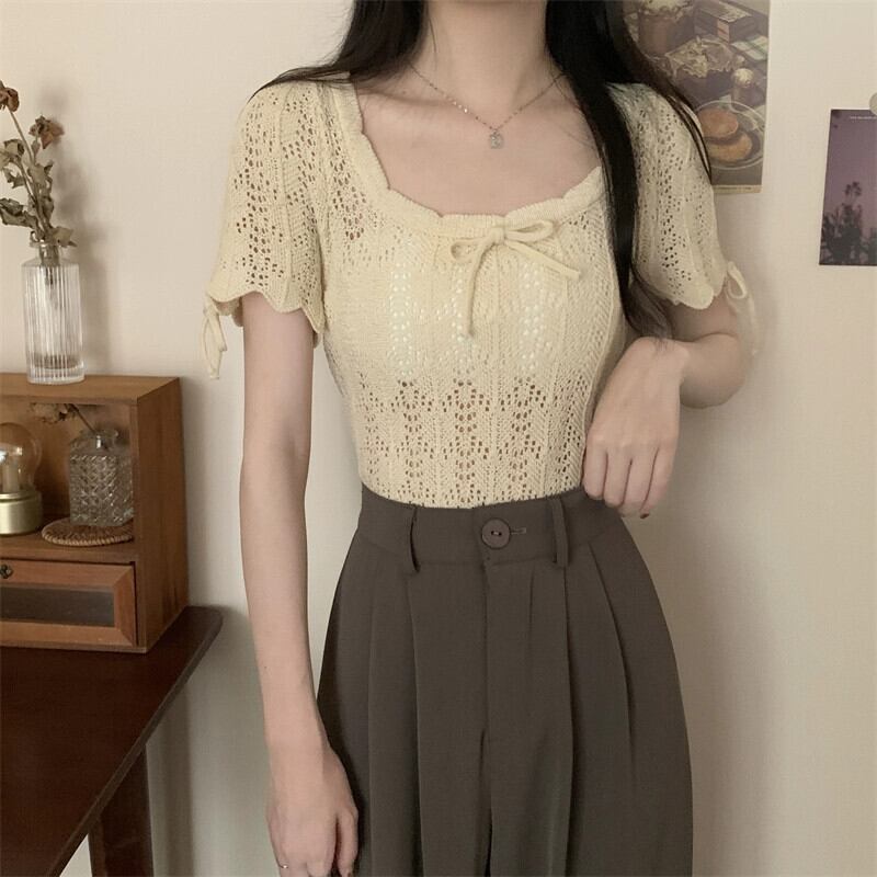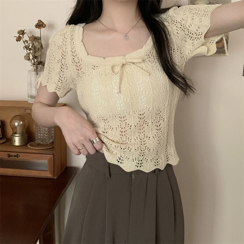 中空の薄いアイスシルク半袖ニットセーター女性の夏のファッションデザイン自己修養の感覚短いセクション不規則な U ネックトップ ショート サマー 夏物 7460069675176625 | framboise21