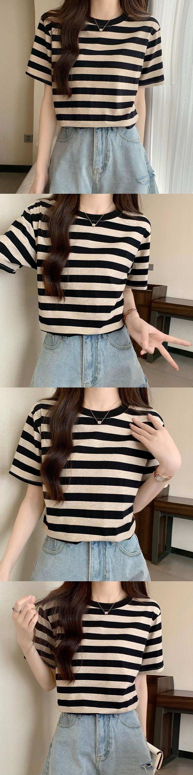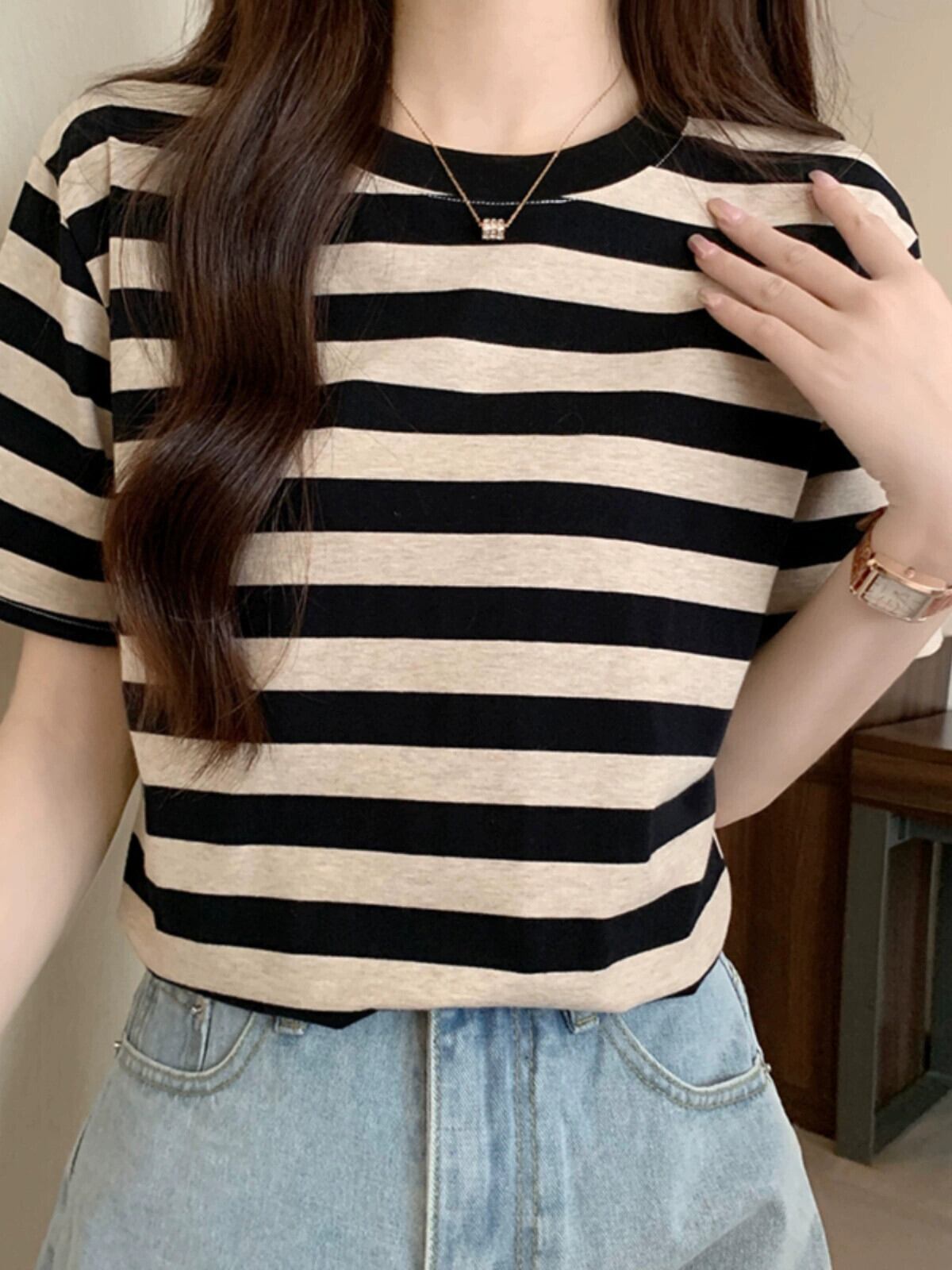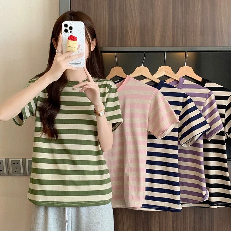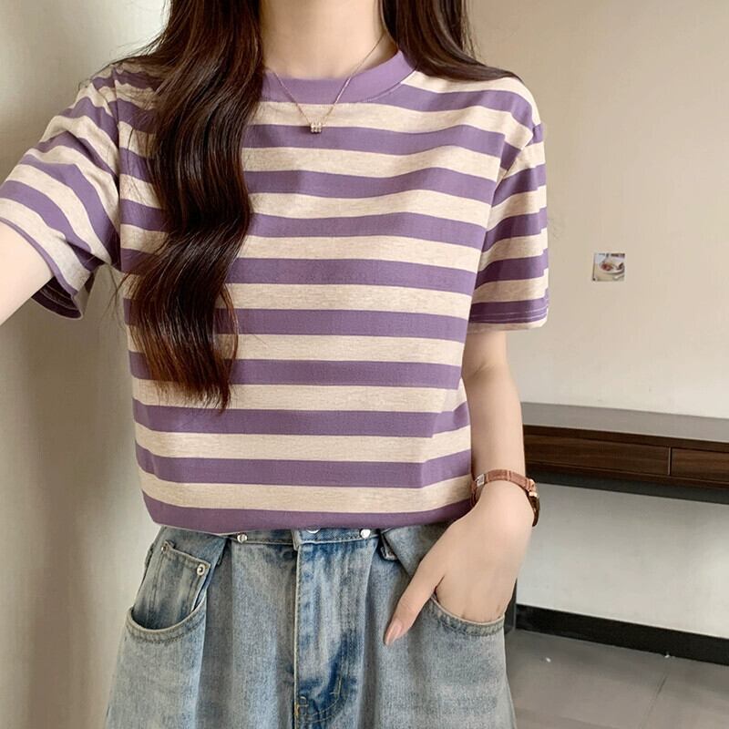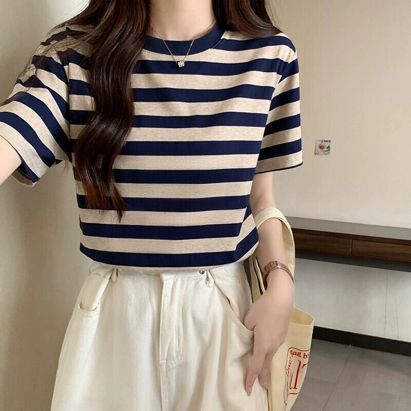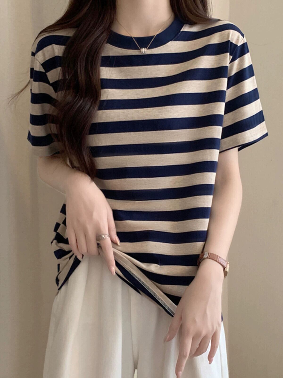 コントラストカラーストライプ半袖Tシャツレディース2023年夏新作レトロデザイン感覚ルーズカジュアルショルダーラウンドネックトップ サマー 夏物 Oネック 7460070914279903 | framboise21
