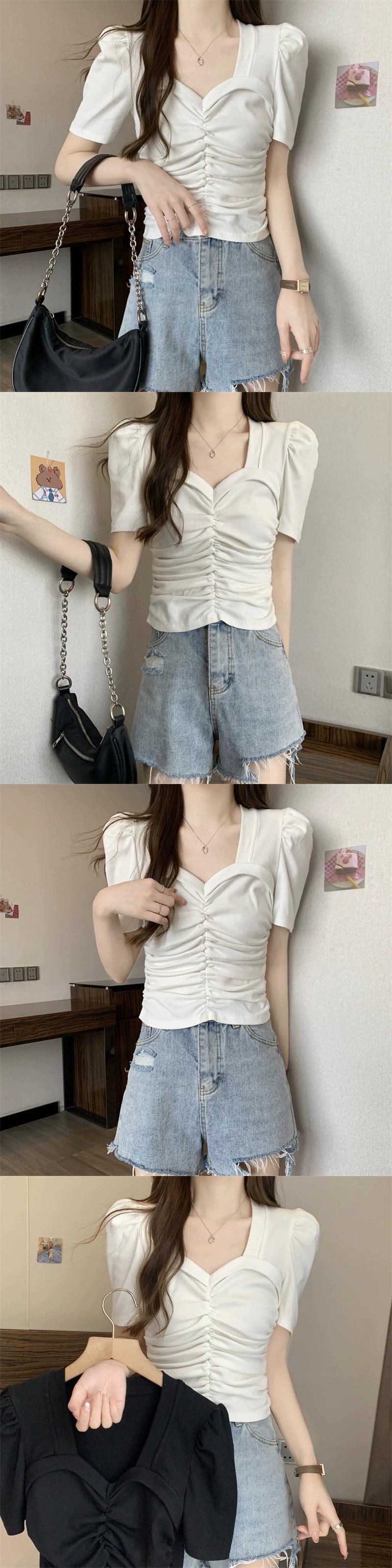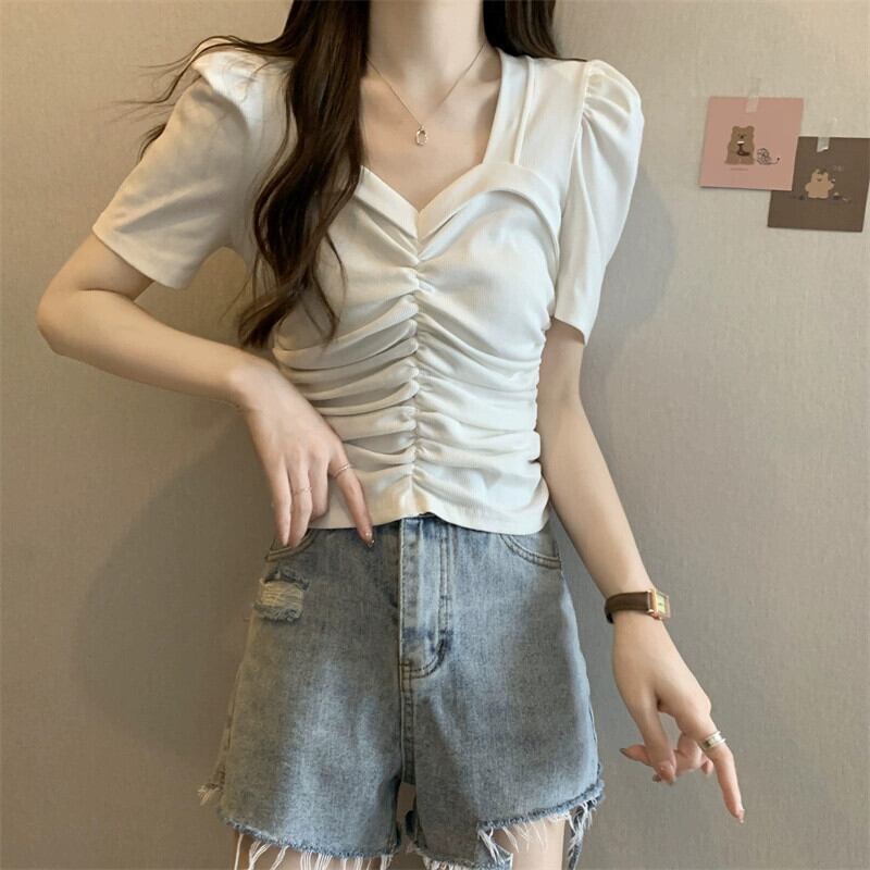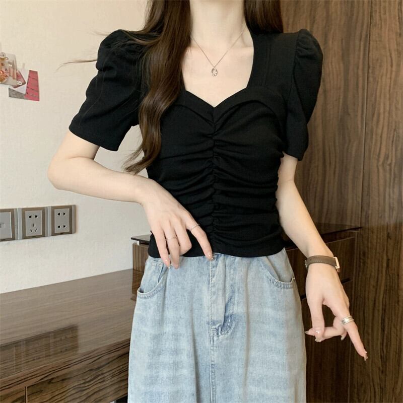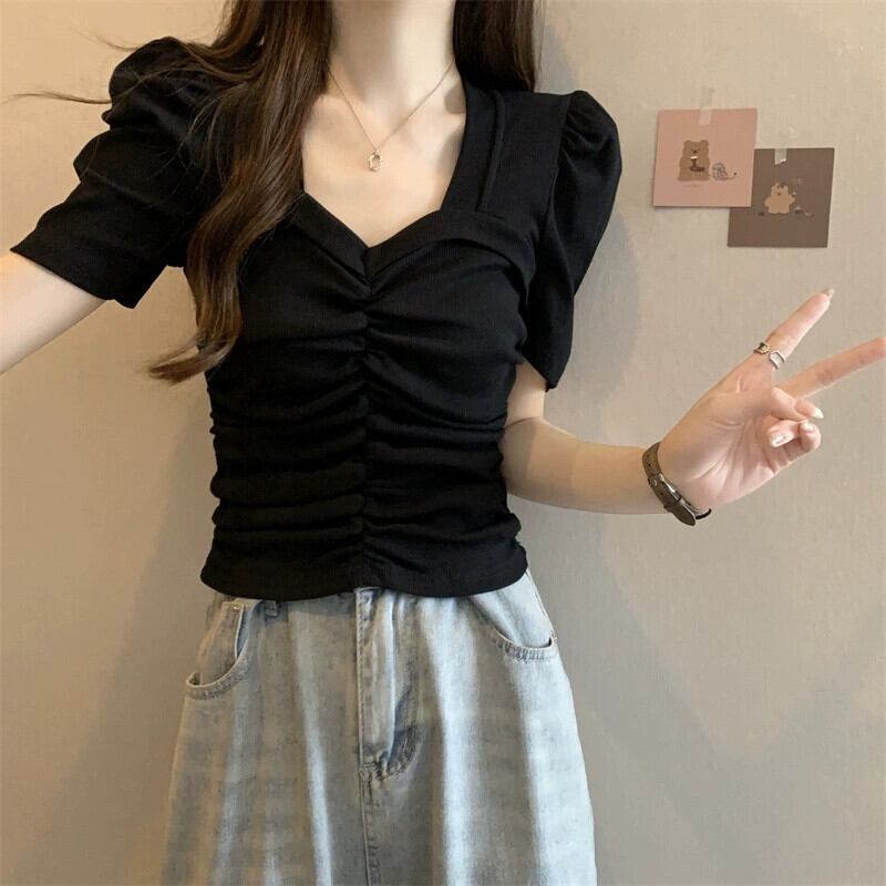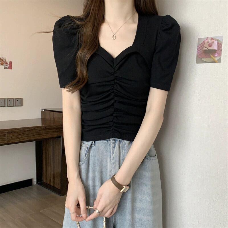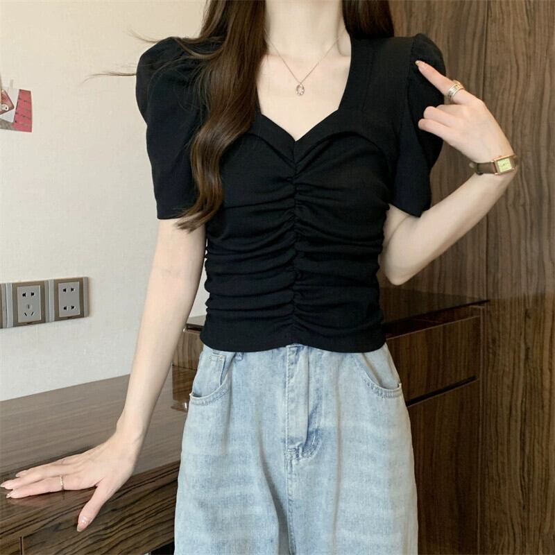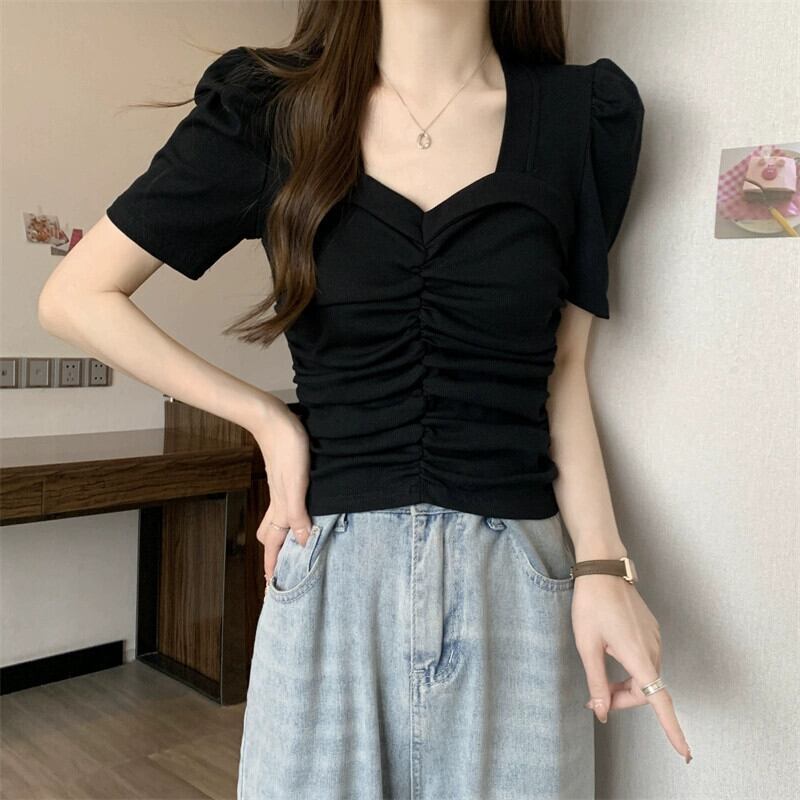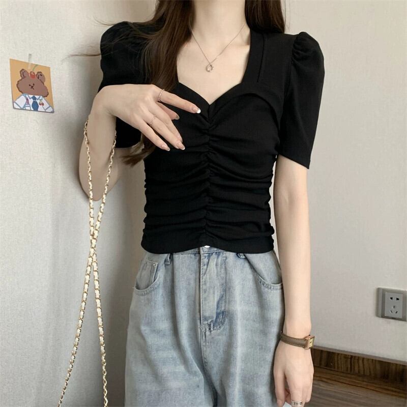 黒のローネック半袖 T シャツ レディース 夏ニッチ デザイン スリム フィット オールマッチ ハイウエスト ショート プリーツ トップ イン ハイウェスト ブラック サマー 夏物 Tシャツ 746004059141663 | framboise21